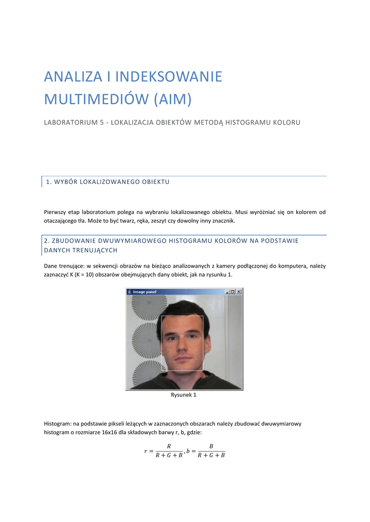 ANALIZA I INDEKSOWANIE MULTIMEDIÓW (AIM) LABORATORIUM 5 - LOKALIZACJA OBIEKTÓW METODĄ HISTOGRAMU KOLORU 1. WYBÓR LOKALIZOWANEGO OBIEKTU Pierwszy etap laboratorium polega na wybraniu lokalizowanego obiektu. Musi wyróżniać się on kolorem od otaczającego tła. Może to być twarz, ręka, zeszyt czy dowolny inny znacznik. 2. ZBUDOWANIE DWUWYMIAROWEGO HISTOGRAMU KOLORÓW NA PODSTAWIE DANYCH TRENUJĄCYCH Dane trenujące: w sekwencji obrazów na bieżąco analizowanych z kamery podłączonej do komputera, należy zaznaczyć K (K = 10) obszarów obejmujących dany obiekt, jak na rysunku 1. Rysunek 1 Histogram: na podstawie pikseli leżących w zaznaczonych obszarach należy zbudować dwuwymiarowy histogram o rozmiarze 16x16 dla składowych barwy r, b, gdzie: natomiast indeksy w histogramie, jak to pokazano na rysunku 2, określone są jako i r=min(15, r*16), ib=min(15, b*16), ir i ib zredukowane do przedziału 0..15. Rysunek 2: Histogram kolorów. Dla każdego piksela Nk należącego do zaznaczonych K obszarów, należy kolejno inkrementować wartości w komórkach histogramu L[ir, ib] o odpowiadającym im kolorze. Następnie histogram powinien zostać znormalizowany tak, aby suma komórek dawała 1. W tym celu wartości wszystkich komórek L[ir, ib] należy podzielić przez łączną sumę pikseli we wszystkich zaznaczonych obszarach. Ustalić próg YT określający wartość odcięcia pikseli obiektu, np. jako wartość średnia komórek histogramu pomnożona przez wybrany współczynnik (można eksperymentować z progiem). 3. GRAFICZNE PRZEDSTAWIENIE ZAWARTOŚCI HISTOGRAMU Należy umożliwić graficzne wyświetlenie zawartości histogramu (na przykład jako obraz 2D w odcieniach szarości) w oknie aplikacji. 4. LOKALIZACJA OBIEKTU PRZY POMOCY HISTOGRAMU KOLORU W każdej klatce obrazu kamery należy zaetykietować piksele mające kolor odpowiadający kolorowi obiektu przy pomocy uzyskanego histogramu. Efekt ten można uzyskać poprzez algorytm iteracyjny (jak poniżej) lub rozrostowy, tak jak było to opisane na wykładzie. Krok 1) Zbudować obraz binarny B(x, y) badanego zdjęcia: najpierw zbudować obraz w odcieniach szarości, przypisując każdemu pikselowi luminancję Y(x, y), uzyskaną jako wartość komórki histogramu odpowiadającą kolorowi piksela pomnożoną przez 255, a następnie przypisać temu pikselowi wartość 1 jeżeli Y(x,y) jest większe od progu YT, albo wartość 0 w przeciwnym przypadku, czyli: ir(x,y) = min(15, r(x, y)*16); ib(x,y) = min(15, b(x,y)*16); ir i ib zredukowane do przedziału 0..15. Y(x,y) = L[ir(x,y), ib(x,y)]*255; If (Y(x,y) > YT) B(x, y)=1; else B(x, y)=0; gdzie x,y oznaczają indeksy przeglądania obrazu w kierunku poziomym i pionowym, piksele zaznaczone jako jeden traktujemy jako „czarne”, a piksele zaznaczone jako 0 są pikselami tła („białe”). Krok 2) Znaleźć spójne przestrzennie obszary pikseli w utworzonym obrazie binarnym. Można to zrobić za pomocą przedstawionego poniżej algorytmu. Algorytm ten przypisuje etykiety pikselom w ten sposób, aby piksele należące do tych samych obszarów miały te same etykiety. Zaznaczyć na oryginalnym obrazie obszary odpowiadające zlokalizowanym obiektom. Narysować prostokąty obejmujące poszczególne obszary o tych samych etykietach. 5. ETYKIETOWANIE OBSZARÓW SPÓJNYCH OBRAZU BINARNEGO (KROK 2 POWYŻEJ) W pierwszej kolejności należy przypisać pikselom „czarnym” (obraz binarny utworzony w pierwszym kroku) etykiety, w ten sposób, aby kolejne wykryte obszary spójne miały inne etykiety, zaczynając od wartości minimalnej do maksymalnej. W tym celu należy przeglądać obraz wierszami od lewej do prawej i od góry do dołu, i jeżeli: - dla piksela czarnego w sąsiedztwie pikseli wcześniej przeglądanych, pokazanych na rysunku 3, występuje piksel zaetykietowany, to przypisać etykietę piksela z sąsiedztwa mającą minimalną wartość; - w przeciwnym przypadku przypisać wartość większą o jeden od największej użytej dotychczas etykiety – wartość etykiety maksymalnej musi być pamiętana. Rysunek 3. Sąsiedztwo pikseli wcześniej przeglądanych. Piksel bieżący zaznaczony kolorem czerwonym, piksele sąsiednie szarym. Na tym etapie może wystąpić połączenie obszarów o innych etykietach. Aby zniwelować ten efekt, należy przeprowadzić następny etap etykietowania – iteracyjnej zmiany etykiet. Należy przeglądać obraz od lewej do prawej i z góry do dołu. Dla każdego piksela czarnego badać sąsiedztwo 8 przyległych pikseli przedstawione na rysunku 4. Jeżeli w tym sąsiedztwie występuje piksel czarny o niższej etykiecie to przypisać najniższą etykietę z tego sąsiedztwa pikselowi bieżącemu. Powtarzać iteracyjnie procedurę przeglądania obrazu dotąd, aż w całej iteracji przeglądania obrazu żadna etykieta nie będzie zmieniona. W efekcie powinny powstać spójne obszary, w których czarne piksele przyległe mają jednakowe etykiety, natomiast rozłączne obszary mają inne etykiety. Przy implementacji powyższych algorytmów należy pamiętać o odpowiednim traktowaniu pikseli brzegowych (nie maja one wszystkich sąsiadów). Rysunek 4. Sąsiedztwo pikseli przyległych. Piksel bieżący zaznaczony kolorem czerwonym, piksele sąsiednie szarym. 6. UWAGI DO ZAŁĄCZONEJ APLIKACJI (KAMERA) Załączona do treści laboratorium aplikacja pozwala na wykorzystanie kamery podłączonej do komputera. Jednocześnie dostarcza kilku narzędzi przydatnych w czasie wykonywania laboratorium. Do poprawnej kompilacji programu wymagane jest Visual Studio w wersji minimum 2010 (dostępne w Dreamspark). W przypadku korzystania z Visual Studio w wersji 2013 proszę pamiętać, że musi być doinstalowany pakiet multibyte character set (MBCS), można go zawsze doinstalować ze strony producenta. Program nie będzie działał dla wersji Express ze względu na brak MFC przy pomocy którego stworzone jest środowisko graficzne aplikacji! Po wczytaniu aplikacji w ś