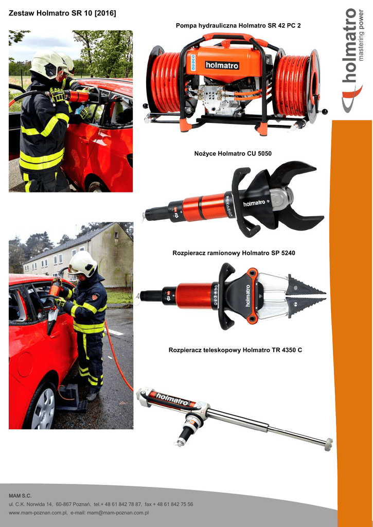 Zestaw Holmatro SR 10 [2016] Pompa hydrauliczna Holmatro SR 42 PC 2 Nożyce Holmatro CU 5050 Rozpieracz ramionowy Holmatro SP 5240 Rozpieracz teleskopowy Holmatro TR 4350 C MAM S.C. ul. C.K. Norwida 14, 60-867 Poznań, tel.+ 48 61 842 78 87, fax + 48 61 842 75 56 www.mam-poznan.com.pl, e-mail: [email protected] Dane techniczne Pompa hydrauliczna Holmatro SR 42 PC 2 model układ hydrauliczny numer katalogowy maksymalne ciśnienie robocze klasyfikacja wg EN 13204 liczba narzędzi silnik moc silnika pojemność zbiornika paliwa praca na pełnym zbiorniku paliwa typ pompy hydraulicznej pojemność zbiornika oleju (efektywna) wydajność 1 stopnia (0-150 bar) wydajność 2 stopnia (150-280 bar) wydajność 3 stopnia (280-720 bar) długość węża masa pompy gotowej do pracy zakres temperatur pracy poziom hałasu wymiary długość węży korby zwijadeł składane SR 42 PC 2 Core™ 150.152.721 720 bar / 72 MPa MTO 2 4-suwowy Honda 5,5 KM / 4,1 kW 3100 cm3 3,5 godziny trzystopniowa osiowa 6000 cm3 2 x 2900 cm3 2 x 1300 cm3 2 x 550 cm3 66,4 kg -200C + 550C 84 dB 866 x 552 x 507 mm 2 x 20 m Nożyce Holmatro CU 5050 model układ hydrauliczny numer katalogowy maksymalne ciśnienie robocze maksymalne rozwarcie ostrzy maksymalna siła cięcia w zagłębieniu maksymalny pręt okrągły (w zagłębieniu) wbudowane oświetlenie / śruba i-Bolt zakres temperatur pracy ciężar narzędzia gotowego do pracy wymiary (dł. x szer. x wys.) pojemność oleju (efektywna) EN 13204 CU 5050 Core™ 150.012.277 720 bar 182 mm 1412 kN / 144 t 182 mm +/+ -20oC +55oC 15,9 kg 773 x 278 x 193 mm 290 cm3 BC165H-15.9 Rozpieracz ramionowy Holmatro SP 5240 model układ hydrauliczny numer katalogowy maksymalne ciśnienie robocze maksymalne rozparcie maksymalna siła rozpierania przy otwartych ramionach minimalna siła rozpierania przy zamkniętych ramionach (25 mm od końcówek) maksymalna sił ściskania maksymalna dł. ciągnięcia maksymalna siła ciągnięcia zakres temperatur pracy ciężar narzędzia gotowego do pracy wymiary (dł. x szer. x wys.) Pojemność oleju (efektywna) EN 13204 Rozpieracz kolumnowy teleskopowy Holmatro TR 4350 C model system numer katalogowy maksymalne ciśnienie robocze maksymalna siła rozpierania 1-go tłoka maksymalna siła rozpierania 2-go tłoka skok 1-go tłoka skok 2-go tłoka skok całkowity maksymalna długość wraz z głowicami długość zsuniętego rozpieracza wraz z głowicami zakres temperatur pracy ciężar narzędzia gotowego do pracy wymiary (dł. x szer. x wys.) pojemność oleju (efektywna) EN 13204 MAM S.C. ul. C.K. Norwida 14, 60-867 Poznań, tel.+ 48 61 842 78 87, fax + 48 61 842 75 56 www.mam-poznan.com.pl, e-mail: [email protected] SP 5240 Core™ 150.012.273 720 bar 725 mm 280 kN / 28,6 t 41 kN / 4,4 t 59 kN / 6 t 610 mm 47 kN / 4,8 t -200C + 550C 14,9 kg 836 x 286 x 218 mm 226 cm3 AS41/725-14.9 TR 4350 C Core™ 150.032.040 720 bar 217 kN / 22,1 t 81 kN / 8,3 t 388 mm 354 mm 742 mm 1275 mm 533 mm -20oC +55oC 17,4 kg 533 x 133 x 350 mm 1207 cm3 TR217/388-81/354-17.4