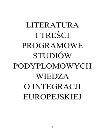 LITERATURA I TREŚCI PROGRAMOWE STUDIÓW PODYPLOMOWYCH WIEDZA O INTEGRACJI EUROPEJSKIEJ 1 WNS, Instytut Filozofii Studia Podyplomowe: Wiedza o integracji europejskiej Nazwa przedmiotu Filozoficzne aspekty tożsamości europejskiej Kod Sokratesa Semestr: Status przedmiotu (nie wypełniać) I obowiązkowy Liczba punktów ECTS Liczba godzin Forma zaliczenia Zaliczenie Ogółem Wykład Ćwiczenia 15 15 Opis przedmiotu Po wejściu do Unii Europejskiej ważnym zagadnieniem stało się hasło tożsamości europejskiej. Otwarte pozostaje pytanie co stanowi istotę tożsamości europejskiej, jakie wspólne Europejczykom elementy ją tworzą. Najczęściej wskazuje się na dziedzictwo kulturowe, grecko-rzymski antyk, chrześcijańskie tradycje, wspólne losy historyczne oraz wartości związane z demokracją, wolnością, prawami człowieka. Przyszłość Europy w dużym stopniu zależy od stopnia utożsamiania się z nią jej obywateli i narodów. Dlatego tak ważny jest namysł nad tożsamością europejską i czynnikami wpływającymi na jej tworzenie. Cele: Zdobycie wiedzy dotyczącej tożsamości europejskiej. Metody nauczania: Wykład Zalecana wiedza: Zagadnienie tożsamości europejskiej. Tożsamość narodowa. Czynniki kształtujące tożsamość europejską. Wspólne wartości podzielane przez Europejczyków. Tożsamość europejska a tożsamość polska. Koncepcje integracji europejskiej. Literatura podstawowa: F. Gołembski (red): Tożsamość europejska. Duchowy fundament integracji naszego kontynentu. Warszawa 2005. A. Sosnowski: Tożsamość regionalne, narodowa, europejska. Olsztyn 2008. J. Wahl: Kultura i tożsamość europejska. Gliwice 2001. Jan Paweł II: Pamięć i tożsamość. Rozmowy na przełomie tysiącleci. Kraków 2005. T. Guz, R. Mazurkiewicz, R. Tłuczek (red): Tożsamość narodowa i suwerenność państwa a integracja europejska. Lublin 2008. Uwagi: 2 WNS, Instytut Filozofii Studia Podyplomowe: Wiedza o integracji europejskiej Nazwa przedmiotu: Historia Unii Europejskiej Kod Sokratesa (nie wypełniać) Liczba punktów ECTS Semestr: I Liczba godzin Ogółem Wykład Ćwiczenia 15 15 Status przedmiotu obowiązkowy Forma zaliczenia Zaliczenie Opis przedmiotu : 1. Pojęcie integracji międzynarodowych. Aspekty i dziedziny integracji. 2. Wybrane przykłady integracji międzynarodowych w świecie od starożytności po współczesność. 3. Idee i koncepcje integracji w Europie w XIX i XX wieku. 4. Problemy i koncepcje integracji w Europie po II wojnie światowej. 5. Historia powstania trzech Wspólnot Europejskich. 6. Etapy rozszerzania Wspólnot o nowe państwa. 7. Powstanie Unii Europejskiej i jej rozwój. 8. Międzynarodowa pozycja Unii Europejskiej. Cele: Przedstawienie integracji międzynarodowych i mechanizmów ich tworzenia. Pokazanie roli integracji w stosunkach międzynarodowych. Zapoznanie z historia integracji w Europie, a zwłaszcza z historią Wspólnot i Unii Europejskiej. Metody nauczania: Wykład Zalecana wiedza: Znajomość historii powszechnej XX wieku. Literatura podstawowa: 1. K. Łastawski - Historia integracji Europejskiej. Toruń 2006 rok. 2. Integracja europejska – red. A. Marszałek. Łódź 2002 i następne wydania. 3. N. William, S. Trevor – Zrozumieć Unię Europejską. Warszawa 2002 rok Uwagi: 3 WNS, Instytut Filozofii Studia Podyplomowe: Wiedza o integracji europejskiej Nazwa przedmiotu : Instytucje UE i prawo wspólnotowe Kod Sokratesa (nie wypełniać) Liczba punktów ECTS Semestr: I Liczba godzin Ogółem Wykład Ćwiczenia 15 15 Status przedmiotu obowiązkowy Forma zaliczenia Zaliczenie Opis przedmiotu: 1. Pojęcie prawa europejskiego oraz prawa Wspólnot. 2. Prawo pierwotne Unii Europejskiej. Przedstawienie treści podstawowych traktatów. 3. Prawo wtórne Unii Europejskiej i jego elementy składowe. 4. Prawo wtórne Unii Europejskiej po wejściu w życie Traktatu Lizbońskiego. 5. Kompetencje prawodawcze organów Unii przed i po wejściu w życie Traktatu Lizbońskiego. 6. Procedury stanowienia prawa wtórnego do 2009 roku i po 1 grudnia 2009 roku. 7. Zasady stosowania prawa Unii Europejskiej. 8. Główne zasady prawa Unii Europejskiej. 9. Umowy międzynarodowe Unii a prawo wtórne. Cele: Zapoznanie z podstawowymi traktatami Unii Europejskiej oraz z pojęciem i procedurami tworzenia prawa wtórnego Unii Europejskiej. Metody nauczania: Wykład i analiza treści unijnych traktatów. Zalecana wiedza: Znajomość struktury instytucjonalnej Unii Europejskiej i kompetencji jej głównych organów. Literatura podstawowa: 1. Z. Doliwa-Klepacki – Integracja europejska. Białystok 2002 i następne wydania. 2. D. Lasok - Zarys prawa Unii Europejskiej. Warszawa 1998 i następne wydania. 3. Dokumenty europejskie. Lublin 2008 r 4. Prawo Unii Europejskiej. Warszawa 2003 i nast. wydania Uwagi: 4 Studia podyplomowe: Wiedza o integracji europejskiej. Przedmiot: Europeistyka praktyczna: Racjonalność kultury europejskiej Ilość godzin:10. Forma zaliczenia: zaliczenie Program: I. Rozum i racjonalność jako jeden z filarów Europy a) racjonalność kulturowa- przykład Europy II. Historyczne przemiany racjonalności kulturowej- przemiany rozumności w tradycji europejskiej a) starożytność i średniowiecze b) przełom nowożytny c) perspektywa ponowoczesności III. Główne elementy racjonalności nowoczesnej w tradycji europejskiej- różne obszary występowania a) nauka i technika jako wzorce racjonalności b) racjonalność ekonomiczna c) polityka jako dziedzina realizacji celów społecznych d) rozum instrumentalny i jego krytyka w tradycji europejskiej e) ograniczenia i aktualność programu Oświecenia IV. Europa wobec wyzwań globalizacji a) postmodernistyczna krytyka rozumu b) aktualność europejskich wzorców racjonalności c) europejska perspektywa społeczeństwa informacyjnego d) idea zrównoważonego rozwoju w wymiarze europejskim 5 WNS, Instytut Filozofii Studia Podyplomowe: Wiedza o integracji europejskiej Nazwa przedmiotu Standardy