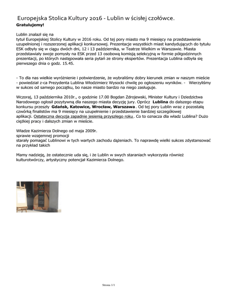 Europejska Stolica Kultury 2016 - Lublin w ścisłej czołówce. Gratulujemy! Lublin znalazł się na tytuł Europejskiej Stolicy Kultury w 2016 roku. Od tej pory miasto ma 9 miesięcy na przedstawienie uzupełnionej i rozszerzonej aplikacji konkursowej. Prezentacje wszystkich miast kandydujących do tytułu ESK odbyły się w ciągu dwóch dni, 12 i 13 października, w Teatrze Wielkim w Warszawie. Miasta przedstawiały swoje pomysły na ESK przed 13 osobową komisją selekcyjną w formie półgodzinnych prezentacji, po których następowała seria pytań ze strony ekspertów. Prezentacja Lublina odbyła się pierwszego dnia o godz. 15.45. - To dla nas wielkie wyróżnienie i potwierdzenie, że wybraliśmy dobry kierunek zmian w naszym mieście - powiedział z-ca Prezydenta Lublina Włodzimierz Wysocki chwilę po ogłoszeniu wyników. - Wierzyliśmy w sukces od samego początku, bo nasze miasto bardzo na niego zasługuje. Wczoraj, 13 października 2010r., o godzinie 17.00 Bogdan Zdrojewski, Minister Kultury i Dziedzictwa Narodowego ogłosił pozytywną dla naszego miasta decyzję jury. Oprócz Lublina do dalszego etapu konkursu przeszły Gdańsk, Katowice, Wrocław, Warszawa . Od tej pory Lublin wraz z pozostałą czwórką finalistów ma 9 miesięcy na uzupełnienie i przedstawienie bardziej szczegółowej aplikacji. Ostateczna decyzja zapadnie jesienią przyszłego roku . Co to oznacza dla władz Lublina? Dużo ciężkiej pracy i dalszych zmian w mieście. Władze Kazimierza Dolnego od maja 2009r. sprawie wzajemnej promocji starały pomagać Lublinowi w tych wartych zachodu dążeniach. To naprawdę wielki sukces zdystansować na przykład takich Mamy nadzieję, że ostatecznie uda się, i że Lublin w swych staraniach wykorzysta również kulturotwórczy, artystyczny potencjał Kazimierza Dolnego. Strona 1/1 Powered by TCPDF (www.tcpdf.org)