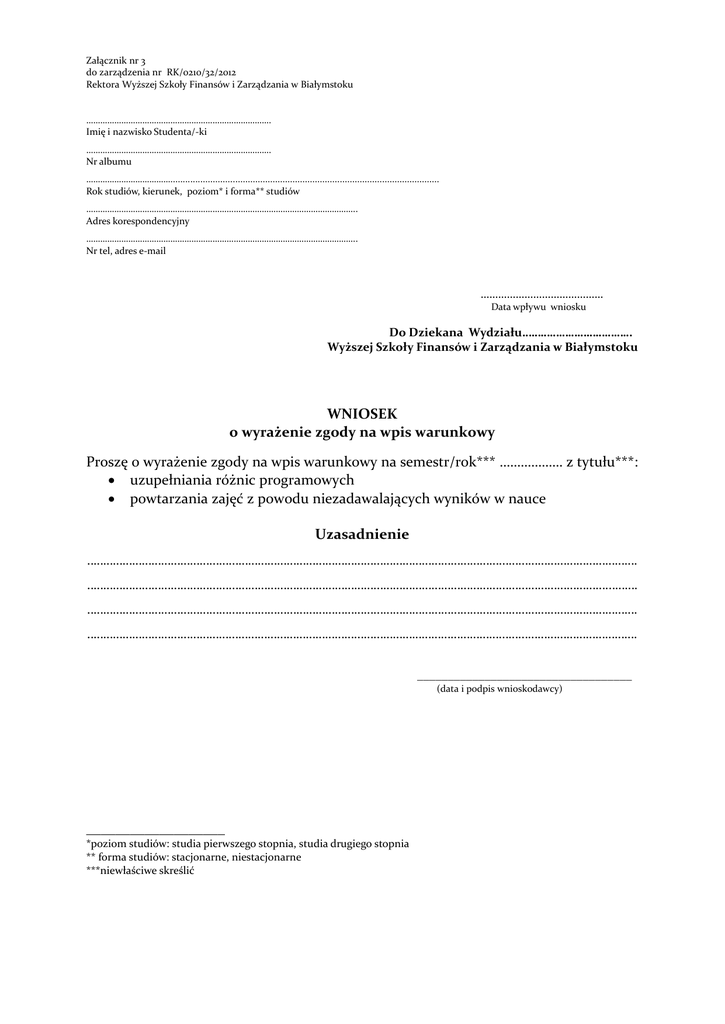 Załącznik nr 3 do zarządzenia nr RK/0210/32/2012 Rektora Wyższej Szkoły Finansów i Zarządzania w Białymstoku ……………………………………………………………………. Imię i nazwisko Studenta/-ki ……………………………………………………………………. Nr albumu ………………………………............................................................................................................ Rok studiów, kierunek, poziom* i forma** studiów …………………………………………………………………………………………………….. Adres korespondencyjny …………………………………………………………………………………………………….. Nr tel, adres e-mail …………………………………… Data wpływu wniosku Do Dziekana Wydziału……………………………… Wyższej Szkoły Finansów i Zarządzania w Białymstoku WNIOSEK o wyrażenie zgody na wpis warunkowy Proszę o wyrażenie zgody na wpis warunkowy na semestr/rok*** ……………… z tytułu***:  uzupełniania różnic programowych  powtarzania zajęć z powodu niezadawalających wyników w nauce Uzasadnienie ……………………………………………………………………………………………………………………………………………………… ……………………………………………………………………………………………………………………………………………………… ……………………………………………………………………………………………………………………………………………………… ……………………………………………………………………………………………………………………………………………………… ___________________________________ (data i podpis wnioskodawcy) ___________________ *poziom studiów: studia pierwszego stopnia, studia drugiego stopnia ** forma studiów: stacjonarne, niestacjonarne ***niewłaściwe skreślić