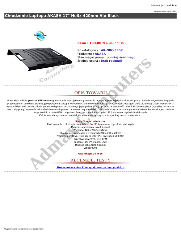 Informacje o produkcie Utworzono 03-03-2017 Chłodzenie Laptopa AKASA 17" Helix 420mm Alu Black Cena : 199,00 zł (netto: 161,79 zł) pu te r s Nr katalogowy : AK-NBC-33BK Producent : AKASA Stan magazynowy : poniżej średniego Średnia ocena : brak recenzji C om Akasa Helix 420 Supersize Edition to ergonomicznie zaprojektowany cooler do laptopa zapewniający komfortową pracę. Posiada wygodne uchwyty do przenoszenia i podkładki stabilizujące położenie laptopa. Wykonany z aluminium wspomaga właściwości chłodzące. Ultra cichy duży 20cm wentylator z wyłącznikiem efektywnie chłodzi podstawę laptopa, co zapobiega jego głośnej pracy i przedłuża żywotność baterii. Duży wentylator (z przełącznikiem na dwa tryby pracy) zapewnia odpowiedni nadmuch powietrza nawet przy niewielkich obrotach, dzięki czemu nie generuje hałasu. Podstawka jest zasilana bezpośrednio z portu USB komputera. Przeznaczona dla laptopów 17? (panoramicznych) lub większych. Całość została wykonana z największą starannością przy użyciu wysokiej jakości materiałów. Ad m ax Specyfikacja techniczna: Zastosowanie: chłodzenie do notebooków 17? (panoramicznych) lub większych Materiał: aluminiowy przedni panel Wymiary: 420 x 296.5 x 54mm Chłodzenie: wentylator o wymiarach 200 x 200 x 20mm Prędkość obrotowa: High speed 800 RPM, low speed 500 RPM Przepływ powietrza: 63.7 CFM Zasilanie: DC 5V (z portu USB) Długość kabla USB: 600mm Waga: 980g Wygenerowano w programie www.oscGold.com Gwarancja: 24 m-ce kod1003 Strona producenta - Przeczytaj recenzje tego produktu