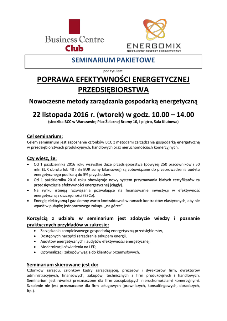SEMINARIUM PAKIETOWE pod tytułem: POPRAWA EFEKTYWNOŚCI ENERGETYCZNEJ PRZEDSIĘBIORSTWA Nowoczesne metody zarządzania gospodarką energetyczną 22 listopada 2016 r. (wtorek) w godz. 10.00 – 14.00 (siedziba BCC w Warszawie; Plac Żelaznej Bramy 10, I piętro, Sala Klubowa) Cel seminarium: Celem seminarium jest zapoznanie członków BCC z metodami zarządzania gospodarką energetyczną w przedsiębiorstwach produkcyjnych, handlowych oraz nieruchomościach komercyjnych. Czy wiesz, że: Od 1 października 2016 roku wszystkie duże przedsiębiorstwa (powyżej 250 pracowników i 50 mln EUR obrotu lub 43 mln EUR sumy bilansowej) są zobowiązane do przeprowadzenia audytu energetycznego pod karą do 5% przychodów. Od 1 października 2016 roku obowiązuje nowy system przyznawania białych certyfikatów za przedsięwzięcia efektywności energetycznej (ciągły). Na rynku istnieją rozwiązania pozwalające na finansowanie inwestycji w efektywność energetyczną z oszczędności (ESCo). Energię elektryczną i gaz ziemny warto kontraktować w ramach kontraktów elastycznych, aby nie wpaść w pułapkę jednorazowego zakupu „na górce”. Korzyścią z udziału w seminarium jest zdobycie wiedzy i poznanie praktycznych przykładów w zakresie: Zarządzania kompleksowego gospodarką energetyczną przedsiębiorstw, Dostępnych narzędzi zarządzania zakupem energii, Audytów energetycznych i audytów efektywności energetycznej, Modernizacji oświetlenia na LED, Optymalizacji zakupów węgla do klientów przemysłowych. Seminarium skierowane jest do: Członków zarządu, członków kadry zarządzającej, prezesów i dyrektorów firm, dyrektorów administracyjnych, finansowych, zakupów, technicznych z firm produkcyjnych i handlowych. Seminarium jest również przeznaczone dla firm zarządzających nieruchomościami komercyjnymi. Szkolenie nie jest przeznaczone dla firm usługowych (prawniczych, konsultingowych, doradczych, itp.). Seminarium poprowadzą: Michał Suska Prezes Zarządu [email protected] Michał Suska jest Prezesem Zarządu Energomix Sp. z o.o. Od 2014 roku pełni funkcję eksperta Business Centre Club ds. efektywności energetycznej. Jest również Prezesem Zarządu Polskiego Stowarzyszenia Doradztwa Energetycznego oraz członkiem Polskiego Komitetu Światowej Rady Energetycznej (World Energy Council). Wcześniej zdobywał doświadczenie w irlandzkim funduszu typu private equity, gdzie zajmował się inwestycjami na terenie Europy Środkowo-Wschodniej oraz Turcji. Pracował również w Unicredit MIB oraz EY. Michał jest absolwentem dwóch kierunków w Szkole Głównej Handlowej w Warszawie oraz stypendystą Haskayne School of Business (University of Calgary). Odbył wiele specjalistycznych krajowych i zagranicznych kursów z zakresu efektywnego wykorzystania energii, technik sprzedaży oraz finansów (CFA). Został przyjęty do elitarnego programu Future Energy Leaders' prowadzonego przez Światową Radę Energetyczną. W programie bierze udział tylko 100 młodych, najzdolniejszych liderów z branży energetycznej z całego świata.. Krzysztof Rossa Dyrektor ds. Efektywności Energetycznej [email protected] Zarządza Centrum Efektywności Energetycznej w ramach Energomix Sp. z o.o. Absolwent Politechniki Warszawskiej Kierunku Mechanika i Budowa Maszyn oraz podyplomowo Ciepłownictwo i Ogrzewnictwo z Auditingiem Energetycznym. Ukończył studia podyplomowe Marketingu i Zarządzania w Szkole Głównej Handlowej w Warszawie. Wieloletni pracownik operatora jednego z największych systemów ciepłowniczych w Europie - Veolia Energia, gdzie w centrum badawczo-rozwojowym zajmował się poprawą efektywności wykorzystania energii w źródłach ciepła, sieciach przesyłowych i u odbiorców końcowych. Członek wielu polskich i międzynarodowych zespołów projektowych zajmujących się poprawą efektywności wykorzystania energii. Odbył wiele specjalistycznych kursów z zakresu audytingu energetycznego i zarządzania.. Grzegorz Chabior Dyrektor ds. Oświetlenia LED i OZE [email protected] Zarządza działem związanym z wdrożeniem i upowszechnieniem energooszczędnego oświetlenia z zastosowaniem technologii LED oraz urządzeń i technologii z zakresu OZE Odnawialne Źródła Energii – Fotowoltaika, Turbiny Wiatrowe, Pompy Ciepła. Absolwent Akademii Wychowania Fizycznego, miłośnik ekologii, Członek Polskiego Towarzystwa Fotowoltaiki, Członek Zarządu Towarzystwa Przyjaźni Polsko-Chińskiej. Od 2008 roku z powodzeniem zrealizował inwestycje modernizacji oświetlenia z wykorzystaniem źródeł światła i opraw w technologii LED w obiektach przemysłowych i publicznych. Pomysłodawca Projektu SUO – Systemu Usługi Oświetlenia jako bezinwestycyjnej modernizacji oświetlenia w obiektach Klienta. Dawid Salamądry Dyrektor Działu Analiz Rynku Węgla [email protected] W Energomix pełni funkcję dyrektora Działu Analiz Rynku Węgla. Absolwent Wydziału Prawa i Administracji Uniwersytetu Gdańskiego oraz Wydziału Zarządzania i Ekonomii na Politechnice Gdańskiej, gdzie obronił pracę dyplomową z zakresu handlu węglem na świecie, polskiej branży węgla i struktury cen tego surowca. Ekspert ds. energetyki Centrum Analiz Klubu Jagiellońskiego oraz stały ekspert Parlamentarnego Zespołu Górnictwa i Energii. Zawodowo związany z sektorem węgla i energetyki od 2012 roku. Pracował w Polcoaldex Sp. z o.o., gdzie był odpowiedzialny za marketing i rozwój firmy, a następnie pełnił funkcję dyrektora zarządzającego. Później zatrudniony w WSE InfoEngine S.A. (spółce z Grupy Kapitałowej GPW) jako pełnomocnik zarządu ds. rynku węgla. Założyciel i redaktor naczelny serwisu Polishcoaldaily.com, stały współpracownik Trybuny Górniczej i Biuletynu Górniczego. PROGRAM GODZINA 10.00 - 10.05 10.05 - 11.20 PUNKT PROGRAMU Powitanie uczestników 1. Zarządzanie gospodarką energetyczną przedsiębiorstwa (etapy działania) i outsourcing energetyczny 2. Elastyczne formy