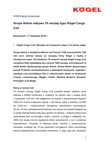 Informacja prasowa Grupa Alainé nabywa 70 naczep typu Kögel Cargo Coil Burtenbach, 17 listopada 2016 r. Kögel Cargo Coil: Naczepa do transportu szpul i rol taśmy ciętej Grupa Alainé z siedzibą w Macon we Francji (1100 pracowników, 230 mln euro obrotu) stawia na naczepy firmy Kögel z myślą o transporcie szpul. Od niedawna 70 nowych naczep Kögel Cargo Coil uzupełnia flotę składającą się z ponad 1000 naczep, wchodzących w skład działu spedycyjnego grupy Alainé. Grupa Alainé dysponująca ponad 70-letnim doświadczeniem w dziedzinie transportu, logistyki i spedycji oraz posiadająca filie w całej Europie działa na terytorium Francji, Luksemburga, Węgier, Polski, Wielkiej Brytanii, Słowacji, Portugalii oraz Belgii. Ramy w wersji Coil 70 nowych naczep Kögel Cargo Coil posiada bardzo stabilną ramę stalową o lekkiej konstrukcji z wnękami na szpule oraz z szyjką ramy o wysokości 120 mm. We wgłębieniu na szpule o standardowej długości 7200 mm można przewozić szpule i role taśmy ciętej o średnicy od 900 do 2100 mm i maksymalnym obciążeniu odcinkowym wynoszącym 30 ton. W celu zabezpieczenia ładunku we wnęce na szpule dostępne są w wersji standardowej dwie pary gniazd na kłonice, z których jedna para usytuowana jest na początku wnęki z przodu, a druga w odległości ok. 2050 mm; służą one do osadzania kłonic wykonanych z rur o przekroju kwadratowym. Ponadto, w stalowej ramie VarioFix z perforowanym obrzeżem znajduje się 13 par pierścieni mocujących, które umożliwiają niemal bezstopniowe mocowanie ładunków. Z tego pięć par pierścieni 1 Informacja prasowa wytrzymuje po 2000 kg na pierścień, a osiem par wytrzymuje po 4000 kg na pierścień w obszarze środka ciężkości ładunku. 16 osłon wnęki na szpule zapewnia jej szybkie i bezpieczne odsłonięcie lub zasłonięcie. Nośność podłoża osłon wnęki na szpule, przystosowanej do przenoszenia wysokich obciążeń osiowych wózków widłowych, wynosi maks. 5460 kg. Dzięki plandece dachowej Kögel Integral w naczepie Cargo Coil przy otwartym dachu do wnętrza przestrzeni ładunkowej nie zwisają pasy, gdyż są one zintegrowane z plandece. W ten sposób pasy nie zahaczą o znajdujący się w środku ładunek. Dodatkowo naczepy Cargo Coil posiadają certyfikat zgodny z DIN EN 12642 Code XL. Wyposażenie niestandardowe dla firmy Alainé Do optymalnego zabezpieczania ładunku, oprócz wyżej wspomnianych dwóch par gniazd na kłonice wtykowe wykonane z rur o przekroju kwadratowym, służy dodatkowych sześć par gniazd, usytuowanych we wnęce na szpule. Aby ułatwić załadunek i rozładunek od góry, naczepa posiada zabudowaną plandekę przesuwaną od przodu i od tyłu. Na życzenie firmy Alainé naczepy wyposażono w cztery pary pierścieni mocujących o wysokiej wytrzymałości i nośności 12 000 kg, umożliwiających pod nadzorem ich transport na statkach i promach. Plandeki naczep posiadają zabezpieczenie przed wandalizmem. Polega ono na wzmocnieniu siatką z linek stalowych o gęstości 160 x 160 mm. Kradzież towaru jest tym samym utrudniona, a nieproszeni pasażerowie nie mogą wejść przez plandekę. Ponadto naczepy są wyposażone w alarm cofania z funkcją wyłączenia na noc. W skład pozostałego wyposażenia specjalnego wchodzą m.in. lina mocująca z uchwytami znajdująca się na ścianie przedniej, dwie pary zderzaków gumowych usytuowanych z tyłu, wtykane kłonice z rur o przekroju kwadratowym, gaśnica itd. Powłoka KTL: trwała ochrona przed korozją 2 Informacja prasowa We wszystkich 70 naczepach Kögel Coil cała rama pojazdu jest chroniona technologią nanoceramiczną oraz powłoką KTL, pokrytą następnie warstwą lakieru UV. Zdjęcie: Kögel Cargo Coil wg zamówienia firmy Alainé Na wszelkie pytania dotyczące niniejszej informacji prasowej odpowiada: inż. dypl. Volker Seitz Dyrektor ds. komunikacji / marketingu i rozwoju Telefon + 49 82 85 88 – 12 3 06 Faks + 49 82 85 88 – 12 4 24 [email protected] Patrick Wanner Rzecznik prasowy Telefon + 49 82 85 88 – 12 3 01 Faks + 49 82 85 88 – 12 2 84 [email protected] Firma Kögel jest jednym z czołowych producentów przyczep w Europie. Od chwili założenia firmy w 1934 r. jej taśmy produkcyjne opuściło ponad 500 000 sztuk pojazdów. Kögel od ponad 80 lat oferuje najwyższej jakości pojazdy użytkowe i rozwiązania na potrzeby firm transportowych i budowlanych, oparte na myśli inżynierskiej „made in Germany”. We wszystkich działaniach firmy najważniejsza była zawsze pasja do transportu i innowacji, z której największe korzyści czerpią klienci z branży transportowej. Siedziba i główny zakład produkcyjny firmy Kögel Trailer GmbH & Co. KG znajdują się w bawarskiej miejscowości Burtenbach. Kögel posiada również zakłady i siedziby w Neu-Ulm (D), Duingen (D), Choceniu (CZ) oraz w Moskwie (RUS). www.koegel.com 3