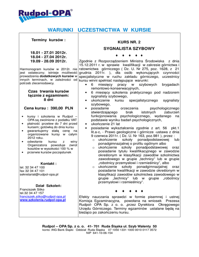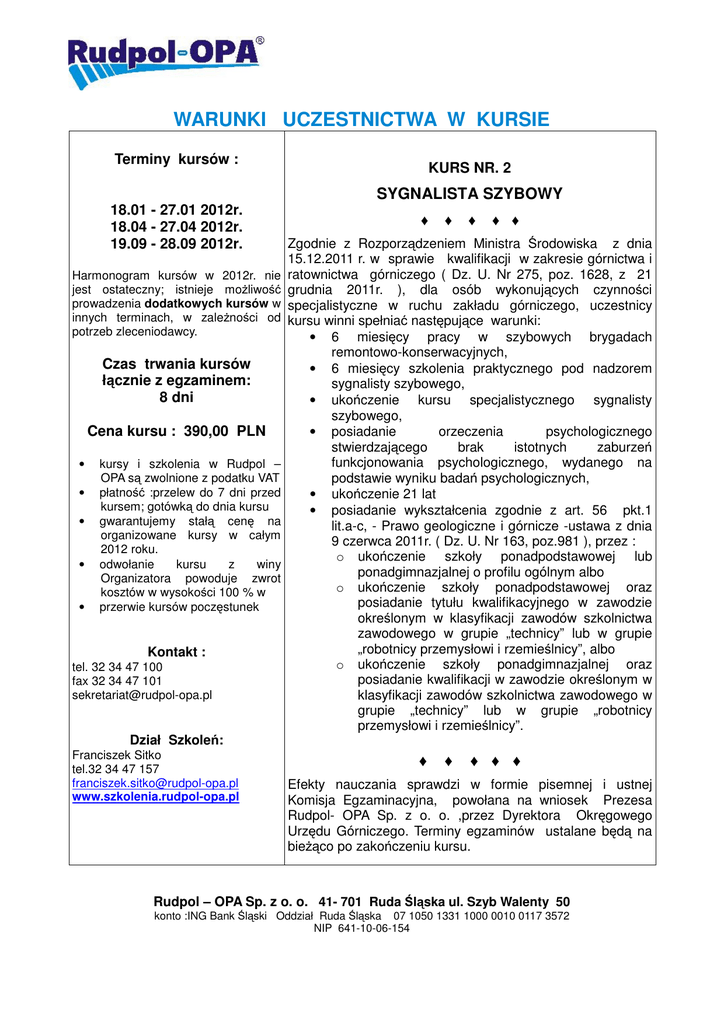 WARUNKI UCZESTNICTWA W KURSIE Terminy kursów : KURS NR. 2 SYGNALISTA SZYBOWY 18.01 - 27.01 2012r. 18.04 - 27.04 2012r. 19.09 - 28.09 2012r. Harmonogram kursów w 2012r. nie jest ostateczny; istnieje możliwość prowadzenia dodatkowych kursów w innych terminach, w zależności od potrzeb zleceniodawcy. Czas trwania kursów łącznie z egzaminem: 8 dni Cena kursu : 390,00 PLN • • • • • kursy i szkolenia w Rudpol – OPA są zwolnione z podatku VAT płatność :przelew do 7 dni przed kursem; gotówką do dnia kursu gwarantujemy stałą cenę na organizowane kursy w całym 2012 roku. odwołanie kursu z winy Organizatora powoduje zwrot kosztów w wysokości 100 % w przerwie kursów poczęstunek Kontakt : tel. 32 34 47 100 fax 32 34 47 101 [email protected] ♦ ♦ ♦ ♦ ♦ Zgodnie z Rozporządzeniem Ministra Środowiska z dnia 15.12.2011 r. w sprawie kwalifikacji w zakresie górnictwa i ratownictwa górniczego ( Dz. U. Nr 275, poz. 1628, z 21 grudnia 2011r. ), dla osób wykonujących czynności specjalistyczne w ruchu zakładu górniczego, uczestnicy kursu winni spełniać następujące warunki: • 6 miesięcy pracy w szybowych brygadach remontowo-konserwacyjnych, • 6 miesięcy szkolenia praktycznego pod nadzorem sygnalisty szybowego, • ukończenie kursu specjalistycznego sygnalisty szybowego, • posiadanie orzeczenia psychologicznego stwierdzającego brak istotnych zaburzeń funkcjonowania psychologicznego, wydanego na podstawie wyniku badań psychologicznych, • ukończenie 21 lat • posiadanie wykształcenia zgodnie z art. 56 pkt.1 lit.a-c, - Prawo geologiczne i górnicze -ustawa z dnia 9 czerwca 2011r. ( Dz. U. Nr 163, poz.981 ), przez : o ukończenie szkoły ponadpodstawowej lub ponadgimnazjalnej o profilu ogólnym albo o ukończenie szkoły ponadpodstawowej oraz posiadanie tytułu kwalifikacyjnego w zawodzie określonym w klasyfikacji zawodów szkolnictwa zawodowego w grupie „technicy” lub w grupie „robotnicy przemysłowi i rzemieślnicy”, albo o ukończenie szkoły ponadgimnazjalnej oraz posiadanie kwalifikacji w zawodzie określonym w klasyfikacji zawodów szkolnictwa zawodowego w grupie „technicy” lub w grupie „robotnicy przemysłowi i rzemieślnicy”. Dział Szkoleń: Franciszek Sitko tel.32 34 47 157 [email protected] www.szkolenia.rudpol-opa.pl ♦ ♦ ♦ ♦ ♦ Efekty nauczania sprawdzi w formie pisemnej i ustnej Komisja Egzaminacyjna, powołana na wniosek Prezesa Rudpol- OPA Sp. z o. o. ,przez Dyrektora Okręgowego Urzędu Górniczego. Terminy egzaminów ustalane będą na bieżąco po zakończeniu kursu. Rudpol – OPA Sp. z o. o. 41- 701 Ruda Śląska ul. Szyb Walenty 50 konto :ING Bank Śląski Oddział Ruda Śląska 07 1050 1331 1000 0010 0117 3572 NIP 641-10-06-154