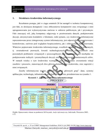 21 października AUDYT SYSTEMÓW INFORMATYCZNYCH 2009 1. Struktura środowiska informatycznego Rezultatem postępu, jaki w ciągu ostatnich 20 lat nastąpił w technice komputerowej, jest fakt, że dzisiejsza dostępność i moc obliczeniowa komputerów oraz związanego z nimi oprogramowania jest wykorzystywana zarówno w sektorze publicznym, jak i prywatnym. Fakt znaczącej roli, jaką komputery odgrywają w przetwarzaniu danych, podejmowaniu decyzji, utrzymywaniu kontaktów z klientami, rodzi pytanie, czy środowisko informatyczne reprezentowane przez zintegrowany system informatyczny, jest odpowiednio zorganizowane i kontrolowane, zarówno pod względem bezpieczeństwa, jak i efektywności funkcjonowania. Właściwe pojmowanie środowiska informatycznego, wszelkich aspektów z nim związanych, tj. uwarunkowań prawnych, kwestii technologicznych, relacji właścicielskich oraz pozostałych problemów związanych z poszczególnymi jego elementami, jest niezbędne do podejmowania trafnych i przemyślanych decyzji oraz do realizowania zamierzonych celów. W ramach wiedzy o tym środowisku wymagane jest odpowiednie zrozumienie relacji zasobów i procesów, stanowiących dwa główne elementy tego środowiska, oraz zagrożeń z nimi związanych. Zasoby informatyczne można podzielić na pięć głównych grup1: dane, systemy aplikacyjne, technologię, infrastrukturę oraz ludzi. Podział ten, przedstawiono na rysunku 1. Rysunek 1 . Zasoby środowiska informatycznego Źródło: Opracowanie własne na podstawie M.Forystek, Audyt informatyczny, InfoAudit, Warszawa 2005, s.35. 1 Forystek M. op.cit., s. 35 za COBIT Management Guidelines, ISACA [cit.2005-10-20], http://www.isaca.org. Mariusz Zarzycki, [email protected] 1 21 października AUDYT SYSTEMÓW INFORMATYCZNYCH 2009 Wymienione na rysunku 18 zasoby poddawane są klasyfikacji ze względu na znaczenie, jakie mają one dla jednostki gospodarczej. W zależności od wagi(znaczenia) określonego zasobu dla organizacji, inny będzie proces zarządzania ryzykiem związanym z tym zasobem. G.Idzikowska2 proponuje wydzielenie czterech grup zasobów: najwyższej wagi(vital), tzn. takich, które są niezastępowalne i jednocześnie niezbędne w każdej chwili, aby jednostka mogła funkcjonować; podstawowe(essential), czyli takie, których strata mogłaby przerwać działanie jednostki; mimo, że jednostka przetrwa, znacznie obniży się poziom jej produktywności; ważne(important), których utrata może spowodować niewygodę, a tylko czasem przerwę w funkcjonowaniu; użyteczne(useful), tzn. takie, które dobrze jest mieć, ale których brak nie stwarza problemów. Z każdym z zasobów środowiska informatycznego wiążą się określone zagrożenia. W kontekście systemów informatycznych zagrożeniami mogą być awarie zasilania, źle nadane uprawnienia do programów i danych, rozprzestrzeniające się wirusy komputerowe, awarie sprzętu, siły natury oraz działania ludzkie. Zależnie od celowości działań zagrożenia kwalifikuje się jako przypadkowe lub celowe. Zagrożenie jest przypadkowe, jeżeli powstało samoczynnie (np. awaria sprzętu) lub nieumyślnie (błąd ludzki, np. roztargnienie, posiadanie niewystarczającej na dany temat wiedzy). Zagrożenia celowe są świadomymi ingerencjami ludzi w sprzęt i/lub oprogramowanie, mającymi na celu zniszczenie, przechwycenie bądź modyfikację systemu informatycznego. Należy tutaj uwzględnić również wszelkie oszustwa komputerowe3. Z uwagi na źródło zagrożenia wyróżnić można zagrożenia:4 zewnętrzne – występujące ze strony osób nieuprawnionych do dostępu lub używania systemu informatycznego jako skutek niedoskonałości systemu zabezpieczeń zewnętrznych; ze strony środowiska naturalnego(trzęsienia ziemi, wyładowania 2 R.P. Fisher., Information Systems Security, Prentice-Hall, Inc., Englewood Cliffs 1983, s. 13-14 w Idzikowska G., op.cit., s. 165. 3 Oszustwa oraz inne akty bezprawne zostaną opisane w dalszej części pracy. 4 Grzywacz J.[red], Bezpieczeństwo systemów informatycznych w bankach w Polsce, SGH, Warszawa 2003, s. 13. Mariusz Zarzycki, [email protected] 2 21 października AUDYT SYSTEMÓW INFORMATYCZNYCH 2009 atmosferyczne itp.) lub jako niebezpieczeństwa związane z otoczeniem, w którym znajduje się komputer(kurz, wilgoć, ogień itp.), wewnętrzne – będące wynikiem działania użytkowników uprawnionych do korzystania z systemu. Biorąc za kryterium rodzaj zagrożenia można wskazać zagrożenia sprzętowe oraz programowe. Przykładową statystykę zagrożeń dla systemów komputerowych przedstawiono na wykresie 1. Wykres 1. Zagrożenia w systemach komputerowych 9% 4% pomyłki ludzi 3% problemy fizyczne 10% nieuczciwy personel 54% 20% niezadowolny personel wirusy ataki z zewnątrz. Źródło: Grzywacz J. [red], Bezpieczeństwo systemów informatycznych w bankach w Polsce, SGH, Warszawa 2003, s. 14. Wobec przedstawionych ogólnie zagrożeń kluczową rolę odgrywa bezpieczeństwo zasobów tworzących model środowiska informatycznego. Pod pojęciem bezpieczeństwa zasobów informatycznych kryje się wiele pojęć, które różnią się pod względem semantycznym i co do których znaczenia odmienne są poglądy różnych autorów 5. G.Idzikowska6 definiuje bezpieczeństwo zasobów jako grupę zadań kierownictwa podmiotu obejmującą dbałość o dokładność i nienaruszalność danych i informacji niezbędnych do zarządzania jednostką, o poufność, tajność i niedostępność danych dla osób nieupoważnionych, o zabezpieczenie zasobów informatycznych przed wypadkami losowymi lub niewłaściwym użyciem, o ustrzeżenie pracowników przed pokusą, a kierownictwa przed nieprzezornością. Drugim, obok zasobów elementem wchodzącym w skład struktury środowiska informatycznego są procesy informatyczne, których zadaniem jest zarządzanie złożonym 5 Idzikowska G., Wiarygodność danych a bezpieczeństwo zasobów w środowisku informatycznym r