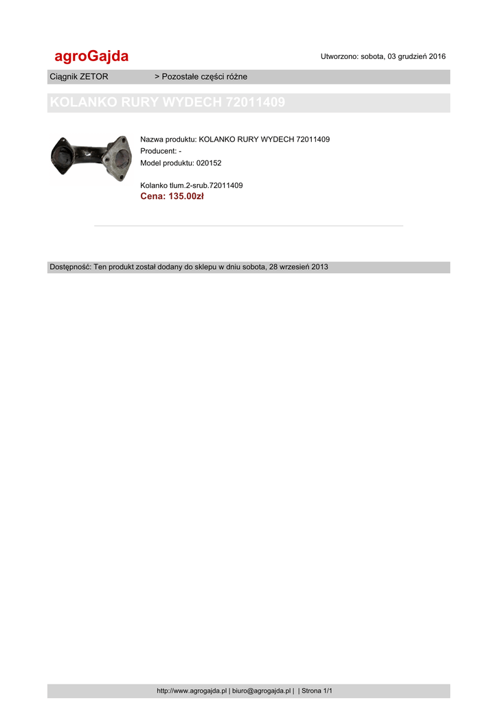 agroGajda Ciągnik ZETOR Utworzono: sobota, 03 grudzień 2016 > Pozostałe części różne KOLANKO RURY WYDECH 72011409 Nazwa produktu: KOLANKO RURY WYDECH 72011409 Producent: Model produktu: 020152 Kolanko tlum.2-srub.72011409 Cena: 135.00zł Dostępność: Ten produkt został dodany do sklepu w dniu sobota, 28 wrzesień 2013 http://www.agrogajda.pl | [email protected] | | Strona 1/1