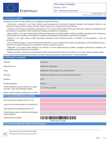 Formularz wniosku Konkurs: 2014 Erasmus+ KA1 - Mobilność edukacyjna Wersja formularza: 1.06 Używana wersja Adobat Reader: 11.007 A. Informacje ogólne Niniejszy formularz wniosku składa się z następujących głównych części: - Informacje o projekcie: w tej części należy podać podstawowe informacje dotyczące projektu, jaki zostanie złożony, oraz Narodowej Agencji, która otrzyma wniosek, dokona jego oceny i zaakceptuje go lub odrzuci; - Instytucja uczestnicząca (instytucje uczestniczące): w tej części należy podać informacje dotyczące instytucji wnioskującej oraz jeśli dotyczy, o wszystkich innych instytucjach będących partnerami w projekcie; - Opis projektu: w tej części należy podać informacje dotyczące wszystkich etapów realizacji projektu: przygotowania, wdrażania i realizacji głównych działań (oznaczających mobilności edukacyjne) oraz działań po zakończeniu projektu; - Budżet: w tej części należy podać informacje dotyczące kwoty dofinansowania ze środków Unii Europejskiej, o jaką się wnioskuje; - Lista kontrolna/Uwaga o ochronie danych/Oświadczenie: w tych częściach formularza wnioskodawca został poinformowany o istotnych warunkach związanych ze złożeniem wniosku o dofinansowanie; - Załączniki: w tej części należy dołączyć do wniosku w formie elektronicznej wszelkie wymagane dokumenty niezbędne do weryfikacji danych zawartych we wniosku; - Złożenie wniosku: w tej części wnioskodawca będzie mógł zatwierdzić informacje podane we wniosku i złożyć wniosek online; W celu poprawnego wypełnienia formularza wniosku należy zapoznać się z dokumentem "e-Forms Guideline". B. Informacje o projekcie Program Erasmus+ Akcja kluczowa Mobilność edukacyjna Akcja Mobilność osób uczących się i pracowników Typ akcji Mobilność studentów i pracowników szkół wyższych Konkurs 2014 Runda selekcyjna Runda 1 Termin złożenia wniosku (dd-mm-rrrr godz/ min/sek - czasu brukselskiego, Belgia) 17-03-2014 12:00:00 Język, w jakim zostanie wypełniony wniosek B.1. Dane identyfikacyjne projektu Data rozpoczęcia projektu (dd-mm-rrrr) Łączny czas trwania projektu (w miesiącach) Data zakończenia projektu (dd-mm-rrrr) Pełna oficjalna nazwa instytucji wnioskującej (znaki łacińskie) Kod kontrolny wniosku 6B2C7363477374B5 B.2. Narodowa Agencja instytucji wnioskującej Kod kontrolny wniosku 6B2C7363477374B5 PL Formularz wniosku nie został jeszcze złożony Strona 1 z 13 Formularz wniosku Konkurs: 2014 Erasmus+ KA1 - Mobilność edukacyjna Wersja formularza: 1.06 Używana wersja Adobat Reader: 11.007 Identyfikator Więcej szczegółowych informacji o Narodowych Agencjach Programu Erasmus+ można znaleźć pod adresem: http://ec.europa.eu/education/erasmus-plus/national-agencies_en.htm Kod kontrolny wniosku 6B2C7363477374B5 PL Formularz wniosku nie został jeszcze złożony Strona 2 z 13 Formularz wniosku Konkurs: 2014 Erasmus+ KA1 - Mobilność edukacyjna Wersja formularza: 1.06 Używana wersja Adobat Reader: 11.007 C. Instytucja uczestnicząca (instytucje uczestniczące) C.1. Instytucja wnioskująca PIC Pełna oficjalna nazwa instytucji (w języku narodowym) Pełna oficjalna nazwa instytucji (znaki łacińskie) Akronim Numer KRS (jeśli dotyczy) lub numer REGON Wydział (jeśli dotyczy) Adres Kraj Region Skrytka pocztowa Kod pocztowy CEDEX (tylko dla Francji) Miejscowość Strona internetowa E-mail Telefon 1 Telefon 2 Faks C.1.1. Profil instytucji Typ instytucji Czy instytucja jest podmiotem prawa publicznego? Czy instytucja jest typu non-profit? C.1.2. Akredytacja Czy przed złożeniem wniosku Państwa instytucja otrzymała akredytację/ceryfikat? Typ akredytacji/certyfikatu Numer akredytacji/ceryfikatu Kod kontrolny wniosku 6B2C7363477374B5 PL Formularz wniosku nie został jeszcze złożony Strona 3 z 13 Formularz wniosku Konkurs: 2014 Erasmus+ KA1 - Mobilność edukacyjna Wersja formularza: 1.06 Używana wersja Adobat Reader: 11.007 C.1.3. Cele i działania instytucji Prosimy krótko przedstawić charakterystykę instytucji w odniesieniu do tematyki projektu. Prosimy opisać działania i doświadczenie instytucji w dziedzinie, której dotyczy projekt. Prosimy opisać obszary specjalizacji i doświadczenie pracowników instytucji w dziedzinie, której dotyczy projekt. Czy instytucja wnioskowała o dofinansowanie lub otrzymała dofinansowanie z jakiegokolwiek programu Unii Europejskiej w okresie 12 miesięcy poprzedzających złożenie tego wniosku? C.1.4. Przedstawiciel prawny Pan/Pani Płeć Imię Nazwisko Wydział/jednostka Stanowisko E-mail Telefon 1 Jeśli adres różni się od adresu instytucji, prosimy zaznaczyć to pole. C.1.5. Osoba kontaktowa Pan/Pani Kod kontrolny wniosku 6B2C7363477374B5 PL Formularz wniosku nie został jeszcze złożony Strona 4 z 13 Formularz wniosku Konkurs: 2014 Erasmus+ KA1 - Mobilność edukacyjna Wersja formularza: 1.06 Używana wersja Adobat Reader: 11.007 Płeć Imię Nazwisko Wydział/jednostka Stanowisko E-mail Telefon 1 Jeśli adres różni się od adresu instytucji, prosimy zaznaczyć to pole. Kod kontrolny wniosku 6B2C7363477374B5 PL Formularz wniosku nie został jeszcze złożony Strona 5 z 13 Formularz wniosku Konkurs: 2014 Erasmus+ KA1 - Mobilność edukacyjna Wersja formularza: 1.06 Używana wersja Adobat Reader: 11.007 D. Główne działania D.1. Szczegółowy opis działań Prosimy wymienić działania związane z planowanymi w projekcie wyjazdami. Nr działania A1 Typ działania Kiedy Liczba uczestników Średni czas trwania w przeliczeniu na uczestnika (liczba miesięcy) Średni czas trwania w przeliczeniu na uczestnika (liczba dni) Łączny czas trwania wyjazdu (liczba miesięcy) Łączny czas trwania wyjazdu (liczba dni) Wnioskowane Szacowane (2013/14) Rzeczywiste (2012/13) D.1.1. Podsumowanie działań i uczestników Wymagane dane Rodzaj działania Łączna liczba uczestników Łączny czas trwania wyjazdu (liczba dni) Łącznie Kod kontrolny wniosku 6B2C7363477374B