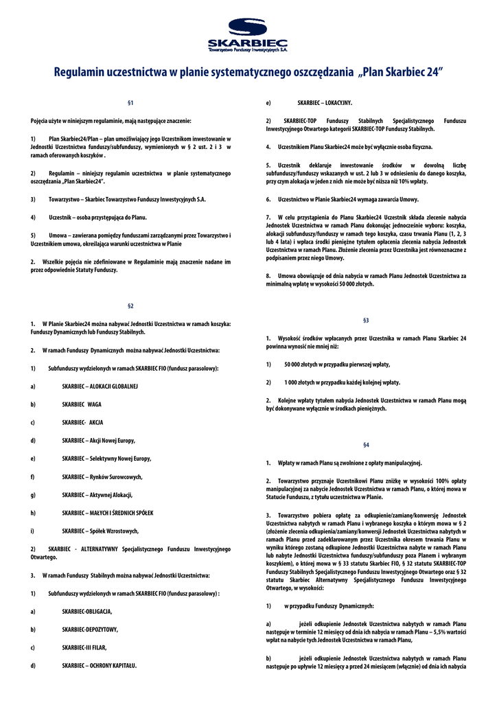 Regulamin uczestnictwa w planie systematycznego oszczędzania „Plan Skarbiec 24” §1 Pojęcia użyte w niniejszym regulaminie, mają następujące znaczenie: 1) Plan Skarbiec24/Plan – plan umożliwiający jego Uczestnikom inwestowanie w Jednostki Uczestnictwa funduszy/subfunduszy, wymienionych w § 2 ust. 2 i 3 w ramach oferowanych koszyków . e) SKARBIEC – LOKACYJNY. 2) SKARBIEC-TOP Funduszy Stabilnych Specjalistycznego Inwestycyjnego Otwartego kategorii SKARBIEC-TOP Funduszy Stabilnych. 4. Funduszu Uczestnikiem Planu Skarbiec24 może być wyłącznie osoba fizyczna. 2) Regulamin – niniejszy regulamin uczestnictwa w planie systematycznego oszczędzania „Plan Skarbiec24”. 5. Uczestnik deklaruje inwestowanie środków w dowolną liczbę subfunduszy/funduszy wskazanych w ust. 2 lub 3 w odniesieniu do danego koszyka, przy czym alokacja w jeden z nich nie może być niższa niż 10% wpłaty. 3) Towarzystwo – Skarbiec Towarzystwo Funduszy Inwestycyjnych S.A. 6. 4) Uczestnik – osoba przystępująca do Planu. 7. W celu przystąpienia do Planu Skarbiec24 Uczestnik składa zlecenie nabycia Jednostek Uczestnictwa w ramach Planu dokonując jednocześnie wyboru: koszyka, alokacji subfunduszy/funduszy w ramach tego koszyka, czasu trwania Planu (1, 2, 3 lub 4 lata) i wpłaca środki pieniężne tytułem opłacenia zlecenia nabycia Jednostek Uczestnictwa w ramach Planu. Złożenie zlecenia przez Uczestnika jest równoznaczne z podpisaniem przez niego Umowy. 5) Umowa – zawierana pomiędzy funduszami zarządzanymi przez Towarzystwo i Uczestnikiem umowa, określająca warunki uczestnictwa w Planie 2. Wszelkie pojęcia nie zdefiniowane w Regulaminie mają znaczenie nadane im przez odpowiednie Statuty Funduszy. Uczestnictwo w Planie Skarbiec24 wymaga zawarcia Umowy. 8. Umowa obowiązuje od dnia nabycia w ramach Planu Jednostek Uczestnictwa za minimalną wpłatę w wysokości 50 000 złotych. §2 1. W Planie Skarbiec24 można nabywać Jednostki Uczestnictwa w ramach koszyka: Funduszy Dynamicznych lub Funduszy Stabilnych. 2. W ramach Funduszy Dynamicznych można nabywać Jednostki Uczestnictwa: 1) Subfunduszy wydzielonych w ramach SKARBIEC FIO (fundusz parasolowy): a) SKARBIEC – ALOKACJI GLOBALNEJ b) SKARBIEC WAGA c) SKARBIEC- AKCJA d) SKARBIEC – Akcji Nowej Europy, e) SKARBIEC – Selektywny Nowej Europy, f) SKARBIEC – Rynków Surowcowych, g) SKARBIEC – Aktywnej Alokacji, h) SKARBIEC – MAŁYCH I ŚREDNICH SPÓŁEK i) SKARBIEC – Spółek Wzrostowych, 2) SKARBIEC - ALTERNATYWNY Specjalistycznego Funduszu Inwestycyjnego Otwartego. 3. 1) W ramach Funduszy Stabilnych można nabywać Jednostki Uczestnictwa: Subfunduszy wydzielonych w ramach SKARBIEC FIO (fundusz parasolowy) : a) SKARBIEC-OBLIGACJA, b) SKARBIEC-DEPOZYTOWY, c) SKARBIEC-III FILAR, d) SKARBIEC – OCHRONY KAPITAŁU. §3 1. Wysokość środków wpłacanych przez Uczestnika w ramach Planu Skarbiec 24 powinna wynosić nie mniej niż: 1) 50 000 złotych w przypadku pierwszej wpłaty, 2) 1 000 złotych w przypadku każdej kolejnej wpłaty. 2. Kolejne wpłaty tytułem nabycia Jednostek Uczestnictwa w ramach Planu mogą być dokonywane wyłącznie w środkach pieniężnych. §4 1. Wpłaty w ramach Planu są zwolnione z opłaty manipulacyjnej. 2. Towarzystwo przyznaje Uczestnikowi Planu zniżkę w wysokości 100% opłaty manipulacyjnej za nabycie Jednostek Uczestnictwa w ramach Planu, o której mowa w Statucie Funduszu, z tytułu uczestnictwa w Planie. 3. Towarzystwo pobiera opłatę za odkupienie/zamianę/konwersję Jednostek Uczestnictwa nabytych w ramach Planu i wybranego koszyka o którym mowa w § 2 (złożenie zlecenia odkupienia/zamiany/konwersji Jednostek Uczestnictwa nabytych w ramach Planu przed zadeklarowanym przez Uczestnika okresem trwania Planu w wyniku którego zostaną odkupione Jednostki Uczestnictwa nabyte w ramach Planu lub nabyte Jednostki Uczestnictwa funduszy/subfunduszy poza Planem i wybranym koszykiem), o której mowa w § 33 statutu Skarbiec FIO, § 32 statutu SKARBIEC-TOP Funduszy Stabilnych Specjalistycznego Funduszu Inwestycyjnego Otwartego oraz § 32 statutu Skarbiec Alternatywny Specjalistycznego Funduszu Inwestycyjnego Otwartego, w wysokości: 1) w przypadku Funduszy Dynamicznych: a) jeżeli odkupienie Jednostek Uczestnictwa nabytych w ramach Planu następuje w terminie 12 miesięcy od dnia ich nabycia w ramach Planu – 5,5% wartości wpłat na nabycie tych Jednostek Uczestnictwa w ramach Planu, b) jeżeli odkupienie Jednostek Uczestnictwa nabytych w ramach Planu następuje po upływie 12 miesięcy a przed 24 miesiącem (włącznie) od dnia ich nabycia Regulamin uczestnictwa w planie systematycznego oszczędzania „Plan Skarbiec 24” w ramach Planu– 4% wartości wpłat na nabycie tych Jednostek Uczestnictwa w ramach Planu, c) jeżeli odkupienie Jednostek Uczestnictwa nabytych w ramach Planu następuje po upływie 24 miesięcy a przed 36 miesiącem (włącznie) od dnia ich nabycia w ramach Planu– 1,5% wartości wpłat na nabycie tych Jednostek Uczestnictwa w ramach Planu, 2) W przypadku Funduszy Stabilnych: a) jeżeli odkupienie Jednostek Uczestnictwa nabytych w ramach Planu następuje w terminie 12 miesięcy od dnia ich nabycia w ramach Planu – 3% wartości wpłat na nabycie tych Jednostek Uczestnictwa w ramach Planu, 4. Fundusz wydaje Uczestnikowi Funduszu pisemne potwierdzenie, które jest sporządzane przez Agenta Transferowego, po zbyciu lub odkupieniu Jednostek Uczestnictwa. 5. Zawierając niniejszą Umowę Uczestnik Funduszu niniejszym udziela Agentowi Transferowemu pełnomocnictwa do odbierania potwierdzeń, o których mowa w ust. 4. W związku z powyższym raz na kwartał kalendarzowy Uczestnikowi Funduszu będą wysyłane zbiorcze potwierdzenia zbycia i odkupienia Jednostek Uczestnictwa, w terminie do dwóch tygodni od zakończenia kwartału kalendarzowego, w którym zostało zrealizowane zbycie albo odkupienie Jednostek Uczestnictwa. W przypadku braku zleceń w danym okresie, po