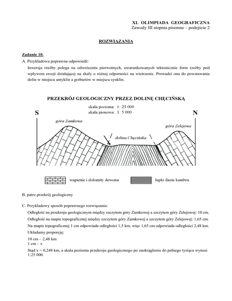-2r/1- XL OLIMPIADA GEOGRAFICZNA Zawody III stopnia pisemne – podejście 2 ROZWIĄZANIA Zadanie 10. A. Przykładowa poprawna odpowiedź: Inwersja rzeźby polega na odwróceniu pierwotnych, uwarunkowanych tektonicznie form rzeźby pod wpływem erozji działającej na skały o różnej odporności na wietrzenie. Prowadzi ona do powstawania dolin w miejscu antyklin a grzbietów w miejscu synklin. S N B. patrz przekrój geologiczny C. Przykładowy sposób poprawnego rozwiązania: Odległość na przekroju geologicznym między szczytem góry Zamkowej a szczytem góry Zelejowej: 10 cm. Odległość na mapie topograficznej między szczytem góry Zamkowej a szczytem góry Zelejowej: 1,65 cm. Na mapie topograficznej 1 cm odpowiada odległości 1,5 km, więc 1,65 cm odpowiada odległości 2,48 km. Układamy proporcję: 10 cm – 2,48 km 1 cm – x Stąd x = 0,248 km, a skala pozioma przekroju geologicznego po zaokrągleniu do pełnego tysiąca wynosi 1:25 000. -2r/2- D. Przykładowy sposób poprawnego rozwiązania: Różnica wysokości między szczytem góry Zamkowej a najniższym punktem doliny Chęcińskiej wynosi 100 m. Różnica wysokości na przekroju geologicznym między szczytem góry Zamkowej a najniższym punktem doliny Chęcińskiej wynosi 2 cm. Układamy proporcję: 2 cm – 100 m 1 cm – x Stąd x = 50 m, a skala pionowa przekroju geologicznego wynosi 1:5 000. E. Gdyby wydrukować mapę (załącznik 1) w skali takiej, jak pozioma skala profilu, to powierzchnia mapy zwiększyłaby się / zmniejszyłaby się 36 razy. Zadanie 11. A. Azymut grzbietu Łysogór wynosi 105°. B. Przykładowa poprawna odpowiedź: Przebieg grzbietu Łysogór uwarunkowany jest biegiem warstw skalnych. C. Przykładowa poprawna odpowiedź: Grzbiet Pasma Jeleniowskiego nie leży dokładnie na przedłużeniu Łysogór, ponieważ zostały one przesunięte względem siebie przez uskok tektoniczny o przebiegu prostopadłym do rozciągłości tych pasm górskich. Zadanie 12. P W kamieniołomach w okolicy Kielc pozyskuje się kwarcyty wykorzystywane do produkcji cementu. X Nazwy miejscowości Rudki i Stara Kuźnica mają związek z wydobyciem i przeróbką rud żelaza. X Piryt jest minerałem zawierającym żelazo. X W Krzemionkach Opatowskich znajdują się kopalnie sprzed 4-5 tysięcy lat, w których wydobywano rudy miedzi. Jedną ze skał wydobywanych w Górach Świętokrzyskich nazywa się „zlepieńcem zygmuntowskim”, ponieważ wykonano z niej pierwszą kolumnę pomnika Zygmunta III Wazy w Warszawie. F X X Dla lokalizacji Staropolskiego Okręgu Przemysłowego decydującą rolę odegrało dogodne położenie komunikacyjne – w centrum kraju. X Nazwy miejscowości Miedzianka i Miedziana Góra wywodzą się od hut miedzi, które znajdowały się tam w XX wieku. X -2r/3- Zadanie 13. Do produkcji cementu dolomity Do produkcji ceramiki X iły Jako kruszywo drogowe Jako materiały elewacyjne X X X X X X X X X piaskowce wapienie X zlepieńce Zadanie 14. A. Przykładowa poprawna odpowiedź: 9 współczesna erozja 8 wydźwignięcie obszaru ponad poziom morza 7 wychylenie skał z położenia poziomego (fałdowanie, ruchy tektoniczne) 6 sedymentacja zlepieńców 5 obniżenie obszaru i zalanie przez morze 4 erozja na lądzie 3 wydźwignięcie obszaru ponad poziom morza 2 wychylenie skał z położenia poziomego (fałdowanie, ruchy tektoniczne) 1 sedymentacja wapieni w zbiorniku wodnym B. b Zadanie 15. A. Tropy najstarszego znanego czworonożnego zwierzęcia lądowego (tetrapoda) odkryto w kamieniołomie Zachełmie w pobliżu Kielc i opisano je w 2010 r. Zwierzę to było: a) formą pośrednią między płazem a gadem b) formą pośrednią między rybą a gadem c) formą pośrednią między rybą a płazem d) płazem B. Rekonstrukcję tetrapoda z kamieniołomu Zachełmie przedstawiono na rysunku oznaczonym literą c. C. patrz mapa (załącznik)