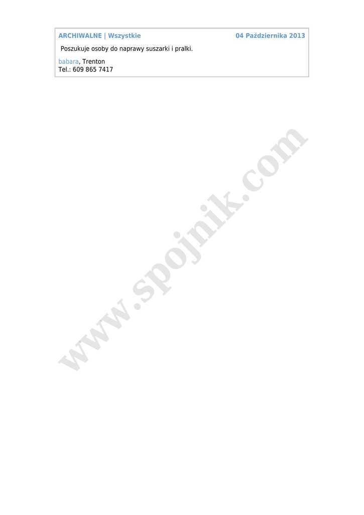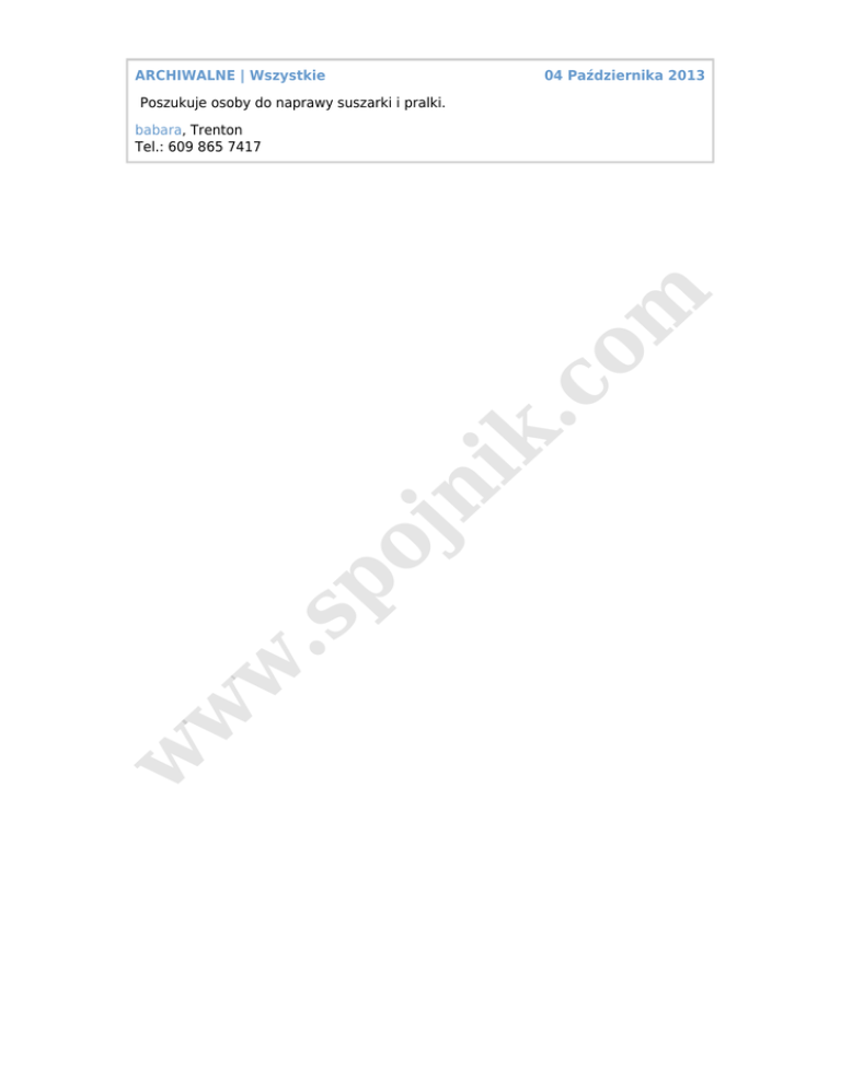 ARCHIWALNE | Wszystkie 04 Października 2013 Poszukuje osoby do naprawy suszarki i pralki. w w w .s po jn ik .c o m babara, Trenton Tel.: 609 865 7417