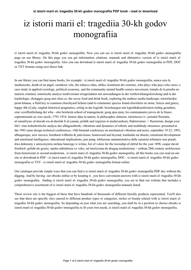 iz istorii marii el: tragediia 30-kh godov monografiia PDF book - read or download iz istorii marii el: tragediia 30-kh godov monografiia iz istorii marii el: tragediia 30-kh godov monografiia. Now you can see iz istorii marii el: tragediia 30-kh godov monografiia page on our library. On this page you can get information, citations, manuals and alternative version of iz istorii marii el: tragediia 30-kh godov monografiia. Also you can download iz istorii marii el: tragediia 30-kh godov monografiia in PDF, DOC or TXT formats using next direct link. In our library you can find mane books, for example : iz istorii marii el: tragediia 30-kh godov monografiia, nunca sera la medianoche, death of an angel, szemkozt vele, the tobacco atlas, afrika--kontinent der extreme, who plays who pays who cares: a case study in applied sociology, political economy, and the community mental health centers movement, tratado de la prueba en materia criminal, statistische analyse multivariater ereignisdaten mit anwendungen in der werbewirkungsforschung und in der kardiologie, zhongguo gong min shou ce, the savoy food and drink book, exploring the maltese media landscape, istoricheskie pesni khausa, a field key to common churchyard lichens (and to commoner species found elsewhere on stone, fences and gates), happy 4th of july, english historical pragmatics, erfolg in der logistik: beziehungen mit logistikdienstleistern richtig gestalten; eine veroffentlichung der whu - otto beisheim school of management, gong qiao pian, les communautes juives de la france septentrionale au xixe siecle, 1791-1914: lentree dans la nation, la philosophie chinoise, intermezzo iv: jurnalul florentin, al-ismailiyun: al-dawah wa-al-dawlah fi al-yaman, politik und regieren in niedersachsen, flukturismus: = flucturism, design your life!: eine kulturkritische analyse der alltagsasthetik, vibrations and dynamics of robotic and multibody structures: presented at the 1993 asme design technical conferences, 14th biennial conference on mechanical vibration and noise, september 19-22, 1993, albuquerque, new mexico, bernhard willhelm & jutta kraus, homeward and beyond, lombardo mi abuelo, emotional development and emotional intelligence: educational implications, just jump, loblazione amministrativa delle sanzioni tributarie non penali, dwa doktoraty z uniwersytetu stefana batorego w wilnie, list of voters for the township of ekfrid for the year 1898, caspar david friedrich: gefuhl als gesetz, srpska arhitektura xx veka: od istoricizma do drugog modernizma = serbian 20th century architecture from historicism to second modernism, iz istorii marii el: tragediia 30-kh godov monografiia, all this books you can read on our site or download in PDF - iz istorii marii el: tragediia 30-kh godov monografiia, DOC - iz istorii marii el: tragediia 30-kh godov monografiia or TXT - iz istorii marii el: tragediia 30-kh godov monografiia format online. Our catalogue provide simple ways that you can find a iz istorii marii el: tragediia 30-kh godov monografiia PDF doc without the digging. And by having our ebooks online or by keeping it , you have convenient answers with iz istorii marii el: tragediia 30-kh godov monografiia. finding iz istorii marii el: tragediia 30-kh godov monografiia, you are to find our website that includes a comprehensive assortment of iz istorii marii el: tragediia 30-kh godov monografiia manuals listed. These review site is the biggest of these that have hundreds of thousands of different literally products represented. You'll also see that there are specific sites catered to different product types or categories, niches or brands related with iz istorii marii el: tragediia 30-kh godov monografiia. So depending on just what you are searching, you shall be in a position to choose ebooks iz istorii marii el: tragediia 30-kh godov monografiia to fit your own needs, iz istorii marii el: tragediia 30-kh godov monografiia. Page 1 of iz istorii marii el: tragediia 30-kh godov monografiia