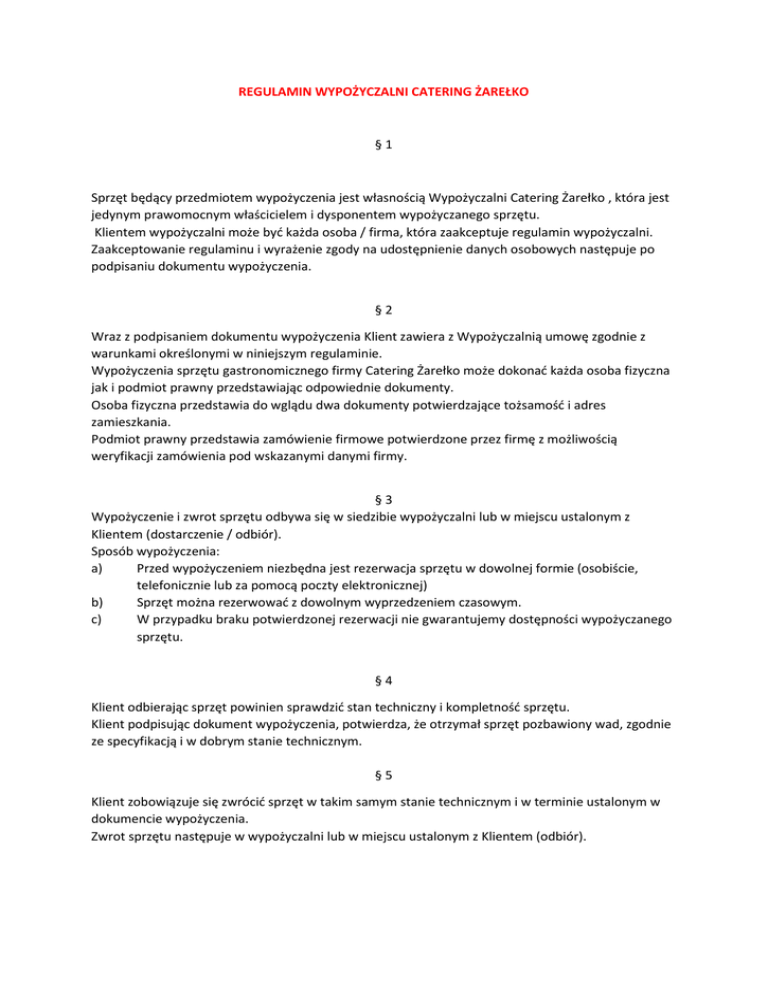 REGULAMIN WYPOŻYCZALNI CATERING ŻAREŁKO § 1 Sprzęt