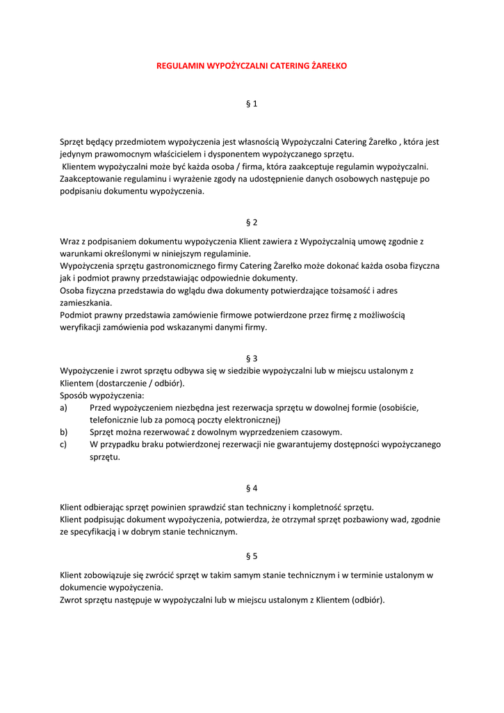 REGULAMIN WYPOŻYCZALNI CATERING ŻAREŁKO §1 Sprzęt będący przedmiotem wypożyczenia jest własnością Wypożyczalni Catering Żarełko , która jest jedynym prawomocnym właścicielem i dysponentem wypożyczanego sprzętu. Klientem wypożyczalni może byd każda osoba / firma, która zaakceptuje regulamin wypożyczalni. Zaakceptowanie regulaminu i wyrażenie zgody na udostępnienie danych osobowych następuje po podpisaniu dokumentu wypożyczenia. §2 Wraz z podpisaniem dokumentu wypożyczenia Klient zawiera z Wypożyczalnią umowę zgodnie z warunkami określonymi w niniejszym regulaminie. Wypożyczenia sprzętu gastronomicznego firmy Catering Żarełko może dokonad każda osoba fizyczna jak i podmiot prawny przedstawiając odpowiednie dokumenty. Osoba fizyczna przedstawia do wglądu dwa dokumenty potwierdzające tożsamośd i adres zamieszkania. Podmiot prawny przedstawia zamówienie firmowe potwierdzone przez firmę z możliwością weryfikacji zamówienia pod wskazanymi danymi firmy. §3 Wypożyczenie i zwrot sprzętu odbywa się w siedzibie wypożyczalni lub w miejscu ustalonym z Klientem (dostarczenie / odbiór). Sposób wypożyczenia: a) Przed wypożyczeniem niezbędna jest rezerwacja sprzętu w dowolnej formie (osobiście, telefonicznie lub za pomocą poczty elektronicznej) b) Sprzęt można rezerwowad z dowolnym wyprzedzeniem czasowym. c) W przypadku braku potwierdzonej rezerwacji nie gwarantujemy dostępności wypożyczanego sprzętu. §4 Klient odbierając sprzęt powinien sprawdzid stan techniczny i kompletnośd sprzętu. Klient podpisując dokument wypożyczenia, potwierdza, że otrzymał sprzęt pozbawiony wad, zgodnie ze specyfikacją i w dobrym stanie technicznym. §5 Klient zobowiązuje się zwrócid sprzęt w takim samym stanie technicznym i w terminie ustalonym w dokumencie wypożyczenia. Zwrot sprzętu następuje w wypożyczalni lub w miejscu ustalonym z Klientem (odbiór). §6 Klient oświadcza, że posiada niezbędną wiedzę na temat eksploatacji sprzętu i zobowiązuje się do dbałości o sprzęt i wykorzystywania go bezpiecznie i zgodnie z przeznaczeniem. §7 Klient nie może dokonywad żadnych napraw sprzętu. §8 Wypożyczalnia nie ponosi odpowiedzialności za skutki eksploatacji powstałe wobec osób trzecich i skutki nieprawidłowej eksploatacji. §9 Okresem rozliczeniowym za wypożyczenie sprzętu jest 48 h. W przypadku zwrotu sprzętu po ustalonym terminie zwrotu wypożyczalnia nalicza opłatę w wysokości ustalonej w cenniku. Opłaty za wypożyczenie nalicza się od dnia wypożyczenia do dnia zwrotu sprzętu. Opłaty za wypożyczenie sprzętu ustalona jest w cenniku. Opłaty za dostarczenie i odbiór sprzętu ustalane są indywidualnie z klientem. § 11 Odpowiedzialnośd Klienta: a) Klient ponosi pełną odpowiedzialnośd prawną i materialną za powierzony mu sprzęt do czasu oddania go do Wypożyczalni b) Pod względem technicznym sprzęt zwracany musi byd w stanie niezmienionym od stanu wydania c) Wypożyczający ponosi wszystkie koszty związane z brakiem lub uszkodzeniem sprzętu Klient ponosi odpowiedzialnośd za ponad normalne zużycie sprzętu, zniszczenie i zdekompletowanie sprzętu. Wysokośd szkody ustala wypożyczalnia w oparciu o wartośd braków lub cenę naprawy. Klient nie ponosi odpowiedzialności za normalne zużycie sprzętu zgodnie z jego przeznaczeniem. § 12 Wypożyczalnia Catering Żarełko zastrzega, iż może odmówid wypożyczenia sprzętu bez podania przyczyny odmowy. § 13 Płatnośd za wypożyczenie następuje przy pobieraniu sprzętu z Wypożyczalni lub przy odbiorze od pracownika dostarczającego sprzęt naszym transportem na podstawie wystawionej faktury lub dokumentu KP. § 14 Transport za pośrednictwem Wypożyczalni polega na dostarczeniu wypożyczonego sprzętu pod wskazany adres. Pracownicy Catering Żarełko nie są zobligowani do noszenia i ustawiania sprzętu jeżeli nie zostało to uzgodnione w firmie z osobą odpowiedzialną za wypożyczenie. Osoba wypożyczająca sprzęt i zamawiająca dowóz naszym transportem powinna zabezpieczyd osoby do rozładunku jak i późniejszego załadunku wypożyczanego sprzętu. § 15 Transport w firmie Catering Żarełko jest usługą dodatkową. Opłaty logistyczne związane z dostawą i odbiorem sprzętu ustalane są indywidualnie. § 16 Wszystkie inne kwestie nie ujęte w niniejszym regulaminie regulują obowiązujące akty prawne.