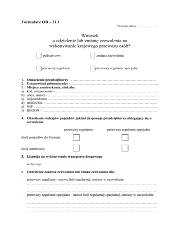 Formularz OB – 21.1 Teresin, dnia ……………… Wniosek o udzielenie lub zmianę zezwolenia na wykonywanie krajowego przewozu osób* podstawowy zmiana zezwolenia przewozy regularne 1. 2. 3. a) b) c) d) e) f) przewozy regularne specjalne Oznaczenie przedsiębiorcy - ……………………………………………………………. Ustanowieni pełnomocnicy - …………………………………………………………….... Miejsce zamieszkania, siedziby: kod, miejscowość - ………………………………………………………………………… ulica, numer - ………………………………………………………………………………. województwo - …………………………………………………………………………….. telefon/fax - ………………………………………………………………………………... NIP - ……………………………………………………………………………………….. REGON - ………………………………………………………………………………….. 4. Określenie rodzajów pojazdów jakimi dysponuje przedsiębiorca ubiegający się o zezwolenie przewozy regularne przewozy regularne specjalne ilość pojazdów do 9 miejsc ilość autobusów 5. Licencja na wykonywanie transportu drogowego nr licencji: ………………………………………. 6. Określenie zakresu zezwolenia lub zmian zezwolenia dla: - - przewozy regularne - nazwa linii regularnej, zmiany w zezwoleniu ……………………………………………………………………………………………… ……………………………………………………………………………………………… ……………………………………………………………………………………………… przewozy regularne specjalne - nazwa linii regularnej specjalnej, zmiany w zezwoleniu ……………………………………………………………………………………………… ……………………………………………………………………………………………… ……………………………………………………………………………………………… 7. Wnioskowany czas ważności zezwolenia: zezwolenie nr ……………………… ważne do ………………………… 8. Liczba wnioskowanych wypisów z zezwoleń dla linii 1. – sztuk ………………. dla linii 2. – sztuk ………………. dla linii 3. – sztuk ………………. dla linii 4. – sztuk ………………. dla linii 5. – sztuk ………………... dla linii 6. – sztuk ………………... dla linii 7. – sztuk ………………... dla linii 8. – sztuk ………………... 9. Do wniosku o udzielenie zezwolenia na wykonywanie przewozów regularnych w krajowym transporcie drogowym należy dołączyć: a) kopię licencji, b) proponowany rozkład jazdy uwzględniający przystanki, godziny odjazdów środków transportowych, długość linii komunikacyjnej, podaną w kilometrach, i odległości między przystankami, kursy oraz liczbę pojazdów niezbędnych do wykonywania codziennych przewozów, zgodnie z rozkładem jazdy, c) schemat połączeń komunikacyjnych z zaznaczoną linią komunikacyjną i przystankami, d) potwierdzenie uzgodnienie zasad korzystania z obiektów dworcowych i przystanków, dokonane z ich właścicielami lub zarządzającymi, e) zobowiązanie do zamieszczenia informacji o godzinach odjazdów na tabliczkach przystankowych na przystankach, f) cennik, g) wykaz pojazdów, z określeniem ich liczby oraz liczby miejsc, którymi wnioskodawca zamierza wykonywać przewozy. 10. Do wniosku o udzielenie zezwolenia na wykonywanie przewozów regularnych specjalnych w krajowym transporcie drogowym należy dołączyć: a) kopię licencji, b) informacje określające grupę osób, która będzie uprawniona do korzystania z przewozów, c) proponowany rozkład jazdy uwzględniający przystanki, godziny odjazdów środków transportowych, długość linii komunikacyjnej, podaną w kilometrach, i odległości między przystankami, kursy oraz liczbę pojazdów niezbędnych do wykonywania codziennych przewozów, zgodnie z rozkładem jazdy, d) schemat połączeń komunikacyjnych z zaznaczoną linią komunikacyjną i przystankami, e) potwierdzenie uzgodnienie zasad korzystania z obiektów dworcowych i przystanków, innych niż zlokalizowanych przy drogach publicznych, ustalone z ich właścicielami lub zarządzającymi. * właściwe zakreślić ………………………………………. (imię i nazwisko wnioskodawcy oraz pieczęć firmy) ……………. (podpis)