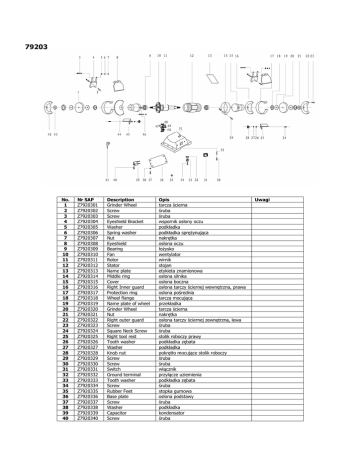 79203 No. 1 2 3 4 5 6 7 8 9 10 11 12 13 14 15 16 17 18 19 20 21 22 23 24 25 26 27 28 29 30 31 32 33 34 35 36 37 38 39 40 Nr SAP Z7920301 Z7920302 Z7920303 Z7920304 Z7920305 Z7920306 Z7920307 Z7920308 Z7920309 Z7920310 Z7920311 Z7920312 Z7920313 Z7920314 Z7920315 Z7920316 Z7920317 Z7920318 Z7920319 Z7920320 Z7920321 Z7920322 Z7920323 Z7920324 Z7920325 Z7920326 Z7920327 Z7920328 Z7920329 Z7920330 Z7920331 Z7920332 Z7920333 Z7920334 Z7920335 Z7920336 Z7920337 Z7920338 Z7920339 Z7920340 Description Grinder Wheel Screw Screw Eyeshield Bracket Washer Spring washer Nut Eyeshield Bearing Fan Rotor Stator Name plate Middle ring Cover Right Inner guard Protection ring Wheel flange Name plate of wheel Grinder Wheel Nut Right outer guard Screw Square Neck Screw Right tool rest Tooth washer Washer Knob nut Screw Screw Switch Ground terminal Tooth washer Screw Rubber Feet Base plate Screw Washer Capacitor Screw Opis tarcza ścierna śruba śruba wspornik osłony oczu podkładka podkładka sprężynująca nakrętka osłona oczu łożysko wentylator wirnik stojan etykieta znamionowa osłona silnika osłona boczna osłona tarczy ściernej wewnętrzna, prawa osłona pośrednia tarcza mocująca przekładka tarcza ścierna nakrętka osłona tarczy ściernej zewnętrzna, lewa śruba śruba stolik roboczy prawy podkładka zębata podkładka pokrętło mocujące stolik roboczy śruba śruba włącznik przyłącze uziemienia podkładka zębata śruba stopka gumowa osłona podstawy śruba podkładka kondensator śruba Uwagi 41 42 43 44 45 46 47 48 49 50 51 52 Z7920341 Z7920342 Z7920343 Z7920344 Z7920345 Z7920346 Z7920347 Z7920348 Z7920349 Z7920350 Z7920351 Z7920352 Plug & Cable Left Inner guard Nut Left outer guard Left tool rest Screw Cable adapter Screw Cable Block Cable clip Base Washer kabel zasilający z wtyczką osłona tarczy ściernej zewnętrzna, lewa nakrętka osłona tarczy ściernej wewnętrzna, prawa stolik roboczy lewy śruba odgiętka śruba uchwyt odciążka podstawa podkładka