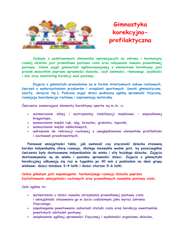 Gimnastyka korekcyjnoprofilaktyczna Jednym z podstawowych elementów wpływających na zdrowy i harmonijny rozwój dziecka jest prawidłowa postawa ciała oraz nabywanie nawyku prawidłowej postawy. Celem zajęć gimnastyki ogólnorozwojowej z elementami korektywy jest przede wszystkim poprawa sprawności dziecka, czyli zwinności, równowagi, szybkości i siły oraz monitoring korekcji wad postawy. Zajęcia z gimnastyki prowadzone są w formie kreatywnych zabaw ruchowych, ćwiczeń z wykorzystaniem przyborów i urządzeń sportowych (worki gimnastyczne, szarfy, obręcze itp.). Podczas zajęć dzieci podnoszą ogólną sprawność fizyczną, rozwijają koordynację ruchową i usprawniają motorykę. Ćwiczenia zawierające elementy korektywy oparte są m.in. o: wytwarzanie silnej i wytrzymałej stabilizacji mięśniowo – więzadłowej kręgosłupa, wzmacnianie mięśni rąk, nóg, brzucha, grzbietu, łopatek, wzmacnianie mięśni oddechowych, wdrażanie do rekreacji ruchowej z uwzględnieniem elementów profilaktyki i zachowań prozdrowotnych. Ponieważ umiejętności takie, jak zwinność czy zręczność dziecka stanowią bardzo indywidualną sferę rozwoju, dlatego niezwykle ważne jest, by poszczególne ćwiczenia były dostosowane indywidualnie do wieku i siły każdego dziecka. Zajęcia dostosowywane są do wieku i poziomu sprawności dzieci. Zajęcia z gimnastyki korekcyjnej odbywają się raz w tygodniu po 30 min z podziałem na dwie grupy wiekowe: dzieci młodsze 3-4 latki i dzieci starsze 5-6 latki. Celem głównym jest wspomaganie harmonijnego rozwoju dziecka poprzez kształtowanie umiejętności ruchowych oraz prawidłowych nawyków postawy ciała. Cele ogólne to: wytworzenie u dzieci nawyku utrzymania prawidłowej postawy ciała i umiejętność stosowania go w życiu codziennym jako wyraz zdrowia fizycznego, zapobiegania powstawania zaburzeń statyki ciała oraz korekcja ewentualnie powstałych odchyleń postawy, zwiększenie ogólnej sprawności fizycznej i wydolności organizmu dziecka, wyrabianie wytrzymałości posturalnej (zdolności do długotrwałego utrzymywania skorygowanej postawy poprzez ćwiczenia, rozciąganie przykurczonych grup mięśniowych oraz wzmacnianie osłabionych, wyrabianie nawyku prawidłowego stawiania stóp w chodzie, biegu nauka prawidłowego oddychania w czasie wykonywania ćwiczeń w celu zwiększenia pojemności życiowej płuc oraz wydolności i sprawności układu oddychania, nauka i doskonalenie posługiwania się różnymi przyborami w ćwiczeniach korekcyjnych. Cele szczegółowe prowadzonych zajęć: uświadomienie i umotywowanie dzieciom potrzeby uczestnictwa w zajęciach, kształtowanie prawidłowego napięcia mięśni posturalnych (rozciąganie mięśni piersiowych oraz wzmacnianie mięśni grzbietu, brzucha, pośladków i stóp). kształtowanie zwinności, zręczności i szybkości, rozwijanie spostrzegawczości, orientacji w przestrzeni, ocena odległości, sygnałów i kierunku, doskonalenie wzrokowo-ruchowych, słuchowo-ruchowych i przestrzennoczasowych, nauka i doskonalenie oddychania torem piersiowym i brzusznym, rozluźnianie i zwiększanie ruchomości w stawach z równoczesnym wzmacnianiem odcinkowy, poznawanie gier i zabaw stosowanych w ćwiczeniach korekcyjnych, wzmacnianie osłabionych partii mięśniowych, rozciąganie mięśni przykurczonych, wyrabianie u dzieci poczucia odpowiedzialności za własne zdrowie, kontrola i samokontrola wykonywanych ćwiczeń i utrzymania prawidłowej postaw, kształtowanie prawidłowego napięcia mięśni wysklepiających stopę, nauka i doskonalenie ustawiania się w określonych formacjach ćwiczebnych (rozsypka, rząd, szereg, koło), nauka rzutu i chwytu przyboru.
