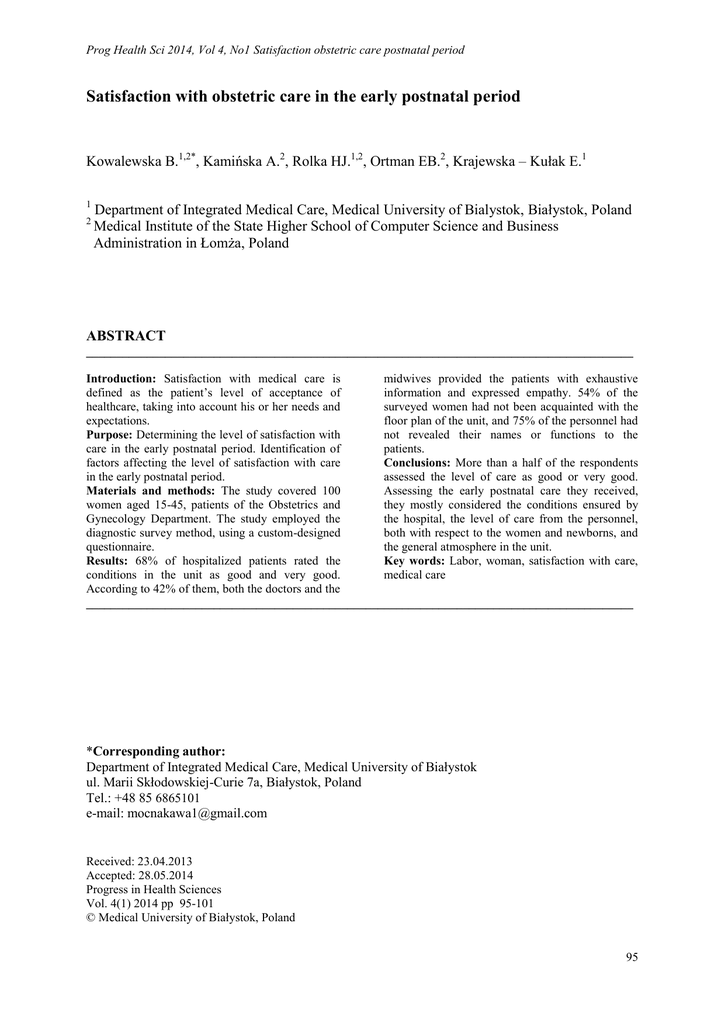 Prog Health Sci 2014, Vol 4, No1 Satisfaction obstetric care postnatal period Satisfaction with obstetric care in the early postnatal period Kowalewska B.1,2*, Kamińska A.2, Rolka HJ.1,2, Ortman EB.2, Krajewska – Kułak E.1 1 2 Department of Integrated Medical Care, Medical University of Bialystok, Białystok, Poland Medical Institute of the State Higher School of Computer Science and Business Administration in Łomża, Poland ABSTRACT __________________________________________________________________________________________ Introduction: Satisfaction with medical care is midwives provided the patients with exhaustive defined as the patient’s level of acceptance of information and expressed empathy. 54% of the healthcare, taking into account his or her needs and surveyed women had not been acquainted with the expectations. floor plan of the unit, and 75% of the personnel had Purpose: Determining the level of satisfaction with not revealed their names or functions to the care in the early postnatal period. Identification of patients. factors affecting the level of satisfaction with care Conclusions: More than a half of the respondents in the early postnatal period. assessed the level of care as good or very good. Materials and methods: The study covered 100 Assessing the early postnatal care they received, women aged 15-45, patients of the Obstetrics and they mostly considered the conditions ensured by Gynecology Department. The study employed the the hospital, the level of care from the personnel, diagnostic survey method, using a custom-designed both with respect to the women and newborns, and questionnaire. the general atmosphere in the unit. Results: 68% of hospitalized patients rated the Key words: Labor, woman, satisfaction with care, conditions in the unit as good and very good. medical care According to 42% of them, both the doctors and the __________________________________________________________________________________________ *Corresponding author: Department of Integrated Medical Care, Medical University of Białystok ul. Marii Skłodowskiej-Curie 7a, Białystok, Poland Tel.: +48 85 6865101 e-mail: [email protected] Received: 23.04.2013 Accepted: 28.05.2014 Progress in Health Sciences Vol. 4(1) 2014 pp 95-101 © Medical University of Białystok, Poland 95 Prog Health Sci 2014, Vol 4, No1 Satisfaction obstetric care postnatal period INTRODUCTION In the recent years, less than 500,000 children have been born per year, among them 95% born in the maternity units of public healthcare facilities [1]. The aim of healthcare is to provide all pregnant women with early, comprehensive and systematic care, selective with respect to women with increased labor risk. In the last 50 years, radical changes have occurred in Poland in terms of the care for the mother and child. General care for the entire population of women and children has been introduced, including the latest methods of preventive care and treatment in pediatrics and obstetrics, which resulted in a drop in perinatal mortality of fetuses and newborns, and infant mortality, as well as in the pursuit of satisfaction from healthcare services [1]. Midwives taking care of birth-giving women are expected to [2, 3]: provide continuous care for the physical and emotional health of the mother and the newborn, help develop adequate psychological and emotional reactions of the mother towards the child, educate women in labor regarding self-care (hygiene, observation of postpartum discharge and self-inspection of breasts), as well as the identification of early signs of postpartum pathologies, promote breastfeeding (support and comprehensive education), take care of the emotional health of the family, instruct the childbearing women regarding pelvic floor muscle exercises, motivate to a healthy lifestyle, evaluate and ensure a proper form and quality of social support for the family. Satisfaction with medical care, also in maternity units, is defined as the patient’s level of acceptance of healthcare, taking into account his or her needs and expectations. It constitutes one of the central human values and generally refers to satisfaction with life, well-being, sense of happiness, good mood, or quality of life [4]. Some researchers [4] consider satisfaction with life in three dimensions: cognitive assessment, presence of positive effects and absence of negative effects. A patient’s satisfaction is an important component of healthcare quality assessment [4]. Medical care is a factor determining the overall patient satisfaction, mostly influenced by the behavior and mutual interactions of the medical team. Patient care should be provided 24 hours a day, recognizing their demands and expectations [4]. Definitions of the term “satisfaction with care” found in the literature differ in content and the level of generality: from the lack of interest and negligence of care to satisfaction with life in general [5]. The sense of satisfaction is a psychological phenomenon, a subjective feeling of pleasure and contentment, manifested in the form of significant features (reactions, behaviors, attitudes). The level of human satisfaction covers a certain range of values from-to (complete lack of understanding – complete satisfaction). According to Dozier et al. [6], although the level of satisfaction is presented in a linear manner, the aspects of care that significantly affect the increase in this level may (but do not have to) be completely different from the ones causing a patient’s dissatisfaction with care. In such case, “satisfaction” and “its lack” should be positioned on two independent continua instead of on the opposite sides of the same continuum. The quality of medical care may be evaluated from the point of view of the service provider – a doctor, nurse and other staff – or the service recipient – patient or client [7]. The quality of care, as viewed by the patient, may be assessed by studying his or her satisf