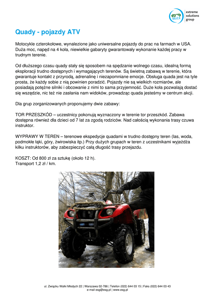 Quady - pojazdy ATV Motocykle czterokołowe, wynalezione jako uniwersalne pojazdy do prac na farmach w USA. Duża moc, napęd na 4 koła, niewielkie gabaryty gwarantowały wykonanie każdej pracy w trudnym terenie. Od dłuższego czasu quady stały się sposobem na spędzanie wolnego czasu, idealną formą eksploracji trudno dostępnych i wymagających terenów. Są świetną zabawą w terenie, która gwarantuje kontakt z przyrodą, adrenalinę i niezapomniane emocje. Obsługa quada jest na tyle prosta, że każdy sobie z nią powinien poradzić. Pojazdy nie są wielkich rozmiarów, ale posiadają potężne silniki i obcowanie z nimi to sama przyjemność. Duże koła pozwalają dostać się wszędzie, nic też nie zasłania nam widoków, prowadząc quada jesteśmy w centrum akcji. Dla grup zorganizowanych proponujemy dwie zabawy: TOR PRZESZKÓD – uczestnicy pokonują wyznaczony w terenie tor przeszkód. Zabawa dostępna również dla dzieci od 7 lat za zgodą rodziców. Nad całością wykonania trasy czuwa instruktor. WYPRAWY W TEREN – terenowe ekspedycje quadami w trudno dostępny teren (las, woda, podmokłe łąki, góry, żwirowiska itp.) Przy dużych grupach w teren z uczestnikami wyjeżdża kilku instruktorów, aby zabezpieczyć całą długość trasy przejazdu. KOSZT: Od 800 zł za sztukę (około 12 h). Transport 1,2 zł / km. ul. Związku Walki Młodych 22 | Warszawa 02-786 | Telefon (022) 644 03 15 | Faks (022) 644 03 43 e-mail [email protected] | www.esg.pl Powered by TCPDF (www.tcpdf.org)