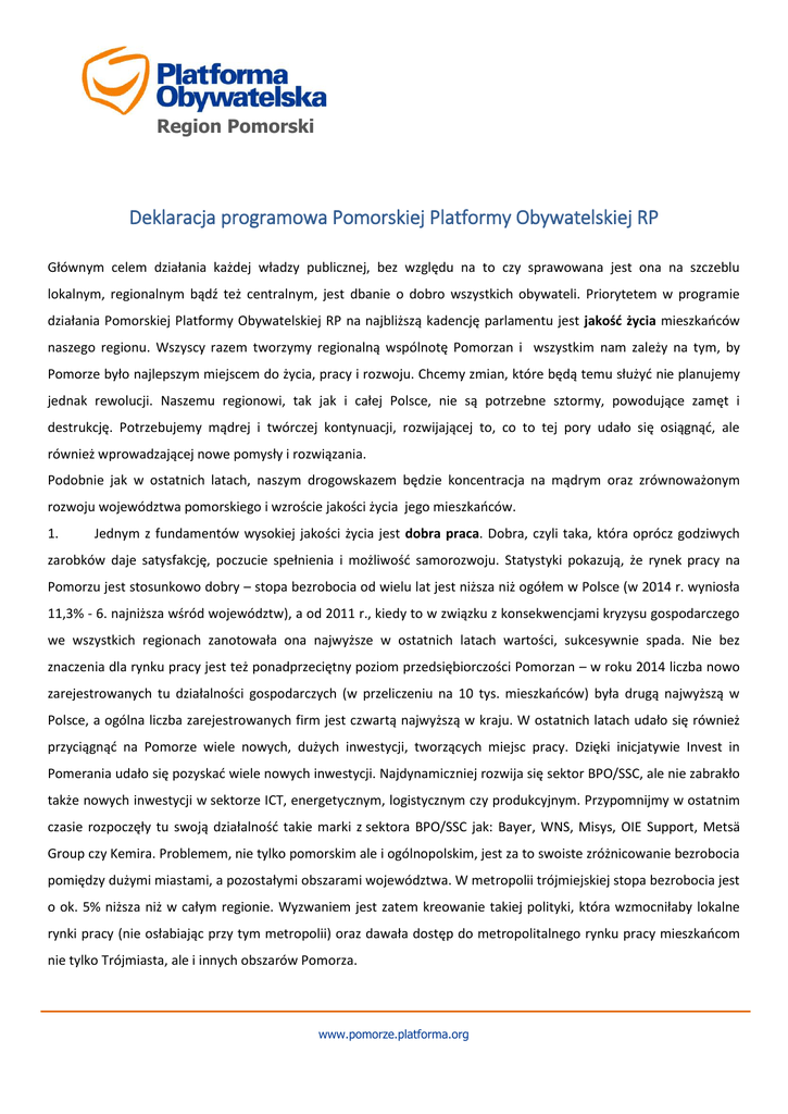 Deklaracja programowa Pomorskiej Platformy Obywatelskiej RP