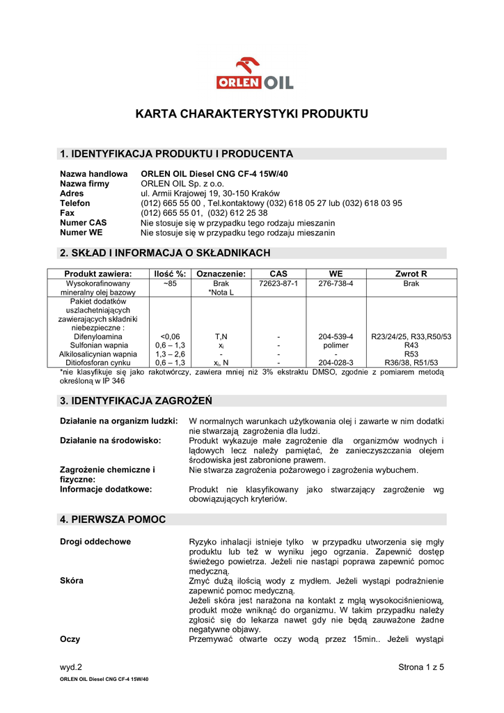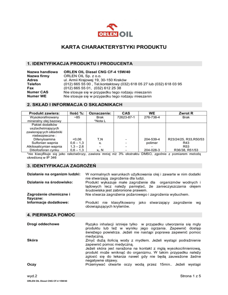 KARTA CHARAKTERYSTYKI PRODUKTU 1. IDENTYFIKACJA PRODUKTU I PRODUCENTA Nazwa handlowa Nazwa firmy Adres Telefon Fax Numer CAS Numer WE ORLEN OIL Diesel CNG CF-4 15W/40 ORLEN OIL Sp. z o.o. ul. Armii Krajowej 19, 30-150 Kraków (012) 665 55 00 , Tel.kontaktowy (032) 618 05 27 lub (032) 618 03 95 (012) 665 55 01, (032) 612 25 38 N i e s t o s u j e s i ę w p r z y p a d k u t e g o r o d z a j u m i e s z a n i n N i e s t o s u j e s i ę w p r z y p a d k u t e g o r o d z a j u m i e s z a n i n 2. SKŁAD I INFORMACJA O SKŁADNIKACH Produkt zawiera: Ilość %: Oznaczenie: CAS WE Zwrot R Wysokorafinowany mineralny olej bazowy Pakiet dodatków ~85 Brak *Nota L 72623-87-1 276-738-4 Brak <0,06 0,6 – 1,3 1,3 – 2,6 0,6 – 1,3 T,N xi xi, N - 204-539-4 polimer 204-028-3 R23/24/25, R33,R50/53 R43 R53 R36/38, R51/53 u z a s z w i l e a c r a h j e ą c t n y c i a j ą h c s k y ł c a d h n i k i niebezpieczne : Difenyloamina Sulfonian wapnia Alkilosalicynian wapnia Ditiofosforan cynku * n o i k e r k e ś l l a o s n y ą f i w k u j I P e s 3 4 i ę j a k o r a k o t w ó r c z y , z a w i e r a m n i e j n i Ŝ 3 % e k s t r a k t u D M S O , z g o d n i e z p o m i a r e m m e t o d ą 6 3. IDENTYFIKACJA ZAGROśEŃ Działanie na organizm ludzki: n n Działanie na środowisko: i e r s r o t m a d w l a u k r n y z c t a j h w w ą a y z k a a r z g u u r n j o k Ŝ a e e c n h m i u a ł a Ŝ d e l y t z a l k o a g u w r d a o z Ŝ i n i a o l e j i z a w a r t e w n i m d o d a t k i e . n i e d l a o r g a n i z m ó w w o d n y c h i P l ą d ś ZagroŜenie chemiczne i fizyczne: Informacje dodatkowe: o W r o o N w y d i h l e c z n a l e Ŝ y p a m i ę t a ć , Ŝ e z a n i e c z y s z c z a n i a o l e j e m owiska jest zabronione prawem. e r c s o t d w a u k r z a t z n i ą c a g r e o k Ŝ l e a s n y i f i a p k o o Ŝ w a a r n o w y e j g a o k i z o a s g t r w o a Ŝ r e z n a j i ą a w c y y b u z c a h g r e o m Ŝ . e n i e w g P o b o w i ą z u j y c h k r y t e r i ó w . 4. PIERWSZA POMOC Drogi oddechowe y p r ś y o k i o i y n h a l d o z w e o l l ą a c j i i u s k b i Ŝ o i i p k w ą ć ó t t i e s t n Ŝ i e j e e t w t r z a w y . J y l e Ŝ n k e i o w l k u p i j n i e e g r z y n o p a o a s t ą g d p r k i z u a u p o n i p r a t w . o r a Z z w a e a p n z e i a a w s p n e i i ę m w ć d g n i ć p o s o m t ł y ę p o c . u n u p n d e Ŝ r u g c ć p e t e y m p k Ŝ d a J u e e Z z d w m Skóra z R o r m ś o c o a o l m j Ŝ i c e s e ą w m t e n w n a i o d r k d y a n Ŝ ą y c z z n o ą n ć m a d y d ł e m . J e Ŝ e l i w y s t ą p i p o d r a Ŝ n i e n i e . n o a o r k g o a n n i t z a k m t u z m g . t ł a ą w k i y m s p o r k z o y c p i a ś n d k i e u n i n a o w l ą e , Ŝ y W z g ł o s i ć s i ę d o l e k a r z a n a w e t g d y n i e b ę d ą z a u w a Ŝ o n e Ŝ a d n e negatywne objawy. Oczy wyd.2 ORLEN OIL Diesel CNG CF-4 15W/40 r z e m y w a ć o t w a r t e o c z y w o d ą p r z e z 1 5 m i n . . J e Ŝ e l i w y s t ą p i P Strona 1 z 5 p Połknięcie o d N i n r a e Ŝ p a s t n r ą i o e n w p i o i p e z k o o p a w r p a a e w ć w n w a i y z a ć p m i p e o o m t w o ó n w i c m . ć e N p i o d e m y p o c o c z d m n ą a . w e a d y ć c n z n i ą c d o u s t n i e . J e Ŝ e l i n i e . 5. POSTĘPOWANIE W PRZYPADKU POśARU Odpowiednie środki gaśnicze i p Nieodpowiednie środki gaśnicze Sprzęt ochronny Informacje dodatkowe a n a , s u c h e p r o s z k i g ś a n i c z e , C O 2, P r z y p a d k u m a ł y c h p o Ŝ a r ó w piasek lub ziemia tylko w . Woda o zwartym strumieniu Kompletne ubranie ochronne z indywidualnym aparatem oddechowych. o d c z a s r o z k ł a d u t e r m i c z n e g o n a s t ą p i ć m o Ŝ e w y d z i e l a n i e t l e n k u P siarki, azotu , siarkowodór. 6. POSTĘPOWANIE W PRZYPADKU NIEZAMIERZONEGO UWOLNIENIA DO ŚRODOWISKA Zabezpieczenie ludzi n i k a ć k o n t a k t u z e s k ó r ą i o c z a m i , u Ŝ y w a ć m a s k i o c h r o n n e j , u b r a ń U powlekanych, butów na gumowej podeszwie. Zabezpieczenie środowiskaduŜe rozlewiska D u t Ŝ w e o Z e p z b o i j w i s k u i r o i c e a d n s l b ć m e z c a e o ą r j m r r t u k z y n o e a n a ł e c z z ę z i e , z s c i u r j ś p k p i o z s s ź t i m ó s b p y p z a z p o o a r ę d . s e p t e g o t y i e ć e i o o a t l u d k r i m r p m e y k a c l j z t i u ć o a ś e s r m i w d b m z o z u a p e r r ć i z ł w u o b k e a s ł a ł t r p z k m s u z e o n c i h ł a n a i n i e m a j s ą c i e ę g o . nakowanym szczelnym a d y o w w y a c i n e i k a w s t o s o w n y m . P Zabezpieczenie środowiskamałe wycieki Z e a b d o r s z n a ć o r a k m p i c y o j w e s n z y a a j m n ą . y c Z m u e s p b z r r c z a z e ć e d d l n n i o y s o z t m ę z p p i n o j e y e m i m ą s m n i , p k p r i z u a ę d s t k e o i e m m p l i ó ź n u i u b m e j m i s z a ś e e c g t i e ć r i a ł e m w o s k ł a d o w a n i a w stosownym miejscu. 7. POSTĘPOWANIE Z PRODUKTEM I JEGO MAGAZYNOWANIE POSTĘPOWANIE Zabezpieczenie uŜytkownika: t o s o w a ć o d p o w i e d n i ą w e n t y l a c j ę w p r z y p a d k u z aistnienia S w a r u n k ó w d o w y t w o r z e n i a s i ę p a r y b ą d ź m g ł y . t o s o w a ć w s z e l k i e S ś r p o d r z k e i p o r g a r c a n o i w c a z a n j y ą c m e r . r y z z e y t k r o z k y o m n y t w a a k t ć u z z d w a ł l a s a z o c d z a m z a t o e r l i e a j ł e ó m w P ł Zabezpieczenie przed eksplozją i poŜarem: a t w o u s p t a e l o n y p c a h k , o o w d a Ŝ n i y w a n i z ś o b i c o i r i n i n k a i p o m j o ó g w . ą z a w i e r a ć p a l n e l u b w y b u c h o w e P p a r w z y y k a N o g m . r r a z o t a y Ŝ e s s e r i ą t n a ł c y i ó z o w n a e n p w e e o a o l d Ŝ . o j o r z e m w o b e w y y e ć u c n - s i ę i e i e i b r r a a n d c n i o h i i a r p n a a o t y a z ś u p l c 