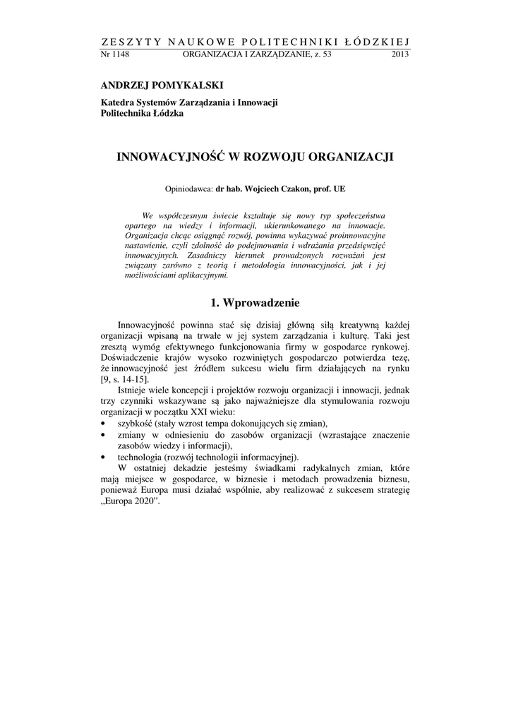 ZESZYTY NAUKOWE POLITECHNIKI ŁÓDZKIEJ Nr 1148 ORGANIZACJA I ZARZĄDZANIE, z. 53 2013 ANDRZEJ POMYKALSKI Katedra Systemów Zarządzania i Innowacji Politechnika Łódzka INNOWACYJNOŚĆ W ROZWOJU ORGANIZACJI Opiniodawca: dr hab. Wojciech Czakon, prof. UE We współczesnym świecie kształtuje się nowy typ społeczeństwa opartego na wiedzy i informacji, ukierunkowanego na innowacje. Organizacja chcąc osiągnąć rozwój, powinna wykazywać proinnowacyjne nastawienie, czyli zdolność do podejmowania i wdrażania przedsięwzięć innowacyjnych. Zasadniczy kierunek prowadzonych rozważań jest związany zarówno z teorią i metodologia innowacyjności, jak i jej możliwościami aplikacyjnymi. 1. Wprowadzenie Innowacyjność powinna stać się dzisiaj główną siłą kreatywną każdej organizacji wpisaną na trwałe w jej system zarządzania i kulturę. Taki jest zresztą wymóg efektywnego funkcjonowania firmy w gospodarce rynkowej. Doświadczenie krajów wysoko rozwiniętych gospodarczo potwierdza tezę, że innowacyjność jest źródłem sukcesu wielu firm działających na rynku [9, s. 14-15]. Istnieje wiele koncepcji i projektów rozwoju organizacji i innowacji, jednak trzy czynniki wskazywane są jako najważniejsze dla stymulowania rozwoju organizacji w początku XXI wieku: • szybkość (stały wzrost tempa dokonujących się zmian), • zmiany w odniesieniu do zasobów organizacji (wzrastające znaczenie zasobów wiedzy i informacji), • technologia (rozwój technologii informacyjnej). W ostatniej dekadzie jesteśmy świadkami radykalnych zmian, które mają miejsce w gospodarce, w biznesie i metodach prowadzenia biznesu, ponieważ Europa musi działać wspólnie, aby realizować z sukcesem strategię „Europa 2020”. 6 Andrzej Pomykalski Strategia „Europa 2020” obejmuje trzy wzajemnie ze sobą powiązane priorytety [5, s. 5]: • rozwój inteligentny: rozwój gospodarki opartej na wiedzy i innowacji, • rozwój zrównoważony: wspieranie gospodarki efektywnej korzystającej z zasobów, bardziej przyjaznej środowisku i bardziej konkurencyjnej, • rozwój sprzyjający włączeniu społecznemu: wspieranie gospodarki o wysokim poziomie zatrudnienia, zapewniającej spójność społeczną i terytorialną. Inteligentny rozwój oparty na wiedzy i innowacji wymaga zwiększenia jej wykorzystania w systemie zarządzania przedsiębiorstwem oraz podniesienia jakości edukacji, a przede wszystkim prowadzonych prac badawczorozwojowych. Rozwój zrównoważony to nowy system wartości dla wielu przedsiębiorstw i nowe wyzwania w procesie kształtowania potencjału rozwoju przedsiębiorstwa. W procesie tym uznaje się współzależność biznesu i jego interesariuszy, która kreuje dodaną wartość w sieci korzystającej z nowego źródła przewagi konkurencyjnej. Oznacza to zrozumienie, że wszyscy jesteśmy częścią większego systemu – ekosystemu. 2. Istota innowacyjności Innowacyjność w prowadzonych rozważaniach jest ujmowana jako zdolność organizacji do stałego poszukiwania, wdrażania i upowszechniania innowacji. Innowacyjność stanowi obecnie podstawowe wyzwanie w zarządzaniu gospodarką dla przedsiębiorstwa, regionu, państwa, Unii Europejskiej. Wynika to przede wszystkim z faktu konkurencyjności rynkowej, gdzie szansę rozwoju będą miały te przedsiębiorstwa, które będą wprowadzały nowe produkty, procesy oraz zmiany w zarządzaniu. Metodologia OECD rozszerza pojęcie innowacji na obszar zarządzania oraz określa związki z innymi firmami w toku procesu innowacji. Zasadniczą zmianą było objęcie badaniem również przedsiębiorstw należących do obszarów o niższej intensywności działalności badawczo-rozwojowej, co pozwoliło na docenianie roli innowacji w usługach oraz gałęziach przemysłu opartych o bardziej tradycyjne technologie [8, s. 10-25]. Dlatego też obecna edycja dostosowana jest do wymogów szerokiego grona odbiorców. W oparciu o tę metodologię prowadzone są aktualne badania innowacji i nie tylko w krajach członkowskich OECD i Unii Europejskiej. W związku z kompleksowością zagadnienia innowacyjności oraz jego wielowymiarowością najnowsze zestawienie zostało rozwinięte w stosunku do poprzednich i obejmuje obecnie pięć podstawowych obszarów kluczowych dla badanego zjawiska [4]: Innowacyjność w rozwoju organizacji 7 siły napędowe innowacyjności – dotyczący strukturalnych rozwiązań sprzyjających podnoszeniu potencjału innowacyjnego, • tworzenie nowej wiedzy – obejmujący inwestycje w badania i rozwój, • innowacyjność i przedsiębiorczość – oceniający zaangażowanie oraz działania na rzecz innowacji na poziomie przedsiębiorstw, • wdrożenie – wyrażony w kategoriach nakładów pracy i działalności biznesowej oraz stworzonej przez nie wartości dodanej w inwestycyjnych sektorach, • kapitał intelektualny – mierzący osiągnięcia w kategorii przynoszących korzyści wiedzy i know-how. Przy analizie innowacyjności możemy wziąć pod uwagę następujące kryteria i wskaźniki [2] (tabela1): • różnego rodzaju miary specyficznych efektów działania – np. ilość patentów zgłoszonych przez daną firmę, publikacji naukowych, jako wskaźnik „wyprodukowanej” wiedzy, • liczba nowych produktów, jako wskaźnik sukcesu innowacji produktowych, • pomiary jakości działania – takie jak badania zadowolenia konsumentów, • efekty sukcesu strategicznego, gdzie całokształt działań firmy jest w jakiś sposób poprawiany i gdzie przynajmniej część z tych korzyści może zostać przypisana bezpośrednio lub pośrednio innowacji np. wzrost przychodów lub udział w rynku, zwiększona zyskowność itp. • Tabela 1. Podstawowe wskaźniki innowacyjności Formuła liczenia Liczba nowych produktów sprzedawanych na rynku do ogólnej liczby nowych produktów potencjalnie handlowych 1. Wskaźnik przetrwania (3 lata) 2. Wskaźnik sukcesu lub porażki (3 lata) 3. Wskaźnik Skum