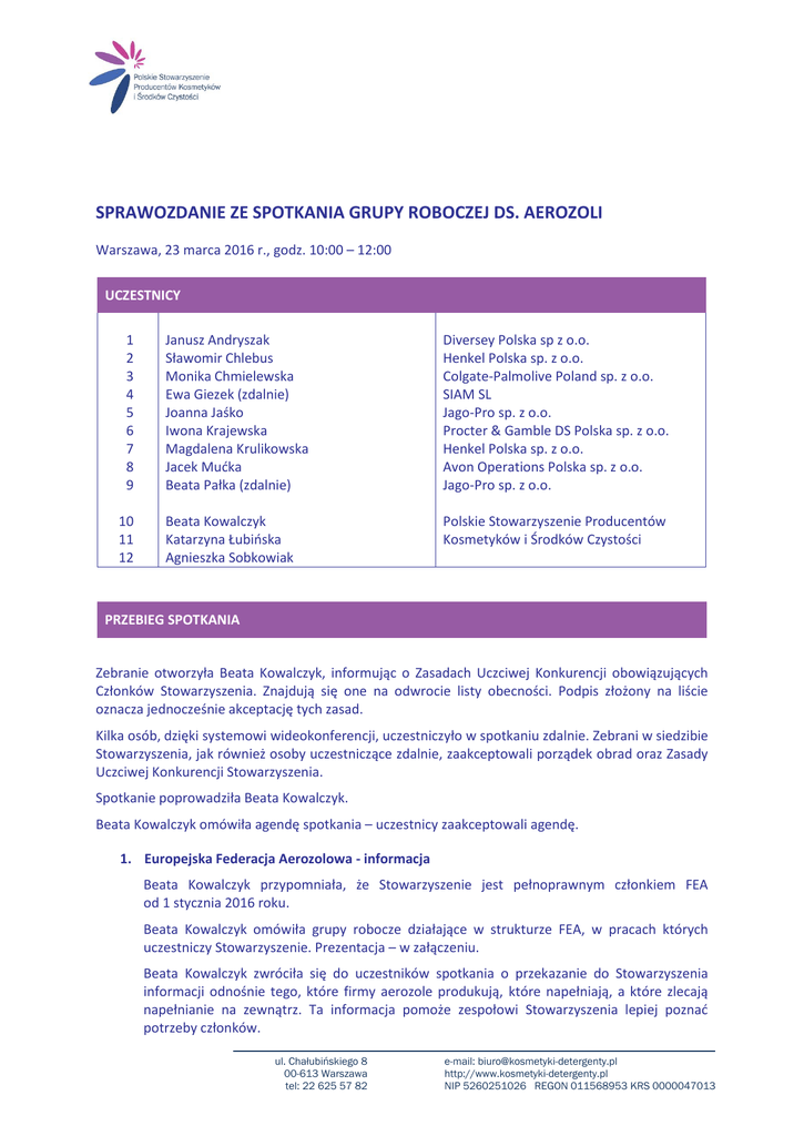 SPRAWOZDANIE ZE SPOTKANIA GRUPY ROBOCZEJ DS. AEROZOLI Warszawa, 23 marca 2016 r., godz. 10:00 – 12:00 UCZESTNICY 1 2 3 4 5 6 7 8 9 10 11 12 Janusz Andryszak Sławomir Chlebus Monika Chmielewska Ewa Giezek (zdalnie) Joanna Jaśko Iwona Krajewska Magdalena Krulikowska Jacek Mućka Beata Pałka (zdalnie) Diversey Polska sp z o.o. Henkel Polska sp. z o.o. Colgate-Palmolive Poland sp. z o.o. SIAM SL Jago-Pro sp. z o.o. Procter & Gamble DS Polska sp. z o.o. Henkel Polska sp. z o.o. Avon Operations Polska sp. z o.o. Jago-Pro sp. z o.o. Beata Kowalczyk Katarzyna Łubińska Agnieszka Sobkowiak Polskie Stowarzyszenie Producentów Kosmetyków i Środków Czystości PRZEBIEG SPOTKANIA Zebranie otworzyła Beata Kowalczyk, informując o Zasadach Uczciwej Konkurencji obowiązujących Członków Stowarzyszenia. Znajdują się one na odwrocie listy obecności. Podpis złożony na liście oznacza jednocześnie akceptację tych zasad. Kilka osób, dzięki systemowi wideokonferencji, uczestniczyło w spotkaniu zdalnie. Zebrani w siedzibie Stowarzyszenia, jak również osoby uczestniczące zdalnie, zaakceptowali porządek obrad oraz Zasady Uczciwej Konkurencji Stowarzyszenia. Spotkanie poprowadziła Beata Kowalczyk. Beata Kowalczyk omówiła agendę spotkania – uczestnicy zaakceptowali agendę. 1. Europejska Federacja Aerozolowa - informacja Beata Kowalczyk przypomniała, że Stowarzyszenie jest pełnoprawnym członkiem FEA od 1 stycznia 2016 roku. Beata Kowalczyk omówiła grupy robocze działające w strukturze FEA, w pracach których uczestniczy Stowarzyszenie. Prezentacja – w załączeniu. Beata Kowalczyk zwróciła się do uczestników spotkania o przekazanie do Stowarzyszenia informacji odnośnie tego, które firmy aerozole produkują, które napełniają, a które zlecają napełnianie na zewnątrz. Ta informacja pomoże zespołowi Stowarzyszenia lepiej poznać potrzeby członków. ul. Chałubińskiego 8 00-613 Warszawa tel: 22 625 57 82 e-mail: [email protected] http://www.kosmetyki-detergenty.pl NIP 5260251026 REGON 011568953 KRS 0000047013 Stowarzyszenie jako pełnoprawny członek FEA zyskało bezpłatny dostęp do wytycznych i przewodników opracowanych przez FEA. Beata Kowalczyk zwróciła się do członków o zgłaszanie zapotrzebowania na dostęp do nich - Stowarzyszenie przekaże je zainteresowanym firmom. 2. Zmian Dyrektywy ADD – 4ATP Beata Kowalczyk omówiła spodziewaną zmianę Dyrektywy ADD (4ATP). Prezentacja – w załączeniu. Beata Kowalczyk omówiła szczegółowe zmiany, które zawarte zostały w 4ATP. Dotyczą one oznakowania (pkt. 2.2.) – dostosowanie przepisów do rozporządzenia CLP, napełniania (pkt. 3.1.2.) - zwiększenie maksymalnego dopuszczalnego ciśnienia dla niepalnych gazów sprężonych oraz gazów rozpuszczonych pod ciśnieniem do 15 barów w przypadku metalowych dozowników aerozolowych. Wejście w życie nowych przepisów przewidziano na 1 sierpnia 2017 r. Ministerstwo Rozwoju, które reprezentuje Polskę w pracach na forum KE, popiera zmiany proponowane w 4ATP. Te zmiany popiera także FEA. 3. Przegląd Dyrektywy ADD – mapa drogowa Beata Kowalczyk omówiła mapę drogową dotyczącą przeglądu dyrektywy ADD i działań, które będą podejmowane. Przegląd powinien zakończyć się w I kwartale 2017 roku. Po tym przeglądzie KE przedstawi propozycje zmian dyrektywy ADD. Prezentacja – w załączeniu. Jest pierwszy formalny przegląd od roku 1975, kiedy Dyrektywa zaczęła obowiązywać. Dyrektywa w obecnej formie jest dyrektywą ‘starego podejścia’ – obejmuje aspekty techniczne. Jeśli Komisja Europejska podejmie decyzje o dostosowaniu jej do nowego podejścia, dyrektywa zostanie rozszerzona o nadzór rynku i kontrolę wyrobów. Beata Kowalczyk omówiła obszary oceny przeprowadzanej w ramach przeglądu dyrektywy, a także kryteria i pytania służące ocenie poszczególnych obszarów. Omówiła grupy podmiotów, które zostaną zaproszone do udziału w konsultacjach (on-line, internetowe konsultacje publiczne, indywidualne wywiady z kluczowymi interesariuszami – przedsiębiorcami, władzami publicznymi i konsumentami). Beata Kowalczyk poinformowała, że FEA będzie uczestniczyła w konsultacjach. Beata Kowalczyk zwróciła się do uczestników spotkania z prośbą o aktywny udział w konsultacjach – w ten sposób można mieć wpływ na kształt przyszłych rozwiązań prawnych. 4. Projekt PAIR – aktualny stan prac Beata Kowalczyk poinformowała, że celem projektu PAIR jest przeprowadzenie niezależnego przeglądu badań dotyczących bezpiecznego stosowania pojemników z tworzyw sztucznych o pojemności powyżej 220 ml. Prezentacja – w załączeniu. Prace nad projektem koordynuje FEA – Alain D’haese. Oceny danych w ramach projektu dokonuje firma consultingowa LNE. Beata Kowalczyk omówiła ramy czasowe projektu. Zakładano, że zakończy się on w grudniu 2015. Dotąd jednak nie dokonano oceny ani publikacji raportu końcowego – dane nadal są zbierane. Te, które uzyskano w zaplanowanym czasie w ocenie firmy konsultingowej nie były dostateczne dla wydania ostatecznej oceny. ul. Chałubińskiego 8 00-613 Warszawa tel: 22 625 57 82 e-mail: [email protected] http://www.kosmetyki-detergenty.pl NIP 5260251026 REGON 011568953 KRS 0000047013 Beata Kowalczyk przypomniała o pytaniach, z którymi zwróciła się do członków Stowarzyszenia: Czy prace nad projektem powinny być podjęte dla pojemników o pojemności niższej niż zakładano, tj. max do 800 ml czy też wstrzymać projekt do czasu pozyskania odpowiednich danych również dla pojemników o pojemności 1000 ml? Członkowie poparli rozwiązanie nr 1 i podjęcia prac w ramach projektu dla maksymalnej pojemności niższej niż zakładano czyli 800 ml. Taka opinia została przekazana do FEA. 5. Doświadczenia z inspekcji Członkowie nie zgłosili przypadków tego typu inspekcji. 6. Sprawy wniesione Katarzyna Łubińska przekazując dodatkowe informacje zwróciła uwagę na zm