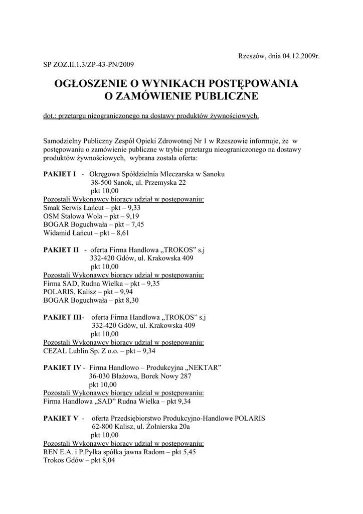 Rzeszów, dnia 04.12.2009r. SP ZOZ.II.1.3/ZP-43-PN/2009 OGŁOSZENIE O WYNIKACH POSTĘPOWANIA O ZAMÓWIENIE PUBLICZNE dot.: przetargu nieograniczonego na dostawy produktów żywnościowych. Samodzielny Publiczny Zespół Opieki Zdrowotnej Nr 1 w Rzeszowie informuje, że w postępowaniu o zamówienie publiczne w trybie przetargu nieograniczonego na dostawy produktów żywnościowych, wybrana została oferta: PAKIET I - Okręgowa Spółdzielnia Mleczarska w Sanoku 38-500 Sanok, ul. Przemyska 22 pkt 10,00 Pozostali Wykonawcy biorący udział w postępowaniu: Smak Serwis Łańcut – pkt – 9,33 OSM Stalowa Wola – pkt – 9,19 BOGAR Boguchwała – pkt – 7,45 Widamid Łańcut – pkt – 8,61 PAKIET II - oferta Firma Handlowa „TROKOS” s.j 332-420 Gdów, ul. Krakowska 409 pkt 10,00 Pozostali Wykonawcy biorący udział w postępowaniu: Firma SAD, Rudna Wielka – pkt – 9,35 POLARIS, Kalisz – pkt – 9,94 BOGAR Boguchwała – pkt 8,30 PAKIET III- oferta Firma Handlowa „TROKOS” s.j 332-420 Gdów, ul. Krakowska 409 pkt 10,00 Pozostali Wykonawcy biorący udział w postępowaniu: CEZAL Lublin Sp. Z o.o. – pkt – 9,34 PAKIET IV - Firma Handlowo – Produkcyjna „NEKTAR” 36-030 Błażowa, Borek Nowy 287 pkt 10,00 Pozostali Wykonawcy biorący udział w postępowaniu: Firma Handlowa „SAD” Rudna Wielka – pkt 9,34 PAKIET V - oferta Przedsiębiorstwo Produkcyjno-Handlowe POLARIS 62-800 Kalisz, ul. Żołnierska 20a pkt 10,00 Pozostali Wykonawcy biorący udział w postępowaniu: REN E.A. i P.Pyłka spółka jawna Radom – pkt 5,45 Trokos Gdów – pkt 8,04 PAKIET VI -oferta HURTOWNIA WIDAN 37-700 Przemyśl, ul. Jasińskiego 56B pkt 10,00 Pozostali Wykonawcy biorący udział w postępowaniu: REN E.A. i P.Pyłka Spółka jawna Radom – pkt -9,50 Firma Prima, Mielec – pkt 9,66 WIDAMID Sp. Z o.o. Łańcut – pkt – 9,23 PAKIET VII - oferta Firma Handlowo- Produkcyjna „NEKTAR” 36-030 Błażowa, Borek Nowy 287 pkt 10,00 Pozostali Wykonawcy biorący udział w postępowaniu: Firma Handlowa „SAD” Rudna Wielka – pkt 9,02 PAKIET VIII -oferta WIDAMID Sp. Z o.o. 37-100 Łańcut, ul. Składowa 2 pkt 10,00 Pozostali Wykonawcy biorący udział w postępowaniu: Firma Prima, Mielec – pkt 8,36 Firma Handlowa „SAD” Rudna Wielka – pkt 8,34 Hurtownia WIDAN Przemyśl – pkt 7,86 REKIN Paszczyna – pkt – 9,91 REN E.A. i P. Pyłka Spółka Jawna Radom – pkt – 7,81 Wybrane oferty były najkorzystniejsze w oparciu o przyjęte kryterium (cena – 100%) wyboru ofert. Umowy z wybranymi Wykonawcami zostaną zawarte w terminie powyżej 7 dni po dostarczeniu dokumentów na podstawie których Wykonawcy złożyli oświadczenie zgodnie z Ustawą z dnia 11 maja 2001 r o warunkach zdrowotnych żywności i żywienia. Termin dostarczenia przedmiotowych dokumentów upływa w dniu 11.12.2009 r. Dziękujemy za udział w postępowaniu.