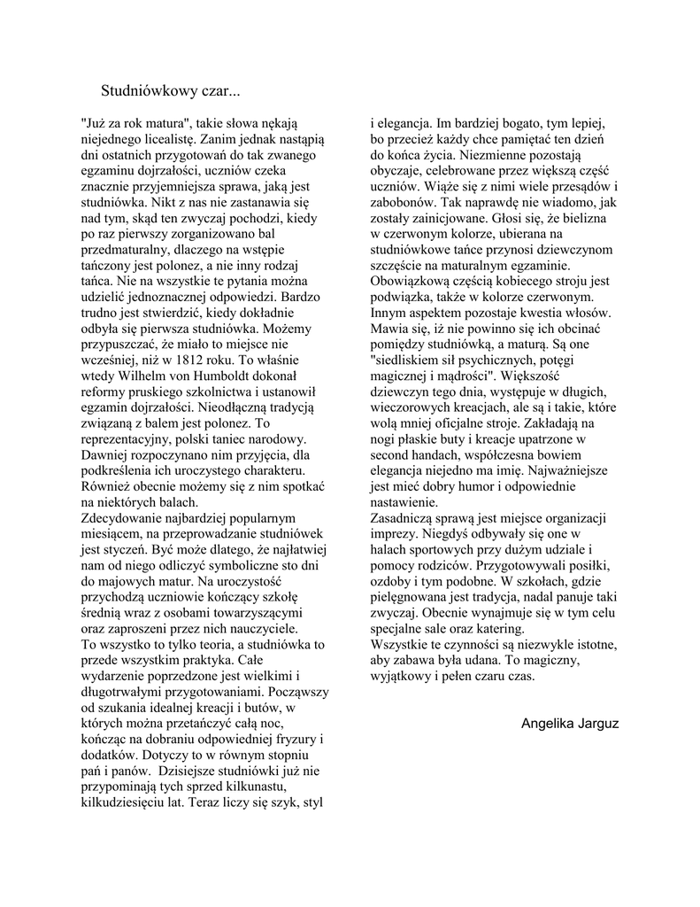 Studniówkowy czar... "Już za rok matura", takie słowa nękają niejednego licealistę. Zanim jednak nastąpią dni ostatnich przygotowań do tak zwanego egzaminu dojrzałości, uczniów czeka znacznie przyjemniejsza sprawa, jaką jest studniówka. Nikt z nas nie zastanawia się nad tym, skąd ten zwyczaj pochodzi, kiedy po raz pierwszy zorganizowano bal przedmaturalny, dlaczego na wstępie tańczony jest polonez, a nie inny rodzaj tańca. Nie na wszystkie te pytania można udzielić jednoznacznej odpowiedzi. Bardzo trudno jest stwierdzić, kiedy dokładnie odbyła się pierwsza studniówka. Możemy przypuszczać, że miało to miejsce nie wcześniej, niż w 1812 roku. To właśnie wtedy Wilhelm von Humboldt dokonał reformy pruskiego szkolnictwa i ustanowił egzamin dojrzałości. Nieodłączną tradycją związaną z balem jest polonez. To reprezentacyjny, polski taniec narodowy. Dawniej rozpoczynano nim przyjęcia, dla podkreślenia ich uroczystego charakteru. Również obecnie możemy się z nim spotkać na niektórych balach. Zdecydowanie najbardziej popularnym miesiącem, na przeprowadzanie studniówek jest styczeń. Być może dlatego, że najłatwiej nam od niego odliczyć symboliczne sto dni do majowych matur. Na uroczystość przychodzą uczniowie kończący szkołę średnią wraz z osobami towarzyszącymi oraz zaproszeni przez nich nauczyciele. To wszystko to tylko teoria, a studniówka to przede wszystkim praktyka. Całe wydarzenie poprzedzone jest wielkimi i długotrwałymi przygotowaniami. Począwszy od szukania idealnej kreacji i butów, w których można przetańczyć całą noc, kończąc na dobraniu odpowiedniej fryzury i dodatków. Dotyczy to w równym stopniu pań i panów. Dzisiejsze studniówki już nie przypominają tych sprzed kilkunastu, kilkudziesięciu lat. Teraz liczy się szyk, styl i elegancja. Im bardziej bogato, tym lepiej, bo przecież każdy chce pamiętać ten dzień do końca życia. Niezmienne pozostają obyczaje, celebrowane przez większą część uczniów. Wiąże się z nimi wiele przesądów i zabobonów. Tak naprawdę nie wiadomo, jak zostały zainicjowane. Głosi się, że bielizna w czerwonym kolorze, ubierana na studniówkowe tańce przynosi dziewczynom szczęście na maturalnym egzaminie. Obowiązkową częścią kobiecego stroju jest podwiązka, także w kolorze czerwonym. Innym aspektem pozostaje kwestia włosów. Mawia się, iż nie powinno się ich obcinać pomiędzy studniówką, a maturą. Są one "siedliskiem sił psychicznych, potęgi magicznej i mądrości". Większość dziewczyn tego dnia, występuje w długich, wieczorowych kreacjach, ale są i takie, które wolą mniej oficjalne stroje. Zakładają na nogi płaskie buty i kreacje upatrzone w second handach, współczesna bowiem elegancja niejedno ma imię. Najważniejsze jest mieć dobry humor i odpowiednie nastawienie. Zasadniczą sprawą jest miejsce organizacji imprezy. Niegdyś odbywały się one w halach sportowych przy dużym udziale i pomocy rodziców. Przygotowywali posiłki, ozdoby i tym podobne. W szkołach, gdzie pielęgnowana jest tradycja, nadal panuje taki zwyczaj. Obecnie wynajmuje się w tym celu specjalne sale oraz katering. Wszystkie te czynności są niezwykle istotne, aby zabawa była udana. To magiczny, wyjątkowy i pełen czaru czas. Angelika Jarguz