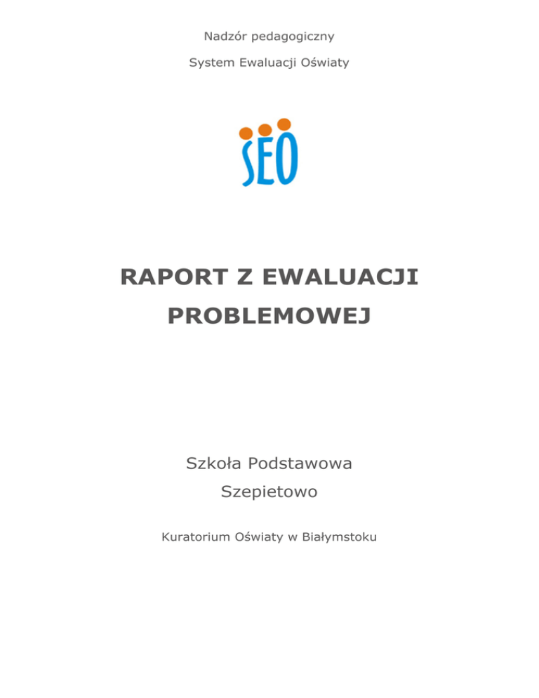 Nadzór pedagogiczny System Ewaluacji Oświaty RAPORT Z EWALUACJI PROBLEMOWEJ Szkoła Podstawowa Szepietowo Kuratorium Oświaty w Białymstoku Wstęp Prezentowany raport jest rezultatem ewaluacji zewnętrznej przeprowadzonej w szkole przez wizytatorów do spraw ewaluacji. Ewaluacja zewnętrzna polega na zbieraniu i analizowaniu informacji na temat funkcjonowania szkoły w obszarach wyznaczonych przez wymagania państwa: 1. Szkoła lub placówka realizuje koncepcję pracy ukierunkowaną na rozwój uczniów. 2. Procesy edukacyjne są zorganizowane w sposób sprzyjający uczeniu się. 3. Uczniowie nabywają wiadomości i umiejętności określone w podstawie programowej. 4. Uczniowie są aktywni. 5. Kształtowane są postawy i respektowane normy społeczne. 6. Szkoła lub placówka wspomaga rozwój uczniów, z uwzględnieniem ich indywidualnej sytuacji. 7. Nauczyciele współpracują w planowaniu i realizowaniu procesów edukacyjnych. 8. Promowana jest wartość edukacji. 9. Rodzice są partnerami szkoły lub placówki. 10. Wykorzystywane są zasoby szkoły lub placówki oraz środowiska lokalnego na rzecz wzajemnego rozwoju. 11. Szkoła lub placówka, organizując procesy edukacyjne, uwzględnia wnioski z analizy wyników sprawdzianu, egzaminu gimnazjalnego, egzaminu maturalnego, egzaminu potwierdzającego kwalifikacje zawodowe i egzaminu potwierdzającego kwalifikacje w zawodzie oraz innych badań zewnętrznych i wewnętrznych. 12. Zarządzanie szkołą lub placówką służy jej rozwojowi. Ewaluacja ma także na celu ustalenie, czy szkoła spełnia badane wymagania zawarte w rozporządzeniu Ministra Edukacji Narodowej z dnia 6.08.2015 r. Szkoła może spełniać wymagania na poziomie podstawowym i podejmować działania z wysokiego poziomu wymagania. Szkoła Podstawowa 2/29 Opis metodologii Badanie zostało zrealizowane w dniach 16-11-2015 - 18-11-2015 przez zespół wizytatorów ds. ewaluacji, w skład którego weszli: Elżbieta Kamińska, Anna Topór. Badaniem objęto 71 uczniów (ankieta), 61 rodziców (ankieta i wywiad grupowy) i 29 nauczycieli (ankieta i wywiad grupowy). Przeprowadzono wywiad indywidualny z dyrektorem placówki, a także obserwacje lekcji, placówki i analizę dokumentacji. Na podstawie zebranych danych został sporządzony raport, który obejmuje podstawowe obszary działania szkoły. Wyjaśnienie skrótów dla narzędzi: OZ - Akusz obserwacji zajęć AD - Kwestionariusz ankiety dla dyrektora/dyrektorki szkoły AN - Kwestionariusz ankiety dla nauczycieli AR - Kwestionariusz ankiety dla rodziców AMD - Kwestionariusz ankiety dla uczniów "Mój dzień" AMS - Kwestionariusz ankiety dla uczniów "Moja szkoła" APW - Kwestionariusz ankiety poewaluacyjnej dla wizytatora ADZ - Kwestionariusz badania "Analiza danych zastanych" WN - Scenariusz wywiadu grupowego z nauczycielami WR - Scenariusz wywiadu grupowego z rodzicami WD - Scenariusz wywiadu z dyrektorem/dyrektorką szkoły WNPO - Scenariusz wywiadu z nauczycielem po obserwacji WNO - Scenariusz wywiadu z zespołem nauczycieli uczących w jednym oddziale Szkoła Podstawowa 3/29 Obraz placówki Szkoła Podstawowa im. Kardynała Stefana Wyszyńskiego w Szepietowie jest szkołą publiczną, funkcjonującą w budynku obok Publicznego Gimnazjum w Szepietowie. Organem prowadzącym jest Burmistrz Szepietowa. Budynek jest przestronny, sale lekcyjne są systematycznie doposażane i remontowane. W chwili obecnej w 15 oddziałach naukę pobiera 307 uczniów. Dzieci poza lekcjami mogą korzystać ze świetlicy, biblioteki z Internetowym Centrum Informacji Multimedialnej i stołówki w gimnazjum. W listopadzie 2015 roku w Szkole Podstawowej w Szepietowie przeprowadzono ewaluację problemową. Zakres badania obejmował trzy wymagania: ● Uczniowie nabywają wiadomości i umiejętności określone w podstawie programowej; ● Szkoła wspomaga rozwój uczniów, uwzględniając ich indywidualną sytuację; ● Szkoła organizując procesy edukacyjne, uwzględnia wnioski z analizy wyników sprawdzianu oraz innych badań zewnętrznych i wewnętrznych. Badanie wskazuje, że wyniki uczniów uzyskiwane na sprawdzianie zewnętrznym w ciągu ostatnich trzech lat, mieszczą się 4 - 5 staninie (wynik niżej średniego, średni), dzieci odnoszą sukcesy w konkursach (m.in. przedmiotowych uzyskując tytuły laureata i finalisty) i zawodach sportowych. Podczas lekcji nauczyciele wykorzystują zalecane warunki i sposoby realizacji podstawy programowej, kształtują umiejętności kluczowe oraz monitorują nabywanie wiedzy i umiejętności przez uczniów. Nauczyciele indywidualizują proces nauczania uwzględniając potrzeby uczniów. Zajęcia pozalekcyjne organizowane w szkole są interesujące dla uczniów i spełniają ich oczekiwania. Dzieci w trudnej sytuacji społeczno-ekonomicznej, dzieci o specjalnych potrzebach edukacyjnych i z problemami zdrowotnymi objęte są stałą opieką nauczycieli i pedagoga szkolnego, pomocą psychologiczno-pedagogiczną oraz pomoc materialną. Wychowawcy i nauczyciele służą rodzicom radą i wsparciem w sytuacjach trudnych. W szkole analizuje się wyniki sprawdzianów zewnętrznych oraz ewaluacji wewnętrznej, sformułowane na tej podstawie wnioski wykorzystuje się, m. in. w procesie nauczania, do wprowadzania zmian w ofercie edukacyjnej szkoły. Zapraszamy Państwa do lektury raportu, w którym znajdziecie Państwo więcej informacji o szkole. Szkoła Podstawowa 4/29 Informacja o placówce Nazwa placówki Patron Szkoła Podstawowa Kardynał Stefan Wyszyński Typ placówki Szkoła podstawowa Miejscowość Szepietowo Ulica 1 Maja Numer 2 Kod pocztowy 18-210 Urząd pocztowy Szepietowo Telefon 0864760245 Fax 0864762733 Www spszepietowo.edu.pl Regon 00027137700000 Publiczność publiczna Kategoria uczniów Dzieci lub młodzież Charakter brak specyfiki Uczniowie, wychow., słuchacze 307 Oddziały 15 Nauczyciele pełnozatrudnieni 19.00 Nauczyciele niepełnozat. (stos.pracy) 11.00 Nauczyciele niepełnozat._(w etatac