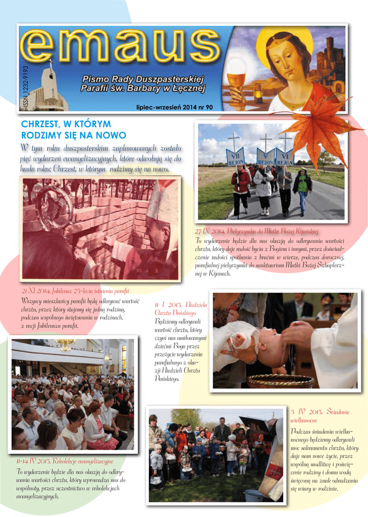 ISSN 1232-9193 ISSN 1232-9193 lipiec-wrzesień 2014 nr 90 CHRZEST, W KTÓRYM RODZIMY SIĘ NA NOWO W tym roku duszpasterskim zaplanowanych zostało pięć wydarzeń ewangelizacyjnych, które odwołują się do hasła roku: Chrzest, w którym rodzimy się na nowo. 27 IX 2014. Pielgrzymka do Matki Bożej Kijańskiej To wydarzenie będzie dla nas okazją do odkrywania wartości chrztu, który daje radość bycia z Bogiem i innymi, przez doświadczenie radości spotkania z braćmi w wierze, podczas dorocznej, parafialnej pielgrzymki do sanktuarium Matki Bożej Szkaplerznej w Kijanach. 21 XI 2014. Jubileusz 25-lecia istnienia parafii Wszyscy mieszkańcy parafii będą odkrywać wartość chrztu, przez który stajemy się jedną rodziną, podczas wspólnego świętowania w rodzinach, z racji Jubileuszu parafii. 11 I 2015. Niedziela Chrztu Pańskiego Będziemy odkrywali wartość chrztu, który czyni nas umiłowanymi dziećmi Boga przez przeżycie wydarzenia parafialnego z okazji Niedzieli Chrztu Pańskiego. 5 IV 2015. Śniadanie wielkanocne 11-14 IV 2015. Rekolekcje ewangelizacyjne To wydarzenie będzie dla nas okazją do odkrywania wartości chrztu, który wprowadza nas do wspólnoty, przez uczestnictwo w rekolekcjach ewangelizacyjnych. Podczas śniadania wielkanocnego będziemy odkrywali moc sakramentu chrztu, który daje nam nowe życie, przez wspólną modlitwę i poświęcenie rodziny i domu wodą święconą na znak odradzania się wiary w rodzinie. Emaus Pismo Rady Duszpasterskiej KRONIKA Czerwiec 01.06.2014. Gościliśmy w parafii ks. Andrzeja Dudzińskiego, sędziego Sądu Metropolitalnego i kapelana Bractwa Miłosierdzia im. św. Brata Alberta w Lublinie. Podczas Mszy św. ks. Andrzej głosił homilię, dzieląc się doświadczeniem pracy w ośrodku pomocy dla bezdomnych. Wraz z trzema podopiecznymi w ramach akcji Podziel się chlebem prowadził zbiórkę na rzecz potrzebujących. 03.06.2014. Sakrament Bierzmowania. Podczas Mszy św. o godz. 18.00 ks. bp Józef Wróbel udzielił sakramentu dojrzałości chrześcijańskiej sześćdziesięcioosobowej grupie młodzieży. Przygotowanie kandydatów trwało cały rok i obejmowało katechezy, cotygodniowe spotkania w grupach i dwie tury rekolekcji ewangelizacyjnych: kurs Filipa i kurs Andrzeja. Do przyjęcia sakramentu dojrzałości chrześcijańskiej przygotowywał młodzież ks. Krzysztof Szymański wraz z grupą animatorów. Po Mszy św. bierzmowani otrzymali z rąk ks. Biskupa egzemplarz Pisma św. 07.06.2014. Wigilia Zesłania Ducha Świętego. Po wieczornej Mszy św. czuwanie modlitewne poprowadziła wspólnota Szkoła Modlitwy z ks. Michałem Gałusem. Czuwanie zakończył Apel Jasnogórski o godz. 21.00. 09.06.2014. Dzień Posłańca. Msza św. o godz. 18.00 sprawowana była w intencji wszystkich zaangażowanych w Parafialny Program Odnowy i Ewangelizacji. Liturgii przewodniczył i homilię wygłosił ks. proboszcz Andrzej Lupa. W parafialnej auli Posłańcy otrzymali konspekt i obejrzeli przedstawienie o św. Janie Pawle II. Dzieci wspaniale wcieliły się w role najbliższych Papieża i Jego samego. Inscenizacja przygotowana została pod kierunkiem s. Doroty Ostolskiej i katechetki Teresy Okoń. 12.06.2014. Drugi czwartek miesiąca. Kolejne nabożeństwo różańcowe w intencji dobrego wychowania dzieci i młodzieży przygotowane przez Akademię Młodzieżową. 13.06.2014. Wspomnienie św. Antoniego – święto patronalne Rejonu VII. Msza św. o godz. 18.00 sprawowana była w intencji mieszkańców tego Rejonu. Na zakończenie Eucharystii odmówiona została modlitwa zawierzenia za wstawiennictwem świętego Patrona. 15.06.2014. Msza św. prymicyjna ks. Tadeusza Faca, naszego byłego parafianina, sprawowana była o godz. 12.45. Na zakończenie Eucharystii ks. Prymicjant udzielił indywidualnego błogosławieństwa wszystkim uczestnikom liturgii. 2 Ks. Tadeusz Fac święcenia kapłańskie przyjął w Archikatedrze Lubelskiej w dniu 7 czerwca br. z rąk ks. abpa Stanisława Budzika. 15.06.2014. Wydarzenie parafialne pod hasłem: Budujemy jedność na wzór Trójcy Świętej. Oprawę liturgiczną Mszy św. przygotowały poszczególne Rejony. Podczas Eucharystii w procesji z darami niesiona była ikona Trójcy Świętej wyrażająca naszą gotowość do budowania jedności między braćmi. Gestem wydarzenia było odczytanie w rodzinach tekstu nauczania Kościoła, wzywającego do budowania jedności oraz modlitwa o jedność w rodzinach, Grupach Sąsiedzkich, parafii i całym Kościele. 19.06.2014. Uroczystość Bożego Ciała. Po Mszy św. o godz. 10.00 kilkutysięczna rzesza wiernych wyruszyła ulicami osiedli w procesji eucharystycznej do czterech ołtarzy. Procesję zakończyło błogosławieństwo Najświętszym Sakramentem, po którym wierni dzielili się ofiarowanym na tę uroczystość chlebem. 22.06.2014. Zakończenie roku duszpasterskiego dla wszystkich grup formacyjnych i służb pastoralnych. Mszę św. dziękczynną o godz. 18.00 sprawował ks. proboszcz Andrzej Lupa, homilię wygłosił ks. Józef Włoszek. 25.06.2014. Dzień skupienia dla czynnych i wspierających członków Legionu Maryi. 26.06.2014. Zakończenie oktawy Bożego Ciała. Podczas wieczornej Mszy św. poświęcone zostały wianki z pierwszych kwiatów i ziół leczniczych. Po Eucharystii wierni uczestniczyli w procesji do czterech ołtarzy. Dzieci biorące udział w oktawie otrzymały indywidualne błogosławieństwo oraz słodycze. 27.06.2014. Zakończenie roku szkolnego dla dzieci i młodzieży. Msza św. dziękczynna o godz. 9.00 sprawowana była dla uczniów Zespołu Szkół nr 2. Podczas tej Mszy św. 20 uczniów otrzymało dyplomy ukończenia dziewięciu pierwszych piątków miesiąca. O godz. 10.00 sprawowana była Msza św. dla szkół średnich. Lipiec 03.07.2014. XIV Dekanalna Piesza Pielgrzymka do Archikatedry Lubelskiej na uroczystości odpustowe. Pielgrzymce przewodniczył ks. Janusz Rzeźnik -Proboszcz parafii św. Marii Magdaleny. Uczestnicz