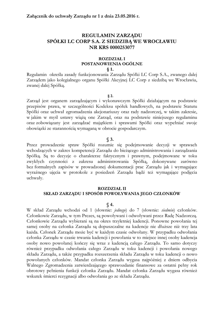 Załącznik do uchwały Zarządu nr 1 z dnia 23.05.2016 r. REGULAMIN ZARZĄDU SPÓŁKI LC CORP S.A. Z SIEDZIBĄ WE WROCŁAWIU NR KRS 0000253077 ROZDZIAŁ I POSTANOWIENIA OGÓLNE § 1. Regulamin określa zasady funkcjonowania Zarządu Spółki LC Corp S.A., zwanego dalej Zarządem jako kolegialnego organu Spółki Akcyjnej LC Corp z siedzibą we Wrocławiu, zwanej dalej Spółką. § 2. Zarząd jest organem zarządzającym i wykonawczym Spółki działającym na podstawie przepisów prawa, w szczególności Kodeksu spółek handlowych, na podstawie Statutu Spółki oraz uchwał zgromadzenia akcjonariuszy oraz rady nadzorczej, w takim zakresie, w jakim w myśl ustawy wiążą one Zarząd, oraz na podstawie niniejszego regulaminu oraz zobowiązany jest zarządzać majątkiem i sprawami Spółki oraz wypełniać swoje obowiązki ze starannością wymaganą w obrocie gospodarczym. § 3. Przez prowadzenie spraw Spółki rozumie się podejmowanie decyzji w sprawach wchodzących w zakres kompetencji Zarządu do bieżącego administrowania i zarządzania Spółką. Są to decyzje o charakterze faktycznym i prawnym, podejmowane w toku zwykłych czynności z zakresu administrowania Spółką, dokonywane zarówno bez formalnych zapisów w prowadzonej dokumentacji prac Zarządu jak i wymagające wyraźnego ujęcia w protokole z posiedzeń Zarządu bądź też wymagające podjęcia uchwały. ROZDZIAŁ II SKŁAD ZARZĄDU I SPOSÓB POWOŁYWANIA JEGO CZŁONKÓW § 4. W skład Zarządu wchodzi od 1 (słownie: jednego) do 7 (słownie: siedmiu) członków. Członkowie Zarządu, w tym Prezes, są powoływani i odwoływani przez Radę Nadzorczą. Członkowie Zarządu wybierani są na okres trzyletniej kadencji. Ponowne powołania tej samej osoby na członka Zarządu są dopuszczalne na kadencje nie dłuższe niż trzy lata każda. Członek Zarządu może być w każdym czasie odwołany. W przypadku odwołania członka Zarządu w czasie trwania kadencji i powołania w to miejsce innej osoby kadencja osoby nowo powołanej kończy się wraz z kadencją całego Zarządu. To samo dotyczy również przypadku odwołania całego Zarządu w toku kadencji i powołania nowego składu Zarządu, a także przypadku rozszerzenia składu Zarządu w toku kadencji o nowo powołanych członków. Mandat członka Zarządu wygasa najpóźniej z dniem odbycia Walnego Zgromadzenia zatwierdzającego sprawozdanie finansowe za ostatni pełny rok obrotowy pełnienia funkcji członka Zarządu. Mandat członka Zarządu wygasa również wskutek śmierci rezygnacji albo odwołania go ze składu Zarządu. ROZDZIAŁ III TRYB PRACY ZARZĄDU ORAZ ZAKRES DZIAŁALNOŚCI ZARZĄDU § 5. 1. Prezes Zarządu organizuje i koordynuje działalność Zarządu. Do kompetencji Prezesa Zarządu należy w szczególności: a) kształtowanie polityki produktowej oraz polityki sprzedaży produktów, b) nadzór nad komórką audytu wewnętrznego działającą w Spółce, c) prowadzenie polityki kadrowej Spółki. 2. W razie nieobecności Prezesa Zarządu oraz w każdym innym przypadku, gdy nie może on wykonywać swoich obowiązków, na ten czas w sprawach wewnętrznych Spółki zastępuje go Wiceprezes Zarządu, a pod jego nieobecność Członek Zarządu wskazany przez Prezesa Zarządu. 3. Do kompetencji Zarządu należą wszelkie sprawy nie zastrzeżone do kompetencji Walnego Zgromadzenia lub Rady Nadzorczej. 1. 2. 3. 4. 5. § 6. Zarząd prowadzi sprawy Spółki i ją reprezentuje, zgodnie z przyjętą w Spółce zasadą reprezentacji. Prowadzenie spraw Spółki odnosi się do wewnętrznej sfery działalności Spółki. Przy wykonywaniu swoich funkcji Zarząd obowiązany jest do ścisłego przestrzegania przepisów prawa, postanowień Statutu, a także uchwał władz Spółki. W przypadku Zarządu wieloosobowego, do składania oświadczeń w imieniu spółki wymagane jest współdziałanie dwóch członków Zarządu albo jednego członka Zarządu łącznie z prokurentem. Każdy z członków Zarządu jest uprawniony i zobowiązany do przyjmowania oświadczeń woli oraz pism kierowanych do Spółki zarówno w lokalu Spółki jak i poza nim. Członek Zarządu, na którego ręce wpłynęło oświadczenie woli lub pismo kierowane do Spółki, jest zobowiązany niezwłocznie nadać bieg sprawie według procedur obowiązujących w Spółce. W umowach i sporach między Spółką a członkiem Zarządu Spółkę reprezentuje Rada Nadzorcza lub pełnomocnik powołany uchwałą Walnego Zgromadzenia Akcjonariuszy Spółki. § 7. 1. Podstawową formą pracy Zarządu jest odbywanie posiedzeń i podejmowanie uchwał związanych z prowadzeniem spraw Spółki i wykonywaniem zarządu 2. Uchwały Zarządu wymagają, w szczególności: a) przyjęcie regulaminu Zarządu z zastrzeżeniem § 13 ust. 3 niniejszego Regulaminu, b) przyjęcie i zmiana struktury organizacyjnej Spółki, c) tworzenie i likwidacja oddziałów, d) powołanie prokurenta z zastrzeżeniem § 20 pkt p) Statutu Spółki, e) zaciąganie i udzielanie pożyczek oraz zaciąganie kredytów, z zastrzeżeniem § 20 pkt q) Statutu Spółki, f) przyjęcie rocznych planów działalności gospodarczej (planów rzeczowofinansowych), planów inwestycyjnych, strategicznych planów wieloletnich oraz planów inwestycyjnych, 2|S tr o na 3. 4. 5. 6. 7. 1. 2. 3. 4. 5. 6. 7. g) zaciąganie zobowiązań warunkowych, w tym udzielanie przez Spółkę gwarancji, poręczeń oraz wystawianie weksli, z zastrzeżeniem § 20 pkt s) Statutu Spółki, h) zbycie i nabycie składników aktywów trwałych, w tym nieruchomości lub udziałów w nieruchomości, z zastrzeżeniem postanowień § 20 pkt r) Statutu Spółki, i) sprawy, o których rozpatrzenie Zarząd zwraca się do Rady Nadzorczej lub Walnego Zgromadzenia w tym przygotowanie stosownych projektów uchwał tych organów Spółki, j) powołanie pełnomocników Zarządu. Każdy członek Zarządu może żądać aby konkretne sprawy były przedmiotem uchwały Zarządu. Członkowie Zarządu mo