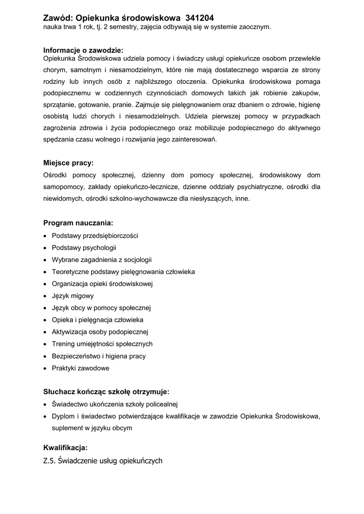 Zawód: Opiekunka środowiskowa 341204 nauka trwa 1 rok, tj. 2 semestry, zajęcia odbywają się w systemie zaocznym. Informacje o zawodzie: Opiekunka Środowiskowa udziela pomocy i świadczy usługi opiekuńcze osobom przewlekle chorym, samotnym i niesamodzielnym, które nie mają dostatecznego wsparcia ze strony rodziny lub innych osób z najbliższego otoczenia. Opiekunka środowiskowa pomaga podopiecznemu w codziennych czynnościach domowych takich jak robienie zakupów, sprzątanie, gotowanie, pranie. Zajmuje się pielęgnowaniem oraz dbaniem o zdrowie, higienę osobistą ludzi chorych i niesamodzielnych. Udziela pierwszej pomocy w przypadkach zagrożenia zdrowia i życia podopiecznego oraz mobilizuje podopiecznego do aktywnego spędzania czasu wolnego i rozwijania jego zainteresowań. Miejsce pracy: Ośrodki pomocy społecznej, dzienny dom pomocy społecznej, środowiskowy dom samopomocy, zakłady opiekuńczo-lecznicze, dzienne oddziały psychiatryczne, ośrodki dla niewidomych, ośrodki szkolno-wychowawcze dla niesłyszących, inne. Program nauczania: Podstawy przedsiębiorczości Podstawy psychologii Wybrane zagadnienia z socjologii Teoretyczne podstawy pielęgnowania człowieka Organizacja opieki środowiskowej Język migowy Język obcy w pomocy społecznej Opieka i pielęgnacja człowieka Aktywizacja osoby podopiecznej Trening umiejętności społecznych Bezpieczeństwo i higiena pracy Praktyki zawodowe Słuchacz kończąc szkołę otrzymuje: Świadectwo ukończenia szkoły policealnej Dyplom i świadectwo potwierdzające kwalifikacje w zawodzie Opiekunka Środowiskowa, suplement w języku obcym Kwalifikacja: Z.5. Świadczenie usług opiekuńczych