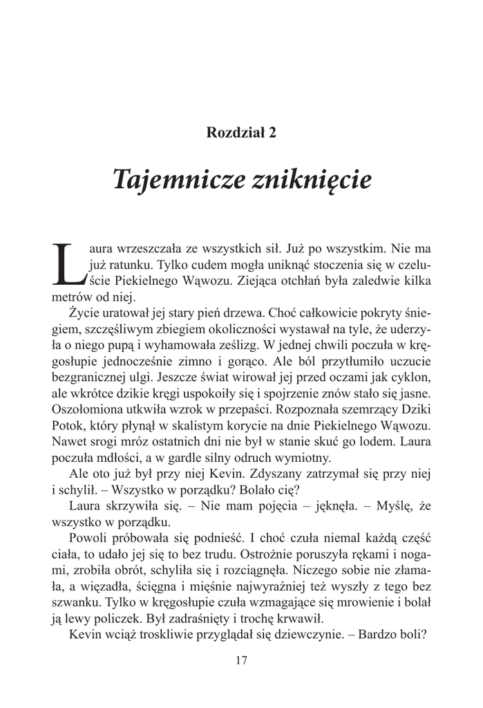 Rozdział 2 Tajemnicze zniknięcie L aura wrzeszczała ze wszystkich sił. Już po wszystkim. Nie ma już ratunku. Tylko cudem mogła uniknąć stoczenia się w czeluście Piekielnego Wąwozu. Ziejąca otchłań była zaledwie kilka metrów od niej. Życie uratował jej stary pień drzewa. Choć całkowicie pokryty śniegiem, szczęśliwym zbiegiem okoliczności wystawał na tyle, że uderzyła o niego pupą i wyhamowała ześlizg. W jednej chwili poczuła w kręgosłupie jednocześnie zimno i gorąco. Ale ból przytłumiło uczucie bezgranicznej ulgi. Jeszcze świat wirował jej przed oczami jak cyklon, ale wkrótce dzikie kręgi uspokoiły się i spojrzenie znów stało się jasne. Oszołomiona utkwiła wzrok w przepaści. Rozpoznała szemrzący Dziki Potok, który płynął w skalistym korycie na dnie Piekielnego Wąwozu. Nawet srogi mróz ostatnich dni nie był w stanie skuć go lodem. Laura poczuła mdłości, a w gardle silny odruch wymiotny. Ale oto już był przy niej Kevin. Zdyszany zatrzymał się przy niej i schylił. – Wszystko w porządku? Bolało cię? Laura skrzywiła się. – Nie mam pojęcia – jęknęła. – Myślę, że wszystko w porządku. Powoli próbowała się podnieść. I choć czuła niemal każdą część ciała, to udało jej się to bez trudu. Ostrożnie poruszyła rękami i nogami, zrobiła obrót, schyliła się i rozciągnęła. Niczego sobie nie złamała, a więzadła, ścięgna i mięśnie najwyraźniej też wyszły z tego bez szwanku. Tylko w kręgosłupie czuła wzmagające się mrowienie i bolał ją lewy policzek. Był zadraśnięty i trochę krwawił. Kevin wciąż troskliwie przyglądał się dziewczynie. – Bardzo boli? 17 – Da się przeżyć – odparła i zmusiła się do uśmiechu. Chłopak odetchnął z ulgą. – Masz szczęście! Wyglądało to naprawdę poważnie. Co się właściwie stało? Przecież nigdy nie miałaś problemów w tym miejscu, prawda? – Zgadza się – Laura przez chwilę spoglądała przed siebie w milczeniu. Też tego nie rozumiem. Wiązania mi się nagle wypięły, jedno i drugie, a potem to już zaliczyłam ten lot. – Wiązania? – Kevin spojrzał na nią ze zdziwieniem. – Ale... masz przecież nowe narty? – Tak. Dostałam je dopiero co, pod choinkę. Ale żeby oba wiązania były zepsute, to trochę dziwne, właściwie wykluczone. I dlatego myślę, że... – urwała i zapatrzyła się w dal. Zrobiła się nagle śmiertelnie poważna. – Co takiego? – dopytywał się Kevin. – Co sobie pomyślałaś? Laura spojrzała przenikliwie na chłopca. – Myślę, że coś tu brzydko pachnie! I mam już nawet pewne podejrzenia! – Mylisz się, Lauro, z pewnością się mylisz! – Sayelle Leander-Rüchlin, kręcąc głową, spoglądała na pasierbicę znad talerza z kolacją. – To byłby zbyt nieprawdopodobny zbieg okoliczności, gdyby doktor Schwartz spędzał urlop właśnie w Hinterthur! Czy sama nie wspominałaś, że chce polecieć na Karaiby? – No właśnie – przytaknęła Laura. – Tak przynajmniej mówił. Na ostatniej lekcji chemii przed feriami. Ale może w ostatniej chwili zmienił plany? Szturchnęła siedzącego obok niej Łukasza, który pochłaniał akurat przeogromną porcję duszonej potrawki z makaronem. – Czy mógłbyś mi podać miskę? Łukasz wydał z siebie odgłos niezadowolenia, ale sięgnął po stojącą przed nim salaterkę z najdelikatniejszej porcelany. Nakładając sobie potrawę na talerz, Laura rzuciła macosze wyzywające spojrzenie. – Tak czy inaczej... jestem całkowicie pewna, że ten człowiek z obsługi stoku to był nie kto inny, jak doktor Kwintus Schwartz. Sayelle skrzywiła twarz z niedowierzaniem. – A ja jestem przekonana, że się mylisz, bez wątpienia. Ale nawet gdyby to był on, to co by to miało wspólnego z upadkiem? 18 – Eee... – Laura wymieniła szybkie spojrzenie z bratem. Ten prawie niedostrzegalnie pokręcił głową. Łukasz miał rację. Ich macocha nie mogła się dowiedzieć, że Laura przypuszcza, iż ich nauczyciel chemii spowodował wypadek za pomocą umiejętności telekinetycznych. Sayelle wciąż nic nie wiedziała o tajemniczych wydarzeniach, które miały miejsce na zamku Ravensburg przed Świętami Bożego Narodzenia. Nawet nie przeczuwała, jakie zapierające dech w piersiach przygody dane im było przeżyć w trakcie poszukiwania Kielicha Jasności. Jakie groziły im niebezpieczeństwa, zanim profesor Morgenstern i Piastun Światła w ostatniej chwili zostali uratowani od pewnej śmierci, co uchroniło Ziemię i Aventerrę od zagłady. I oczywiście oboje zataili przed macochą fakt, że Laurze powierzono specjalną misję w odwiecznej walce Dobra i Zła, oraz że jako jedna ze Strażników Światła posiada nadzwyczajne umiejętności. Sayelle bez wątpienia by tego nie zrozumiała ani w to nie uwierzyła. Dla tej zajmującej się gospodarką dziennikarki liczyły się tylko fakty, które w każdej chwili można sprawdzić. To, że przywódca Czarnych z zamku Ravenstein otwarł jej wiązania za pomocą telekinezy, Sayelle uznałaby za całkowicie wykluczone i wyssane z palca. – Eee... – Laura znowu chrząknęła. – Ja, ee, straciłam równowagę, gdy ten typek wyprzedził mnie na środku stoku. – Ależ, Lauro, a cóż ten biedak mógł na to poradzić? – rzekł Maksymilian Longolius z uśmiechem. Jego świńskie oczka połyskiwały zza szpanerskich okularów. – Oczywiście, że nic. Nie twierdzę, że to jego wina. – Dziewczyna odwróciła się szybko. Nie mogła znieść jego widoku, choć Mister L. nigdy nie zrobił jej nic złego. Przeciwnie: zaprosił całą rodzinę na ferie zimowe, co było bardzo wspaniałomyślne z jego strony. Nawet jeśli jego jedynym celem było podlizanie się Sayelle. Młoda kobieta już dawno wpadła mu w oko i pewnie tylko z tego względu zatrudnił ją w „Gazecie”. Zrodziło to plotki wśród kolegów z pracy, ale również wzbudziło nieufność Laury. Jednak Sa