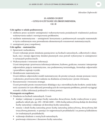 111 23. GDZIE CO JEST – CZYLI O CZYTANIU ZE ZROZUMIENIEM, CZ. II Mirosław Dąbrowski 23. GDZIE CO JEST – CZYLI O CZYTANIU ZE ZROZUMIENIEM, CZ. II Cele ogólne w szkole podstawowej: ſ zdobycie przez uczniów umiejętności wykorzystywania posiadanych wiadomości podczas wykonywania zadań i rozwiązywania problemów; ſ myślenie matematyczne – umiejętność korzystania z podstawowych narzędzi matematyki w życiu codziennym oraz prowadzenia elementarnych rozumowań matematycznych; ſ umiejętność pracy zespołowej. Cele ogólne – matematyka: ſ Sprawność rachunkowa. Uczeń wykonuje proste działania pamięciowe na liczbach naturalnych, całkowitych i ułamkach, zna i stosuje algorytmy działań pisemnych oraz potrafi wykorzystać te umiejętności w sytuacjach praktycznych. ſ Wykorzystanie i tworzenie informacji. Uczeń interpretuje i przetwarza informacje tekstowe, liczbowe, graficzne, rozumie i interpretuje odpowiednie pojęcia matematyczne, zna podstawową terminologię, formułuje odpowiedzi i prawidłowo zapisuje wyniki. ſ Modelowanie matematyczne. Uczeń dobiera odpowiedni model matematyczny do prostej sytuacji, stosuje poznane wzory i zależności, przetwarza tekst zadania na działania arytmetyczne i proste równania. ſ Rozumowanie i tworzenie strategii. Uczeń prowadzi proste rozumowanie składające się z niewielkiej liczby kroków, ustala kolejność czynności (w tym obliczeń) prowadzących do rozwiązania problemu, potrafi wyciągnąć wnioski z kilku informacji podanych w różnej postaci. Wymagania szczegółowe: ſ Działania na liczbach naturalnych. Uczeń: dodaje i odejmuje w pamięci liczby naturalne dwucyfrowe, liczby wielocyfrowe w przypadkach, takich jak, np. 230 + 80 lub 4600 – 1200; liczbę jednocyfrową dodaje do dowolnej liczby naturalnej i odejmuje od dowolnej liczby naturalnej; mnoży i dzieli liczbę naturalną przez liczbę naturalną jednocyfrową, dwucyfrową lub trzycyfrową pisemnie, w pamięci (w najprostszych przykładach) i za pomocą kalkulatora (w trudniejszych przykładach); wykonuje dzielenie z resztą liczb naturalnych; porównuje różnicowo i ilorazowo liczby naturalne; 112 23. GDZIE CO JEST – CZYLI O CZYTANIU ZE ZROZUMIENIEM, CZ. II ſ Zadania tekstowe. Uczeń: czyta ze zrozumieniem prosty tekst zawierający informacje liczbowe; wykonuje wstępne czynności ułatwiające rozwiązanie zadania, w tym rysunek pomocniczy lub wygodne dla niego zapisanie informacji i danych z treści zadania; dostrzega zależności między podanymi informacjami; dzieli rozwiązanie zadania na etapy, stosując własne, poprawne, wygodne dla niego strategie rozwiązania; weryfikuje wynik zadania tekstowego, oceniając sensowność rozwiązania. Pomoce: t piktogramy demonstracyjne: t piktogramy małe: t t t t t t stemple, kwadratowe tekturki (kartki), np. o wymiarach ok. 10 cm × 10 cm (jak najwięcej), program PIKTOFRUKTY (do ewentualnego wykorzystania), prezentacja (do ewentualnego wykorzystania), tabliczki suchościeralne (do ewentualnego wykorzystania), karty pracy (do ewentualnego wykorzystania). 23. GDZIE CO JEST – CZYLI O CZYTANIU ZE ZROZUMIENIEM, CZ. II Przebieg sytuacji dydaktycznej: 1. Zaczynamy od jednej czy dwóch zagadek analogicznych do tych z części I scenariusza albo od zabawy w Żywe owoce. Organizujemy działania uczniów tak, aby pracowali w parach albo większych grupach oraz rozwiązując zagadki, mogli swobodnie stosować strategię prób i poprawek. Możemy także w ramach „rozruchu” sięgnąć po program PIKTOFRUKTY. 2. Przechodzimy do bardziej skomplikowanych opisów. Tym razem zagadki będą dotyczyły naczyń1, które są ustawione na małym regale z dwiema półkami: Oto kilka przykładowych: Kubek stoi na lewo od talerzyka. Pod kubkiem stoi filiżanka, a pod talerzykiem szklanka. Dzbanek stoi pomiędzy filiżanką a szklanką. Jak są ustawione te przedmioty? Kubek stoi pomiędzy dwiema filiżankami, a dzbanek, który stoi pod kubkiem na lewo od dwóch szklanek. Na lewo od dzbanka stoi talerzyk. Czy już można ustalić, jak są ustawione wymienione przedmioty? Na górnej półce stoją dwie szklanki i dzbanek, a na dolnej dwie filiżanki i talerzyk. Jednakowe przedmioty stoją obok siebie. Pod jedną szklanką stoi talerzyk, a pod drugą filiżanka. Dzbanek stoi nad filiżanką. Jak są ustawione te przedmioty? Czy jest tylko jedno możliwe ustawienie tych przedmiotów? 1 Równie dobrze mogą dotyczyć nadal owoców, czy innych przedmiotów, których obrazkami, czy stemplami dysponujemy. 113 114 23. GDZIE CO JEST – CZYLI O CZYTANIU ZE ZROZUMIENIEM, CZ. II 3. Zachęcamy uczniów do samodzielnego ułożenia jak najtrudniejszej, ale dającej się rozwiązać zagadki. Jak najprościej można to zrobić? 4. Pora na zagadki o liczbach, np. takie: Na kartce napisane są obok siebie cztery liczby: 3, 15, 6 i 18. Liczba 6 jest napisana pomiędzy najmniejszą a największą z tych liczb. Po 3 napisane jest 15. W jakiej kolejności zapisane są te liczby? Na kartce zapisano obok siebie pięć liczb: 8, 12, 14, 22, 25. Środkowa liczba jest sumą swoich sąsiadów. Pierwsza liczba jest większa od ostatniej. W jakiej kolejności zapisano te liczby? Na kartce zapisano obok siebie pięć liczb: 8, 9, 10, 11, 12. Pierwsza jest mniejsza od trzeciej, a trzecia jest mniejsza od ostatniej. Druga jest większa od czwartej, a czwarta większa od piątej. Czy już można ustalić, w jakiej kolejności je zapisano? Dlaczego? Komentarz: Także i te zagadki pozwalają nam na „uruchomienie”, w atrakcyjny i motywujący dla uczniów sposób, wszystkich obszarów ich wiedzy arytmetycznej. 5. Wspólnie z uczniami wymyślamy i rozwiązujemy kolejne zagadki, dopasowując ich poziom trudności do możliwości i potrzeb dzieci. 6. Zmieniamy „matematyczny obszar” zagadek i przechodzimy do geometrii. Każdy uczeń robi w ukryciu przed kolegami rysunek złożony z pięciu (sześciu) identycznych kwadracików łączących się wierzcho