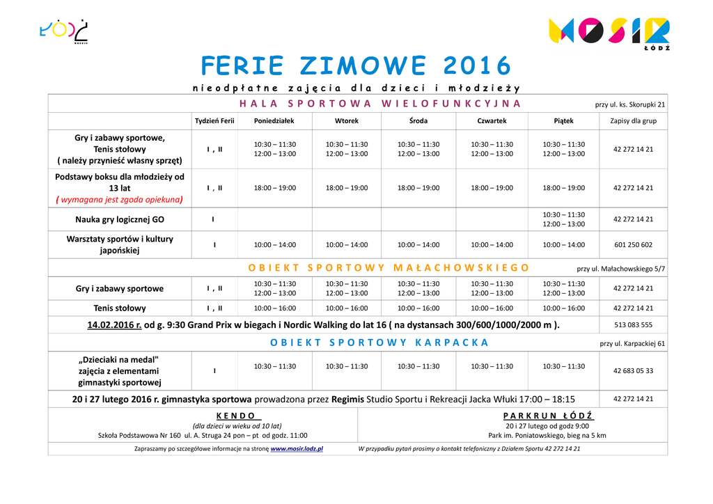 FE R I E Z I M O W E 2 0 1 6 nieodpłatne zajęcia dla dzieci i młodzieży HALA SPORTOWA WIELOFUNKCYJNA przy ul. ks. Skorupki 21 Tydzień Ferii Poniedziałek Wtorek Środa Czwartek Piątek Zapisy dla grup Gry i zabawy sportowe, Tenis stołowy ( należy przynieść własny sprzęt) I , II 10:30 – 11:30 12:00 – 13:00 10:30 – 11:30 12:00 – 13:00 10:30 – 11:30 12:00 – 13:00 10:30 – 11:30 12:00 – 13:00 10:30 – 11:30 12:00 – 13:00 42 272 14 21 Podstawy boksu dla młodzieży od 13 lat ( wymagana jest zgoda opiekuna) I , II 18:00 – 19:00 18:00 – 19:00 18:00 – 19:00 18:00 – 19:00 18:00 – 19:00 42 272 14 21 Nauka gry logicznej GO I 10:30 – 11:30 12:00 – 13:00 42 272 14 21 Warsztaty sportów i kultury japońskiej I 10:00 – 14:00 601 250 602 10:00 – 14:00 10:00 – 14:00 10:00 – 14:00 10:00 – 14:00 OBIEKT SPORTOWY MAŁACHOWSKIEGO przy ul. Małachowskiego 5/7 Gry i zabawy sportowe I , II 10:30 – 11:30 12:00 – 13:00 10:30 – 11:30 12:00 – 13:00 10:30 – 11:30 12:00 – 13:00 10:30 – 11:30 12:00 – 13:00 10:30 – 11:30 12:00 – 13:00 42 272 14 21 Tenis stołowy I , II 10:00 – 16:00 10:00 – 16:00 10:00 – 16:00 10:00 – 16:00 10:00 – 16:00 42 272 14 21 14.02.2016 r. od g. 9:30 Grand Prix w biegach i Nordic Walking do lat 16 ( na dystansach 300/600/1000/2000 m ). O B I EK T SPO RTOW Y K A RPAC K A „Dzieciaki na medal" zajęcia z elementami gimnastyki sportowej I 10:30 – 11:30 10:30 – 11:30 10:30 – 11:30 513 083 555 przy ul. Karpackiej 61 10:30 – 11:30 10:30 – 11:30 20 i 27 lutego 2016 r. gimnastyka sportowa prowadzona przez Regimis Studio Sportu i Rekreacji Jacka Włuki 17:00 – 18:15 KENDO (dla dzieci w wieku od 10 lat) Szkoła Podstawowa Nr 160 ul. A. Struga 24 pon – pt od godz. 11:00 Zapraszamy po szczegółowe informacje na stronę www.mosir.lodz.pl PARKRUN Ł ÓDŹ 20 i 27 lutego od godz 9:00 Park im. Poniatowskiego, bieg na 5 km W przypadku pytań prosimy o kontakt telefoniczny z Działem Sportu 42 272 14 21 42 683 05 33 42 272 14 21 FERIE ZIMOWE 2016 LODOWISKA S TA C J O N A R N E PRZENOŚNE P Ł Y WA L N I A (w zależności od sprzyjających warunków atmosferycznych) „BOMBONIERKA” „RETKINIA” „WODNY RAJ” „STAWY JANA” „WODNY RAJ” ul. Stefanowskiego 28 ul. Popiełuszki 13b ul. Wiernej Rzeki 2 ul. Rzgowska 247 ul. Wiernej Rzeki 2 czynne codziennie czynne codziennie czynne codziennie czynne codziennie czynna codziennie ślizgawki popularne ślizgawki popularne ślizgawki laserowe ślizgawki popularne ślizgawki popularne Szczegółowe godziny rozpoczęcia ślizgawek i godziny pracy Pływalni zamieszczone są na stronie Miejskiego Ośrodka Sportu i Rekreacji w Łodzi www.mosir.lodz.pl Funkcjonowanie ORLIKÓW uzależnione jest od warunków atmosferycznych Zgodnie z Zarządzeniem Nr 2472/VI/12 Prezydenta Miasta Łodzi z dnia 26 czerwca 2012 r. na powyżej wymienionych obiektach tj. Lodowiskach i Pływalni „w czasie trwania ferii zimowych, których termin dla szkół położonych na obszarze województwa łódzkiego określa Ministerstwo Edukacji Narodowej, ceny biletów ulgowych (…) od poniedziałku do piątku w godzinach 8:00 – 16:00 dla dzieci w wieku przedszkolnym i młodzieży szkolnej w obiektach Ośrodka ulegają obniżeniu do kwoty 2,00 zł brutto ( słownie: dwa złote i 00/100)