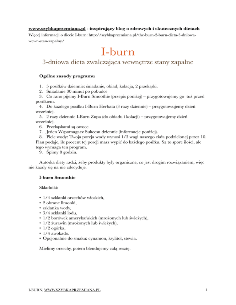 www.szybkaprzemiana.pl - inspirujący blog o zdrowych i skutecznych dietach Więcej informacji o diecie I-burn: http://szybkaprzemiana.pl/the-burn-2-burn-dieta-3-dniowawewn-stan-zapalny/ I-burn 3-dniowa dieta zwalczająca wewnętrze stany zapalne Ogólne zasady programu 1. 5 posiłków dziennie: śniadanie, obiad, kolacja, 2 przekąski. 2. Śniadanie 30 minut po pobudce 3. Co rano pijemy I-Burn Smoothie (przepis poniżej) – przygotowujemy go tuż przed posiłkiem. 4. Do każdego posiłku I-Burn Herbata (3 razy dziennie) – przygotowujemy dzień wcześniej. 5. 2 razy dziennie I-Burn Zupa (do obiadu i kolacji) – przygotowujemy dzień wcześniej. 6. Przekąskami są owoce. 7. Jeden Wspomagacz Sukcesu dziennie (informacje poniżej). 8. Picie wody: Twoja porcja wody wynosi 1/3 wagi naszego ciała podzielonej przez 10. Plan podaje, ile procent tej porcji masz wypić do każdego posiłku. Są to spore ilości, ale tego wymaga ten program. 9. Śpimy 8 godzin. Autorka diety radzi, żeby produkty były organiczne, co jest drogim rozwiązaniem, więc nie każdy się na nie zdecyduje. I-burn Smoothie Składniki: • • • • • • • • • 1/4 szklanki orzechów włoskich, 2 obrane limonki, szklanka wody, 3/4 szklanki lodu, 1/2 borówek amerykańskich (mrożonych lub świeżych), 1/2 żurawin (mrożonych lub świeżych), 1/2 ogórka, 1/4 awokado. Opcjonalnie do smaku: cynamon, ksylitol, stewia. Mielimy orzechy, potem blendujemy całą resztę. I-BURN, WWW.SZYBKAPRZEMIANA.PL )1 I-burn Tea Składniki: • • • • • • 10 szklanek wody, 9 cytryn eco, 3 łyżki nasion selera, 9 łyżek suszonej pietruszki (nie świeżej), ¼ łyżki pieprzu cayenne stewia lub ksylitol. Cytryny wyciskamy do wody, wrzucamy skórki. Wrzucamy nasiona selera, pietruszkę i pieprz cayenne. Gotujemy do wrzenia, i gotuje na wolnym ogniu jeszcze 1-2 godziny. Odcedzamy. Przechowujemy w lodówce. I-burn Zupa Składniki: • • • • • • • • • • • • • 4 litry wody, 4 marchewki, 4 łodygi selera z nacią, 2 szklanki pokrojonych liściastych – kapusta, boćwina, duża czerwona cebula, 2 bataty, 2 filiżanki warzyw korzeniowych – rzepa, pasternak, brukiew, 1½ szklanki grzybów shiitake albo maitake, 1 ½ szklanki pieczarek, 1 szklanki białej rzodkwi, ½ szklanki świeżej natki pietruszki albo kolendry, 2 ząbki czosnku, sól. Pokrój warzywa i zagotuj. Na wolnym ogniu gotuj jeszcze 2 godziny. Gdy ostygnie zmiksuj na krem. Podawaj w dowolnej temperaturze. Zupę można przechowywać w lodówce 5 dni. Można ją też mrozić. Owoce na przekąskę (do wyboru) Gruszki azjatyckie, borówki amerykańskie, czereśnie, żurawina, grejpfrut, limonki, cytryny, gruszki, ananas, granat, maliny, arbuz. Porcja: jeden owoc typu gruszka lub szklanka pokrojonych owoców typu ananas. Pakiet jedzenia bez ograniczeń I-Burn Herbata, I-Burn Zupa, seler naciowy, ogórek, rzodkiewki, jicama, cytryna i limonki. I-BURN, WWW.SZYBKAPRZEMIANA.PL )2 Wspomagacze Sukcesu • • • • • • • • • • • • 30-minutowy spacer, najlepiej na świeżym powietrzu joga – lekcja w szkole jogi lub samodzielne ćwiczenia w domu z filmów, szklanka szpinaku lub jarmużu dodana do porannego I-smoothie, herbata z korzenia mniszka, ćwiczenia oddechowe, kąpiel z solą Epson (2 szklanki na wannę wody, taka kąpiel do 3 x w tygodniu), olejki eteryczne (bergamotka, cynamon, goździki, eukaliptus, fenkuł, róża, tymianek), medytacja, refleksologia skierowana na nerki i system limfatyczny, sauna infrared, masaż limfatyczny, ćwiczenia na trampolinie. Dzień 1. 1. 30 minut po pobudce, śniadanie: I-Burn Smoothie (porcja wg przepisu) i I-Burn Herbata (szklanka) 2. Przekąska – owoc i 25% wody 3. Lunch: I-Burn Herbata (szklanka), I-Burn zupa (2 szklanki) + Sałatka arbuzowo-szpinakowa + 50% wody 4. Przekąska – owoc i 75% wody 5. Kolacja: I-Burn Herbata (szklanka), I-Burn Zupa (2 szklanki) + Ryba na warzywach + 100% wody Przepis na lunch – Sałatka arbuzowo-szpinakowa (1 porcja) 2 szklanki szpinaku, 1/2 szklanki kawałków arbuza, ¼ szklanki orzechów włoskich, 1/4 szklanki posiekanej pietruszki albo kolendry, ¼ awokado, garść kiełków lucerny, na sos: oliwa, sól, sok z 1/2 cytryny, szczypta pieprzu, szczypta soli. Mieszamy składniki, robimy winegret, polewamy nim sałatkę. Przepis na kolację – Ryba na warzywach (2 porcje) 1,5 szklanki kapusty, 1,5 szklanki marchewki, 1,5 szklanki pieczarek, 1,5 szklanki cukinii, 1 szklanka buraków, 1 szklanka pomidorów, 4 ząbki czosnku, 4 łyżki oliwy, sól, pieprz, 350 g soli (ryby) Warzywa szatkujemy, mieszamy z czosnkiem, zalewamy oliwą i wstawiamy do piekarnika na 30 minut lub aż warzywa będą miękkie, lecz jędrne w temperaturze 180 stopni. 8 minut przed końcem wrzucamy na to rybę, następnie przewracamy ją na drugą stronę po 3 minutach i pieczemy jeszcze 5 minut. Warzyw jemy połowę (do dania z rybą), reszta zostaje do dania na jutro (pieczone warzywa na makaronie z cukinii). I-BURN, WWW.SZYBKAPRZEMIANA.PL )3 Dzień 2. 1. 30 minut po pobudce, śniadanie: I-Burn Smoothie (porcja wg przepisu) i I-Burn Herbata (szklanka) 2. Przekąska – owoc i 25% wody 3. Lunch: I-Burn Herbata (szklanka), I-Burn zupa (2 szklanki) + humus coleslaw + 50% wody 4. Przekąska – owoc i 75% wody 5. Kolacja: I-Burn Herbata (szklanka), I-Burn Zupa (2 szklanki) + pieczone warzywa na makaronie cukinii + 100% wody Przepis na lunch – humus coleslaw (1 porcja) 1 szklanka poszatkowanej kapusty, 1/2 szklanki posiekanej marchewki, 1/2 szklanki posiekanych buraków surowych, 1/2 szklanki posiekanej jicama, 1/2 szklanki posiekanej cukinii, 1/4 szklanki orzechów włoskich, 2 łyżki domowego humusu, łyżeczka soku z limonki. Mieszamy wszystkie składniki. Danie nie nadaje się do zamrażania. Przepis na kolację – pieczone warzywa na makaronie cukinii (2 porcje) 4 średnie cukinie, łyżka oliwy z oliwek, 2 posiekane ząbki czosnku, połowa pieczonych warzyw z wczorajszego dani