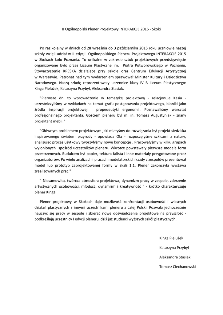 II Ogólnopolski Plener Projektowy INTERAKCJE 2015 - Skoki Po raz kolejny w dniach od 28 września do 3 października 2015 roku uczniowie naszej szkoły wzięli udział w II edycji Ogólnopolskiego Pleneru Projektowego INTERAKCJE 2015 w Skokach koło Poznania. To unikalne w zakresie sztuk projektowych przedsięwzięcie organizowane było przez Liceum Plastyczne im. Piotra Potworowskiego w Poznaniu, Stowarzyszenie KRESKA działające przy szkole oraz Centrum Edukacji Artystycznej w Warszawie. Patronat nad tym wydarzeniem sprawował Minister Kultury i Dziedzictwa Narodowego. Naszą szkołę reprezentowały uczennice klasy IV B Liceum Plastycznego: Kinga Pielużek, Katarzyna Przybył, Aleksandra Stasiak. "Pierwsze dni to wprowadzenie w tematykę projektową - relacjonuje Kasia uczestniczyliśmy w wykładach na temat grafu postępowania projektowego, bioniki jako źródła inspiracji projektowej i propedeutyki ergonomii. Poznawaliśmy warsztat profesjonalnego projektanta. Gościem pleneru był m. in. Tomasz Augustyniak - znany projektant mebli." "Głównym problemem projektowym jaki miałyśmy do rozwiązania był projekt siedziska inspirowanego światem przyrody - opowiada Ola - rozpoczęłyśmy szkicami z natury, analizując proces użytkowy tworzyłyśmy nowe koncepcje . Pracowałyśmy w kilku grupach wyłonionych spośród uczestników pleneru. Wkrótce powstawały pierwsze modele form przestrzennych. Budulcem był papier, tektura falista i inne materiały przygotowane przez organizatorów. Po wielu analizach i pracach modelatorskich każdy z zespołów prezentował model lub prototyp zaprojektowanej formy w skali 1:1. Plener zakończyła wystawa zrealizowanych prac." " Niesamowita, twórcza atmosfera projektowa, dynamizm pracy w zespole, zderzenie artystycznych osobowości, młodość, dynamizm i kreatywność " - krótko charakteryzuje plener Kinga. Plener projektowy w Skokach daje możliwość konfrontacji osobowości i własnych działań plastycznych z innymi uczestnikami pleneru z całej Polski. Pozwala jednocześnie nauczyć się pracy w zespole i zbierać nowe doświadczenia projektowe na przyszłość podkreślają uczestnicy I edycji pleneru, dziś już studenci wyższych szkół plastycznych. Kinga Pielużek Katarzyna Przybył Aleksandra Stasiak Tomasz Ciechanowski