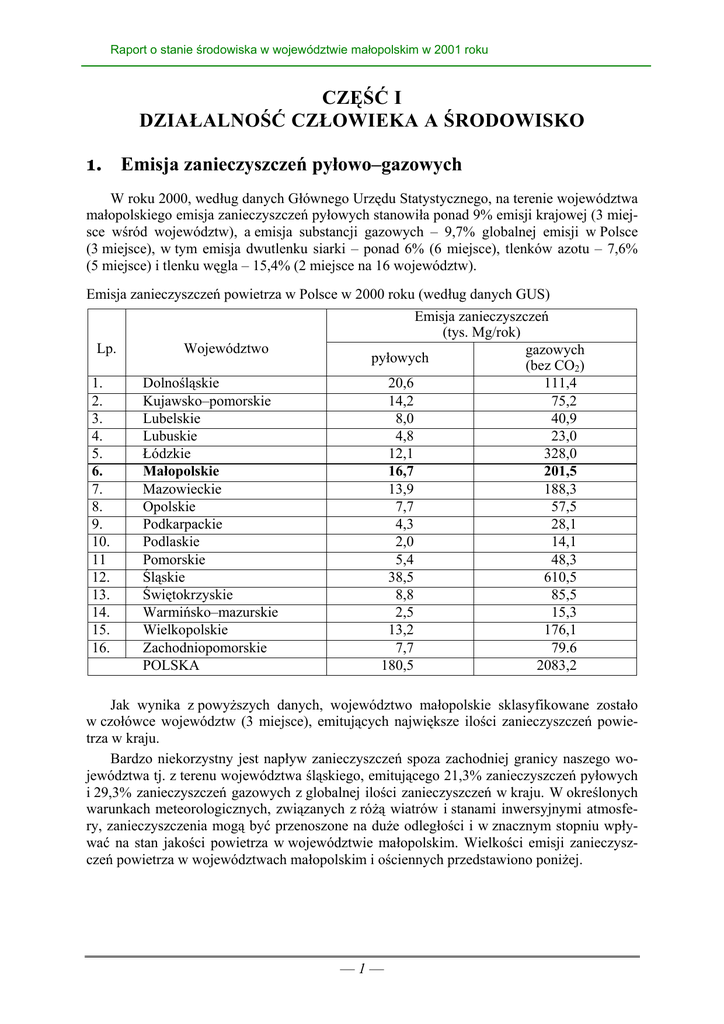 Raport o stanie środowiska w województwie małopolskim w 2001 roku CZĘŚĆ I DZIAŁALNOŚĆ CZŁOWIEKA A ŚRODOWISKO 1. Emisja zanieczyszczeń pyłowo–gazowych W roku 2000, według danych Głównego Urzędu Statystycznego, na terenie województwa małopolskiego emisja zanieczyszczeń pyłowych stanowiła ponad 9% emisji krajowej (3 miejsce wśród województw), a emisja substancji gazowych – 9,7% globalnej emisji w Polsce (3 miejsce), w tym emisja dwutlenku siarki – ponad 6% (6 miejsce), tlenków azotu – 7,6% (5 miejsce) i tlenku węgla – 15,4% (2 miejsce na 16 województw). Emisja zanieczyszczeń powietrza w Polsce w 2000 roku (według danych GUS) Lp. 1. 2. 3. 4. 5. 6. 7. 8. 9. 10. 11 12. 13. 14. 15. 16. Województwo Dolnośląskie Kujawsko–pomorskie Lubelskie Lubuskie Łódzkie Małopolskie Mazowieckie Opolskie Podkarpackie Podlaskie Pomorskie Śląskie Świętokrzyskie Warmińsko–mazurskie Wielkopolskie Zachodniopomorskie POLSKA Emisja zanieczyszczeń (tys. Mg/rok) gazowych pyłowych (bez CO2) 20,6 111,4 14,2 75,2 8,0 40,9 4,8 23,0 12,1 328,0 16,7 201,5 13,9 188,3 7,7 57,5 4,3 28,1 2,0 14,1 5,4 48,3 38,5 610,5 8,8 85,5 2,5 15,3 13,2 176,1 7,7 79.6 180,5 2083,2 Jak wynika z powyższych danych, województwo małopolskie sklasyfikowane zostało w czołówce województw (3 miejsce), emitujących największe ilości zanieczyszczeń powietrza w kraju. Bardzo niekorzystny jest napływ zanieczyszczeń spoza zachodniej granicy naszego województwa tj. z terenu województwa śląskiego, emitującego 21,3% zanieczyszczeń pyłowych i 29,3% zanieczyszczeń gazowych z globalnej ilości zanieczyszczeń w kraju. W określonych warunkach meteorologicznych, związanych z różą wiatrów i stanami inwersyjnymi atmosfery, zanieczyszczenia mogą być przenoszone na duże odległości i w znacznym stopniu wpływać na stan jakości powietrza w województwie małopolskim. Wielkości emisji zanieczyszczeń powietrza w województwach małopolskim i ościennych przedstawiono poniżej. —1— Raport o stanie środowiska w województwie małopolskim w 2001 roku Kozłów Książ Wielki Charsznica Wolbrom Mędrzechów Brzeszcze Alwernia Kęty Liszki Wieprz Skawina Żabno Szczurowa Drwinia Wierzchosławice Kłaj Biskupice RzezawaBRZESKO BOCHNIA Dobczyce Mucharz Zembrzyce MYŚLENICE Budzów SUCHA BESKIDZKA Stryszawa Raciechowice Tokarnia Wiśniowa Jodłownik Żegocina Tymbark Dobra Bystra Rabka Sidzina Niedźwiedź Łukowica Kamienica Łącko Lipnica Wlk. Jabłonka TARG Szaflary Czorsztyn Bobowa NOWY SĄCZ Chełmiec Biecz Łużna GORLICE Grybów Lipinki Sękowa Ropa Stary Sącz Kamionka Wlk. Nawojowa Łabowa Uście Gorlickie Rytro Krościenko Szczawnica Piwniczna Krynica Biały Dunajec Łapsze Niżne Bukowina Tatrzańska Mg/rok Muszyna gazy Poronin woj. śląskie woj. podkarpackie Rzepiennik Strzyżowski Moszczenica Korzenna Ochotnica Dolna Czarny Dunajec NOWY Gródek nad Dunajcem Łososina Dln. Ryglice Gromnik Zakliczyn Ciężkowice Podegrodzie Spytkowice Raba Wyżna Pleśna Iwkowa woj. małopolskie LIMA NOWA Słopnice Mszana Dolna Wojnicz Tuchów Czchów Laskowa Maków Podhalański Lubień TARNÓW Gnojnik Lipnica Murowana Łapanów Trzciana Pcim Jordanów Zawoja Wola Dębińska Nowy Wiśnicz Gdów Siepraw LanckoronaSułkowice Stryszów Lisia Góra Radłów Borzęcin Skrzyszów Mogilany Świątniki Górne Kalwaria Zebrz. Andrychów DĄBROWA TARNOWSKA Koszyce Nw. Brzesko Tomice WADOWICE Radgoszcz Olesno Wietrzychowice Niepołomice KRAKÓW WIELICZKA Czernichów Brzeźnica Osiek PROSZOWICE Iwanowice Koniusza Michałowice Wielka Wieś Zielonki Kocmyrzów Igołomia Zabierzów Krzeszowice Babice PrzeOŚWIĘCIM ciszów Polanka Wlk. ZatorSpytkowice Słomniki Skała Szczucin Bolesław Gręboszów ZAKOPANE Kościelisko pyły Jerzmanowice Trzebinia CHRZANÓW Pałecznica Radziemice Sułoszowa Bukowno OLKUSZ Libiąż woj. świętokrzyskie MIECHÓWRacławice Trzyciąż Sławków Chełmek Słaboszów Gołcza Klucze Bolesław Rysunek 1. Wielkość emisji zanieczyszczeń pyłowo–gazowych w województwach ościennych w 2001 roku Głównymi źródłami emisji zanieczyszczeń do powietrza w województwie są: zakłady przemysłowe, przedsiębiorstwa energetyki cieplnej, transport oraz gospodarka komunalna. Emisja z punktowych źródeł zanieczyszczeń tj. zakładów przemysłowych i przedsiębiorstw energetyki cieplnej jest objęta kontrolą i ewidencją, natomiast emisja z pozostałych źródeł, ze względu na charakter i rozproszenie jest trudna do zbilansowania. W porównaniu z rokiem poprzednim w strukturze emisji zanieczyszczeń do powietrza nie zauważono większych zmian. Nadal dominuje emisja gazów (90%) nad emisją pyłów (10%). W przypadku poszczególnych gazów stwierdzono znaczący udział dwutlenku siarki (42,7%) i tlenku węgla (35,0%), a stosunkowo mniejszy tlenków azotu, węglowodorów i innych specyficznych gazów. Na rysunku 2 przedstawiono strukturę emisji zanieczyszczeń powietrza w województwie małopolskim w 2001 roku w porównaniu z rokiem ubiegłym. Analiza udziałów poszczególnych sektorów gospodarki w emisji zanieczyszczeń pyłowych i gazowych wykazała, że emisja: z sektora przemysłu wynosiła 49,6% pyłów (wzrost o 1,6%) i 54,0% gazów, z sektora energetyki 42,2% pyłów i 42,0% gazów (wzrosty o 5,5% emisji pyłów i o 1,6% emisji gazów, z sektora gospodarki komunalnej – 8,2% pyłów i 4% gazów (spadek emisji pyłów o 4% i gazów o 1,5%). —2— Raport o stanie środowiska w województwie małopolskim w 2001 roku % 100 80 60 40 20 0 pyły gazy, w tym: SO2 NO2 CO inne 2000 2001 Rysunek 2. Struktura emisji zanieczyszczeń pyłowo–gazowych Poniższe rysunki ilustrują struktury emisji zanieczyszczeń pyłowych i gazowych według działów gospodarki. pyły p rzemy sł 49,6% gazy p rzemy sł 54,0% energety ka 42,2% gosp . komunalna 8,2% energety ka 42,0% gosp . komunalna 4,0% Rysunek 3. Struktura emisji zanieczyszczeń pyłowo–gazowych według działów gospodarki P