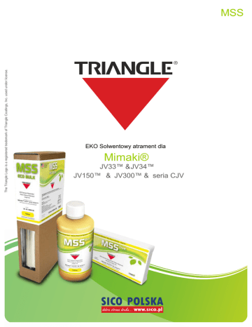 The Triangle Logo is a registered trademark of Triangle Coatings, Inc. used under license. MSS EKO Solwentowy atrament dla Mimaki® JV33™ & JV34™ JJV150™ &JJV300™ & seria CJV ECO Inkjet Inks Mimaki® Dostępne standardowe opakowania: 1 litr butelka Na zamówienie indywidualne: 2 litry ECO bulk, 440 ml kasety JV33™ JV34™ JJV150™ JJV300™ seria CJV karton zawiera 6 szt. x 1 litrowych butelek waga netto 6 litrów MSS Atrament ecosolwentowy o wysokich właściwościach dla drukarek Mimaki JV33™ & JV34™ & JV150™ & JV300™ & seria CJV Kompatybiny kolorystycznie z atramentami Mimaki®SS21™ Kompatybilny chemicznie z atramentami Mimaki SS21 Nie wymaga czyszczenia ani dodatkowego profilowania przy zmianie z atramentu Miamki SS21 Mniej wonny Szybki czas schnięcia Duża kompatybilność z ekonomicznymi materiałami typu folia i materiałami banerowymi Zgodny z rozporządzeniem REACH karton zawiera 12 szt. x 440 ml kasety waga netto 5.28 litra karton zawiera 4szt. x 2 litrowa butelka waga netto 8 litrów Profilowanie kolorystyczne Easyreset EasyReset to automatyczny emulator kodów zastępujący koniecznosć stosowania chipów w komunikacji między kasetą a maszyną. To rozwiązanie pozwala pracować maszynie niezależnie od konieczności stosowania chipów OEM. Urządzenie jest proste i intuicyjne w obsłudze. Nie wymaga dodatkowych czynności poza standardową obsługą plotera. SICO Polska oferuje klientom w ramach sprzedaży atramentów usługę dodatkowego profilowania, którą jesteśmy w stanie dostosować do indywidualnych wymagań klienta. W razie dodatkowych pytań: [email protected] Serwis Części zamienne Nasz serwis to zespół profesjonalnych inżynierów serwisu obsługujących klientów na terenie całego kraju. Wykonujemy przeglądy okresowe, naprawy i konserwacje maszyn solwentowych, UV i sublimacyjnych. Wykonujemy profile kolorystyczne ICC na wszystkich rodzajach mediów. Podejmujemy się naprawy płyt głównych i innych napraw elektronicznych. Dysponujemy szerokim zestawem urządzeń diagnostycznych. Jesteśmy oficjalnym dystrybutorem oryginalnych części zamiennych Mimaki. SICO Polska oferuje w ramach świadczonego serwisu maszyn również sprzedaż części zamiennych. W razie dodatkowych pytań: [email protected] Pomoc techniczna CENTRALA HANDLOWA WARSZAWA ul.Daniszewska 10 03-230 Warszawa (+48 22) 814 50 01,03,33,34 [email protected] ODDZIAŁ BYDGOSZCZ ul.Warmińskiego 24 85-054 Bydgoszcz (+48 52) 321 98 00 [email protected] ODDZIAŁ GDAŃSK ul.Kaprów 4B 80-316 Gdańsk-Oliwa (+48 58) 556 70 20 [email protected] ODDZIAŁ KRAKÓW Al.Jana Pawła II 178 31-982 Kraków (+48 12) 644 77 70 [email protected] ODDZIAŁ ŁÓDŹ ul.Wojska Polskiego 190 91-726 Łódź (+48 42) 656 14 03 [email protected] ODDZIAŁ POZNAŃ ul.Szkółkarska 25 62-002 Suchy Las (+48 61) 852 52 45 [email protected] W razie jakich kolwiek pytań dotyczacych pracy maszyny z tuszami prosimy o kontakt: [email protected] lub bezpośrednio do producenta: [email protected]
