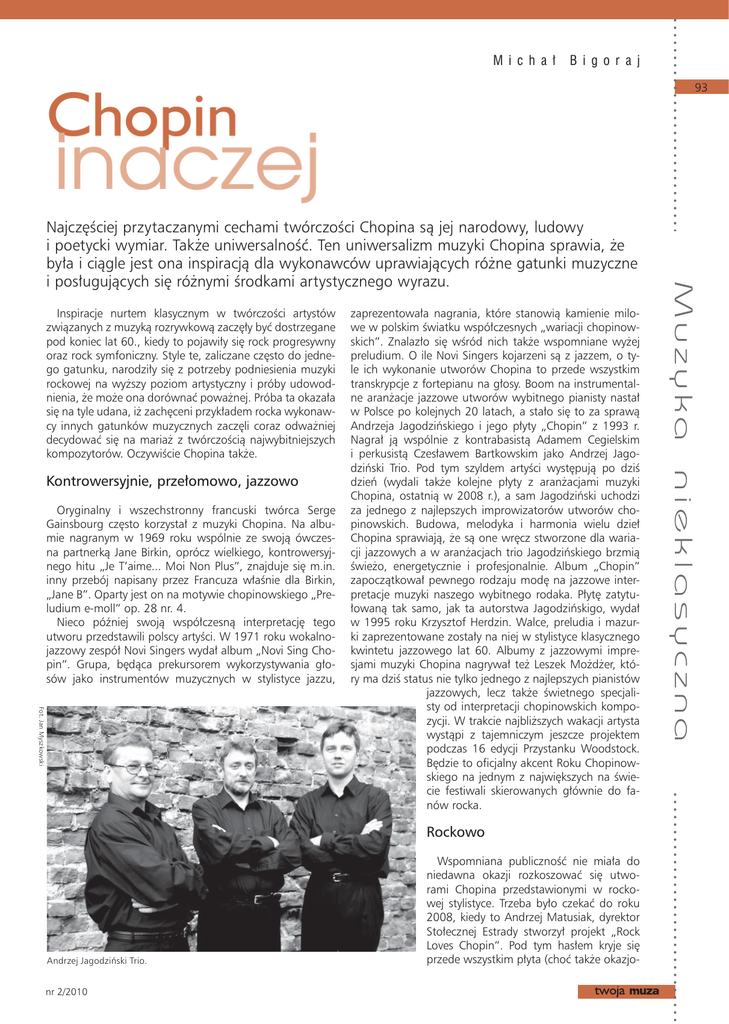 M i c h a ł B i g o r a j 93 Inspiracje nurtem klasycznym w twórczości artystów związanych z muzyką rozrywkową zaczęły być dostrzegane pod koniec lat 60., kiedy to pojawiły się rock progresywny oraz rock symfoniczny. Style te, zaliczane często do jednego gatunku, narodziły się z potrzeby podniesienia muzyki rockowej na wyższy poziom artystyczny i próby udowodnienia, że może ona dorównać poważnej. Próba ta okazała się na tyle udana, iż zachęceni przykładem rocka wykonawcy innych gatunków muzycznych zaczęli coraz odważniej decydować się na mariaż z twórczością najwybitniejszych kompozytorów. Oczywiście Chopina także. Kontrowersyjnie, przełomowo, jazzowo Oryginalny i wszechstronny francuski twórca Serge Gainsbourg często korzystał z muzyki Chopina. Na albumie nagranym w 1969 roku wspólnie ze swoją ówczesna partnerką Jane Birkin, oprócz wielkiego, kontrowersyjnego hitu „Je T’aime... Moi Non Plus”, znajduje się m.in. inny przebój napisany przez Francuza właśnie dla Birkin, „Jane B”. Oparty jest on na motywie chopinowskiego „Preludium e-moll” op. 28 nr. 4. Nieco później swoją współczesną interpretację tego utworu przedstawili polscy artyści. W 1971 roku wokalnojazzowy zespół Novi Singers wydał album „Novi Sing Chopin“. Grupa, będąca prekursorem wykorzystywania głosów jako instrumentów muzycznych w stylistyce jazzu, Fot. Jan Myszkowski zaprezentowała nagrania, które stanowią kamienie milowe w polskim światku współczesnych „wariacji chopinowskich”. Znalazło się wśród nich także wspomniane wyżej preludium. O ile Novi Singers kojarzeni są z jazzem, o tyle ich wykonanie utworów Chopina to przede wszystkim transkrypcje z fortepianu na głosy. Boom na instrumentalne aranżacje jazzowe utworów wybitnego pianisty nastał w Polsce po kolejnych 20 latach, a stało się to za sprawą Andrzeja Jagodzińskiego i jego płyty „Chopin” z 1993 r. Nagrał ją wspólnie z kontrabasistą Adamem Cegielskim i perkusistą Czesławem Bartkowskim jako Andrzej Jagodziński Trio. Pod tym szyldem artyści występują po dziś dzień (wydali także kolejne płyty z aranżacjami muzyki Chopina, ostatnią w 2008 r.), a sam Jagodziński uchodzi za jednego z najlepszych improwizatorów utworów chopinowskich. Budowa, melodyka i harmonia wielu dzieł Chopina sprawiają, że są one wręcz stworzone dla wariacji jazzowych a w aranżacjach trio Jagodzińskiego brzmią świeżo, energetycznie i profesjonalnie. Album „Chopin” zapoczątkował pewnego rodzaju modę na jazzowe interpretacje muzyki naszego wybitnego rodaka. Płytę zatytułowaną tak samo, jak ta autorstwa Jagodzińskigo, wydał w 1995 roku Krzysztof Herdzin. Walce, preludia i mazurki zaprezentowane zostały na niej w stylistyce klasycznego kwintetu jazzowego lat 60. Albumy z jazzowymi impresjami muzyki Chopina nagrywał też Leszek Możdżer, który ma dziś status nie tylko jednego z najlepszych pianistów jazzowych, lecz także świetnego specjalisty od interpretacji chopinowskich kompozycji. W trakcie najbliższych wakacji artysta wystąpi z tajemniczym jeszcze projektem podczas 16 edycji Przystanku Woodstock. Będzie to oficjalny akcent Roku Chopinowskiego na jednym z największych na świecie festiwali skierowanych głównie do fanów rocka. Rockowo Andrzej Jagodziński Trio. nr 2/2010 Wspomniana publiczność nie miała do niedawna okazji rozkoszować się utworami Chopina przedstawionymi w rockowej stylistyce. Trzeba było czekać do roku 2008, kiedy to Andrzej Matusiak, dyrektor Stołecznej Estrady stworzył projekt „Rock Loves Chopin”. Pod tym hasłem kryje się przede wszystkim płyta (choć także okazjo- Muzyka nieklasyczna Najczęściej przytaczanymi cechami twórczości Chopina są jej narodowy, ludowy i poetycki wymiar. Także uniwersalność. Ten uniwersalizm muzyki Chopina sprawia, że była i ciągle jest ona inspiracją dla wykonawców uprawiających różne gatunki muzyczne i posługujących się różnymi środkami artystycznego wyrazu. Muzyka nieklasyczna nr 2/2010 Fot. Witkowski JK 94 nalne koncerty), na której polscy muzycy rockowi przedstawiają własne, oryginalne aranżacje kompozycji Chopina. Są to interpretacje istotnie bardzo rockowe. I to jest niewątpliwie atutem, ponieważ możemy standardowe instrumenty, kojarzące się z tą muzyką, takie jak gitary elektryczna i basowa oraz perkusja, usłyszeć w utworach, w których bez trudu rozpoznajemy linię melodyczną i motywy dzieł wielkiego twórcy. Udział w nagraniach znakomitych gitarzystów (m.in. Jana Borysewicza i głównego aranżera całości, Radka Chwielarskiego) sprawiają, iż „Chopin na rockowo” momentami brzmi wirtuozersko, popisowo a czasem wręcz monumentalnie. Kolorytu dodają także wokalizy Patrycji i Grzegorza Markowskich oraz Anny Serafińskiej. Profesjonalizm i rangę wydawnictwa podnoszą Projekt „Rock Loves Chopin” (na pierwszym plania Anna Serafińska i Radek Chwiepartie fortepianu wykonywane przez wybitne- larski) podczas koncertu „Chopin Klasycznie, Jazzowo, Rockowo” inaugurującego go pianistę i interpretatora muzyki Chopina, Ja- 50 sezon Koncertów Chopinowskich w Łazienkach Królewskich w Warszawie (16 maja nusza Olejniczaka. Takie wykonawstwo muzyki 2009 roku). choćby podczas słynnego gdańskiego koncertu z 2005 roChopina może budzić zastrzeżenia wśród konserwatywnych melomanów, ale jeśli chodzi o popularyza- ku, upamiętniającego 25-lecie powstania „Solidarności”. cję muzyki naszego wielkiego rodaka wśród rockowej pub- Jeden z utworów z tego koncertu zadedykowany był naszemu wybitnemu pianiście. liczności wydaje się być strzałem w dziesiątkę. Oryginalnością typową dla słynnego Francuza wykaza„Rock Loves Chopin” stanowi ponadto część większej całości, której pomysłodawcą ponownie była Stołeczna li się także muzycy polskiego Motion Trio (Janusz WojtaEstrada. Z jej inicjatywy wysze