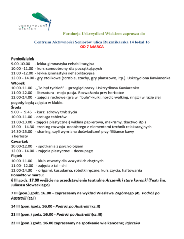 Fundacja Uskrzydleni Wiekiem zaprasza do Centrum Aktywności Seniorów ulica Rusznikarska 14 lokal 16 OD 7 MARCA Poniedziałek 9.00-10.00 - lekka gimnastyka rehabilitacyjna 10.00 -11.00 - kurs samoobrony dla początkujących 11.00 -12.00 - lekka gimnastyka rehabilitacyjna 12.00 - 14.00 - gry stolikowe (scrable, szachy, gry planszowe, itp.). Uskrzydlona Kawiarenka Wtorek 10.00-11.00 -„To był tydzień” – przegląd prasy. Uskrzydlona Kawiarenka 11.00-12.00 - literatura - moja pasja. Rozważania przy herbatce 12.00-14.00 - zajęcia ruchowe (gra w “bule”-kulki, nordic walking, ringo) w razie złej pogody będą zajęcia w klubie. Środa 9.00 - 9.45 - kurs: zdrowy tryb życia 10.00-11.00 - obsługa tabletów 11.00-13.00 - zajęcia plastyczne ( wiklina papierowa, makramy, tkactwo itp.) 13.00 - 14.30 - trening rozwoju osobistego z elementami technik relaksacyjnych 14.30-15.00 - sharing, czyli wymiana doświadczeń przy filiżance kawy i herbaty Czwartek 10.00-12.00 - spotkania z psychologiem 12.00 - 14.00 - zajęcia plastyczne – decoupage Piątek 10.00-11.00 - klub otwarty dla wszystkich chętnych 11.00- 12.00 - zajęcia z tai - chi 12.00-14.30 - origami, kusudama, robótki ręczne, kurs szycia, haftowania Ponadto w marcu: 6 III godz. 17.00 wyjście na przedstawienie teatralne Arszenik i stare koronki (Teatr im. Juliusza Słowackiego) 7 III (pon.) godz. 16.00 – zapraszamy na wykład Wiesława Zagórnego pt. Podróż po Australii (cz.I) 14 III (pon.)godz. 16.00 - Podróż po Australii (cz.II) 21 III (pon.) godz. 16.00 - Podróż po Australii (cz.III) 22 III (pon.) godz. 16.00 zapraszamy na spotkanie wielkanocne; Jajeczko