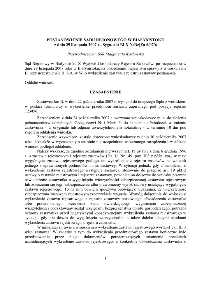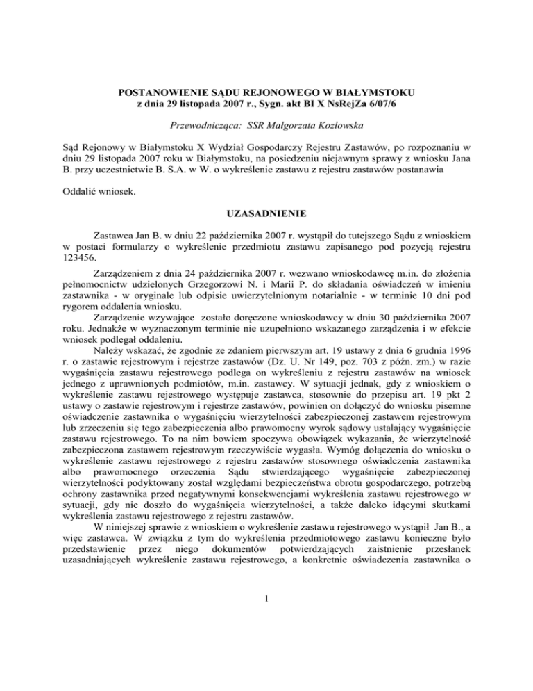 POSTANOWIENIE SĄDU REJONOWEGO W BIAŁYMSTOKU z dnia 29 listopada 2007 r., Sygn. akt BI X NsRejZa 6/07/6 Przewodnicząca: SSR Małgorzata Kozłowska Sąd Rejonowy w Białymstoku X Wydział Gospodarczy Rejestru Zastawów, po rozpoznaniu w dniu 29 listopada 2007 roku w Białymstoku, na posiedzeniu niejawnym sprawy z wniosku Jana B. przy uczestnictwie B. S.A. w W. o wykreślenie zastawu z rejestru zastawów postanawia Oddalić wniosek. UZASADNIENIE Zastawca Jan B. w dniu 22 października 2007 r. wystąpił do tutejszego Sądu z wnioskiem w postaci formularzy o wykreślenie przedmiotu zastawu zapisanego pod pozycją rejestru 123456. Zarządzeniem z dnia 24 października 2007 r. wezwano wnioskodawcę m.in. do złożenia pełnomocnictw udzielonych Grzegorzowi N. i Marii P. do składania oświadczeń w imieniu zastawnika - w oryginale lub odpisie uwierzytelnionym notarialnie - w terminie 10 dni pod rygorem oddalenia wniosku. Zarządzenie wzywające zostało doręczone wnioskodawcy w dniu 30 października 2007 roku. Jednakże w wyznaczonym terminie nie uzupełniono wskazanego zarządzenia i w efekcie wniosek podlegał oddaleniu. Należy wskazać, że zgodnie ze zdaniem pierwszym art. 19 ustawy z dnia 6 grudnia 1996 r. o zastawie rejestrowym i rejestrze zastawów (Dz. U. Nr 149, poz. 703 z późn. zm.) w razie wygaśnięcia zastawu rejestrowego podlega on wykreśleniu z rejestru zastawów na wniosek jednego z uprawnionych podmiotów, m.in. zastawcy. W sytuacji jednak, gdy z wnioskiem o wykreślenie zastawu rejestrowego występuje zastawca, stosownie do przepisu art. 19 pkt 2 ustawy o zastawie rejestrowym i rejestrze zastawów, powinien on dołączyć do wniosku pisemne oświadczenie zastawnika o wygaśnięciu wierzytelności zabezpieczonej zastawem rejestrowym lub zrzeczeniu się tego zabezpieczenia albo prawomocny wyrok sądowy ustalający wygaśnięcie zastawu rejestrowego. To na nim bowiem spoczywa obowiązek wykazania, że wierzytelność zabezpieczona zastawem rejestrowym rzeczywiście wygasła. Wymóg dołączenia do wniosku o wykreślenie zastawu rejestrowego z rejestru zastawów stosownego oświadczenia zastawnika albo prawomocnego orzeczenia Sądu stwierdzającego wygaśnięcie zabezpieczonej wierzytelności podyktowany został względami bezpieczeństwa obrotu gospodarczego, potrzebą ochrony zastawnika przed negatywnymi konsekwencjami wykreślenia zastawu rejestrowego w sytuacji, gdy nie doszło do wygaśnięcia wierzytelności, a także daleko idącymi skutkami wykreślenia zastawu rejestrowego z rejestru zastawów. W niniejszej sprawie z wnioskiem o wykreślenie zastawu rejestrowego wystąpił Jan B., a więc zastawca. W związku z tym do wykreślenia przedmiotowego zastawu konieczne było przedstawienie przez niego dokumentów potwierdzających zaistnienie przesłanek uzasadniających wykreślenie zastawu rejestrowego, a konkretnie oświadczenia zastawnika o 1 wygaśnięciu wierzytelności zabezpieczonej zastawem rejestrowym lub wyrażeniu zgody na wykreślenie powyższego zastawu z rejestru zastawów. Na uwagę zasługuje fakt, iż w przypadku gdy zastawnikiem jest bank, oświadczenie o wygaśnięciu wierzytelności zabezpieczonej zastawem rejestrowym ma szczególny charakter, albowiem w sytuacji spełnienia wszystkich wymogów przewidzianych prawem dla tego typu oświadczeń ma ono moc prawną dokumentów urzędowych i stanowi podstawę wpisu w rejestrze zastawów. Należy mieć też na względzie, że z dokumentem urzędowym w rozumieniu art. 244 § 1 i 2 k.p.c. wiążą się dwa domniemania prawne, a mianowicie domniemanie autentyczności, z którego wynika, że dokument ten został sporządzony przez osobę, która podpisała pismo, oraz domniemanie zgodności złożonego oświadczenia z prawdą. Zgodnie z art. 95 ust. 1 ustawy z dnia 29 sierpnia 1997 r. Prawo bankowe (Dz. U. Nr 140, poz. 939 z późn. zm.) – zwanej dalej prawem bankowym - księgi rachunkowe banków, wyciągi z tych ksiąg podpisane przez osoby upoważnione do składania oświadczeń w zakresie praw i obowiązków majątkowych banku i opatrzone pieczęcią banku oraz wszelkie wystawione w ten sposób oświadczenia zawierające zobowiązania, zwolnienie z zobowiązań, zrzeczenie się praw lub pokwitowanie odbioru należności oraz stwierdzające udzielenie kredytu, pożyczki pieniężnej, ich wysokość, zasady oprocentowania, warunki spłaty, przeniesienie wierzytelności zabezpieczonej hipoteką lub zastawem rejestrowym, mają moc dokumentów urzędowych oraz stanowią podstawę do dokonania wpisów w księgach wieczystych i rejestrach publicznych. Jednakże, aby oświadczenie banku miało moc dokumentu urzędowego musi spełniać wszystkie merytoryczne i formalne wymagania przewidziane w art. 95 prawa bankowego, a więc zostać opatrzone stosowną pieczęcią oraz podpisane przez osobę uprawnioną do składania oświadczeń woli w zakresie praw i obowiązków majątkowych banku. W przypadku, gdy oświadczenie takie nie spełnia chociażby jednego z tych warunków nie stanowi ono dokumentu urzędowego, w związku z czym nie może stanowić dowodu tego, co zostało w nim urzędowo zaświadczone przez powołany do tego organ w zakresie jego działania. Jeżeli chodzi o wymóg opatrzenia oświadczenia banku stosowną pieczęcią, powinna to być pieczęć, którą dany bank standardowo posługuje się na co dzień przy tego typu czynnościach, wskazująca m.in. jego nazwę i siedzibę, a także kolejny numer pieczęci, gdy wykorzystywanych jest kilka pieczęci. Stanowi ona bowiem najbardziej charakterystyczną zewnętrzną cechę dokumentu urzędowego. Natomiast odnośnie opatrzenia oświadczenia podpisem osoby uprawnionej do składania oświadczeń woli w zakresie praw i obowiązków majątkowych banku w doktrynie przyjmuje się, że osobami upoważnionymi do składania oświadczeń w imieniu i na rzecz banku są osoby wskazane w statucie danego banku (tak A. Frań, Komentarz do art. 95 ustawy z dnia 29 sier
