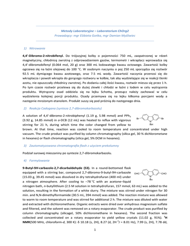 Metody Laboratoryjne – Laboratorium ChOrg2 Prowadzący: mgr Elżbieta Gońka, mgr Damian Myśliwiec 1) Nitrowanie 4,4'-Dibromo-2-nitrobifenyl. Do trójszyjnej kolby o pojemności 750 mL, zaopatrzonej w rdzeń magnetyczny, chłodnicę zwrotną z odprowadzeniem gazów, termometr i wkraplacz wprowadza się 4,4'-dibromobifenyl (0.064 mol, 20 g) oraz 300 mL lodowatego kwasu octowego. Zawartość kolby ogrzewa się na łaźni olejowej do 100 °C. W osobnym naczyniu o poj 250 mL sporządza się roztwór 92.5 mL dymiącego kwasu azotowego, oraz 7.5 mL wody. Zawartość naczynia przenosi się do wkraplacza i powoli wkrapla do gorącego roztworu w kolbie, tak aby wydzielające się w reakcji tlenki azotu, nie opuszczały chłodnicy zwrotnej. Po dodaniu całej ilości kwasu, roztwór miesza się przez 1 h. Po tym czasie roztwór przelewa się do dużej zlewki i chłodzi w łaźni z lodem w celu wytrącenia produktu. Wytrącony osad oddziela się na lejku Schotta, przesącz należy zachować w celu wydzielenia kolejnej porcji produktu. Osady przemywa się na lejku kilkoma porcjami wody a następnie mrożonym etanolem. Produkt suszy się pod próżnią do następnego dnia. 2) Reakcja Cadogana (synteza 2,7-dibromokarbazolu) A solution of 4,4'-dibromo-2-nitrobiphenyl (1.19 g, 5.98 mmol) and PPh3 Br Br (3.92 g, 14.85 mmol) in o-DCB (12 mL) was heated to reflux with vigorous N NH stirring for 21 h, during which time the color changed from yellow to brown. At that time, reaction was cooled to room temperature and concentrated under high vacuum. The crude product was purified by column chromatography (silica gel, 30 % dichlorometane in hexanes) or flash chromatography (silica gel, 5% DCM in hexanes). 3) Zautomatyzowana chromatografia flash z użyciem prekolumny Podział surowej mieszaniny po syntezie 2,7-dibromokarbazolu. 4) Formylowanie 9-Butyl-9H-carbazole-2,7-dicarbaldehyde (S3). In a round‐bottomed flask equipped with a stirring bar, compound 2,7-dibromo-9-butyl-9H-carbazole OHC CHO N (15.03 g, 39.45 mmol) was dissolved in dry tetrahydrofuran (400 ml) under Bu a nitrogen atmosphere. After cooling to –78 °C with an acetone–liquid nitrogen bath, n-butyllithium (2.5 M solution in tetrahydrofuran, 157 mmol, 63 mL) was added to the solution, resulting in the formation of a white slurry. The mixture was stirred under nitrogen for 30 min. and N,N-dimethylformamide (30.5 mL, 394 mmol) was added. The reaction mixture was allowed to warm to room temperature and was stirred for additional 2 h. The mixture was diluted with water and extracted with dichloromethane. Organic extracts were dried over anhydrous magnesium sulfate and filtered, and the solvent was removed on a rotary evaporator. The crude product was purified by column chromatography (silicagel, 50% dichloromethane in hexanes). The second fraction was collected and concentrated on a rotary evaporator to yield yellow crystals (11.02 g, 91%). 1H NMR(500 MHz, chloroform‐d, 300 K): δ 10.18 (s, 2H), 8.27 (d, 2H 4J = 8.01 Hz), 7.99 (s, 2H), 7.78 dd, 1 2H, 3J = 8.0 Hz, 4J = 1.2 Hz), 4.43 (t, 2H, 3J = 7.2 Hz) 1.90 (m, 2H), 1.42 (m, 2H), 0.96 (t, 3H, 3J = 7.12 Hz). 13C NMR (125 MHz, chloroform-d, 300K): δ 192.38, 141.81, 135.21, 126.91, 121.82, 121.47, 110.24, 43.47, 31.25, 20.57, 13.82. 5) Reakcja McMurry’ego Br Br In a 250 mL three-necked round-bottomed flask with a reflux condenser and a septum were placed zinc powder (748 mg, 11.44 mmol) and copper(I) chloride (69 mg, 0.36 mmol). The apparatus was filled with N N BuBu argon and oxygen-free tetrahydrofuran (10 mL) was introduced through a Br Br Bu syringe. Titanium tetrachloride (0.6 mL, 5.72 mmol) was added dropwise N over 2 minutes using a syringe. The mixture was then heated under reflux for 3 h. Subsequently, a solution of 3,6-dibromo-9-butyl-9H-carbazoleBr Br 2,7-dicarbaldehyde (100 mg, 0.22 mmol) in oxygen-free tetrahydrofuran (20 ml) was slowly added to the boiling mixture using a syringe. After completion of the addition (2 h), the septum was replaced with a glass stopper and the reaction mixture was kept under reflux for 12 h. After that time, the mixture was cooled down to room temperature. Aqueuous ammonia (6%, 100 mL) was added. The mixture was extracted with dichloromethane. The organic layer was washed with brine, dried over Na2SO4, and evaporated to give an yellow-orange oil. The crude product was purified by column chromatography (silica gel, dichloromethane–hexanes = 1:1). and then by preparative TLC. After filtration, solvents were removed under reduced pressure to give the product as a yellow solid (7.1 mg, 7.6%). 1H NMR (600 MHz, chloroform‐d, 300 K): δ 8.05 (s, 6H), 7.00 (s, 6H), 6.88 (s, 6H), 3.43 (t, 6H, 3J = 7.3 Hz), 0.87 (m, 6H), 0.57 (m, 6H), 0.17 (t, 9H, 3J = 7.3 Hz). 13C NMR (151 MHz, chloroform-d, 300K): δ 139.40, 134.60, 132.44, 123.84, 122.18, 113.88, 111.11, 42.49, 30.22, 19.84, 12.95. HR-MS (MALDI+): m/z 1215.8734 [M+H+, major peak], calcd. for C54H46Br6N3: 1215.8725. 6) Reakcja Williamsona OC4H9 O H 4-Butoxybenzaldehyde. In a 1 L round bottomed flask equipped with a reflux condenser and a magnetic stirring bar were dissolved 4-hydroxybenzaldehyde (35 g, 287 mmol) and 1-bromobutane (30.92 ml, 287 mmol) in N,N-dimethylformamide (750 mL). The mixture then was stirred under nitrogen for 20 minutes. Anhydrous potassium carbonate (118.83 g, 860 mmol) was then added and the mixture was stirred and heated at 60 °C under nitrogen. After 20 h, the reaction was allowed to cool to room temperature, treated with excess water, and extracted with dichloromethane. The combined organic extracts were dried over anhydrous sodium sulfate, filtered, and evaporated to dryness under reduced pressure yielding a brown oil (49.8 g, 97%). 2 1 H NMR (600 MHz, chloroform-d, 300 K): δ 9.85 (s, 1H), 7.80 (d, 2H, 3J = 8.8 Hz), 6.96 (d, 2H, 3J = 8.8 Hz), 4.02 (t, 2H, 3J = 6.5 Hz), 1.78 (m, 2H), 1.48 (m, 2H), 0.96 (t, 3H, 3J = 7.4 Hz). 7) Reakcja Knoevenagela General procedure for the sy
