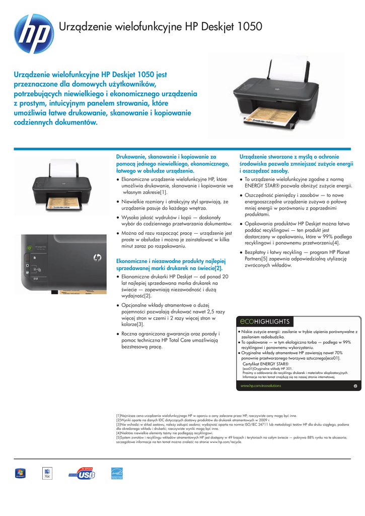 Urządzenie wielofunkcyjne HP Deskjet 1050 Urządzenie wielofunkcyjne HP Deskjet 1050 jest przeznaczone dla domowych użytkowników, potrzebujących niewielkiego i ekonomicznego urządzenia z prostym, intuicyjnym panelem strowania, które umożliwia łatwe drukowanie, skanowanie i kopiowanie codziennych dokumentów. Drukowanie, skanowanie i kopiowanie za pomocą jednego niewielkiego, ekonomicznego, łatwego w obsłudze urządzenia. Urządzenie stworzone z myślą o ochronie środowiska pozwala zmniejszać zużycie energii i oszczędzać zasoby. ● Ekonomiczne urządzenie wielofunkcyjne HP, które umożliwia drukowanie, skanowanie i kopiowanie we własnym zakresie[1]. ● To urządzenie wielofunkcyjne zgodne z normą ENERGY STAR® pozwala obniżyć zużycie energii. ● Niewielkie rozmiary i atrakcyjny styl sprawiają, że urządzenie pasuje do każdego wnętrza. ● Wysoka jakość wydruków i kopii — doskonały wybór do codziennego przetwarzania dokumentów. ● Można od razu rozpocząć pracę — urządzenie jest proste w obsłudze i można je zainstalować w kilka minut zaraz po rozpakowaniu. Ekonomiczne i niezawodne produkty najlepiej sprzedawanej marki drukarek na świecie[2]. ● Oszczędność pieniędzy i zasobów — to nowe energooszczędne urządzenie zużywa o połowę mniej energii w porównaniu z poprzednimi produktami. ● Opakowania produktów HP Deskjet można łatwo poddać recyklingowi — ten produkt jest dostarczany w opakowaniu, które w 99% podlega recyklingowi i ponownemu przetworzeniu[4]. ● Bezpłatny i łatwy recykling — program HP Planet Partners[5] zapewnia odpowiedzialną utylizację zwróconych wkładów. ● Ekonomiczne drukarki HP Deskjet — od ponad 20 lat najlepiej sprzedawana marka drukarek na świecie — zapewniają niezawodność i dużą wydajność[2]. ● Opcjonalne wkłady atramentowe o dużej pojemności pozwalają drukować nawet 2,5 razy więcej stron w czerni i 2 razy więcej stron w kolorze[3]. ● Roczna ograniczona gwarancja oraz porady i pomoc techniczna HP Total Care umożliwiają bezstresową pracę. ● Niskie zużycie energii: zasilanie w trybie uśpienia porównywalne z zasilaniem radiobudzika. ● To opakowanie — w tym ekologiczna torba — podlega w 99% recyklingowi i ponownemu wykorzystaniu. ● Oryginalne wkłady atramentowe HP zawierają nawet 70% ponownie przetworzonego tworzywa sztucznego[eco01]. Certyfikat ENERGY STAR® [eco01]Oryginalne wkłady HP 301. Prosimy o oddawanie do recyklingu drukarek i materiałów eksploatacyjnych. Informacje na ten temat znajdują się na naszej stronie internetowej. [1]Najniższa cena urządzenia wielofunkcyjnego HP w oparciu o ceny zalecane przez HP; rzeczywiste ceny mogą być inne. [2]Wyniki oparte na danych IDC dotyczących dostawy produktów do drukarek atramentowych w 2009 r. [3]Nie wchodzi w skład zestawu, należy zakupić osobno; wydajność oparta na normie ISO/IEC 24711 lub metodologii testów HP dla druku ciągłego, podana dla określonego wkładu i drukarki; rzeczywiste wyniki mogą być inne. [4]Niektóre niewielkie elementy taśmy nie podlegają recyklingowi. [5]System zwrotów i recyklingu wkładów atramentowych HP jest dostępny w 49 krajach i terytoriach na całym świecie — pokrywa 88% rynku na te akcesoria; szczegółowe informacje na ten temat można znaleźć na stronie www.hp.com/recycle. Urządzenie wielofunkcyjne HP Deskjet 1050 DANE TECHNICZNE Funkcje Technologia druku Liczba wkładów drukujących Standardowe podłączenia Możliwość pracy bezprzewodowej Standardowe języki drukarki Rozdzielczość druku Prędkość druku Możliwości drukarki Obciążalność Typ skanera/Technologia Tryby skanowania Rozdzielczość skanowania Głębia bitowa/Poziomy skali szarości Maksymalny format skanowania Rozdzielczość kopiowania Prędkość kopiowania Maksymalna liczba kopii Nośniki Obsługiwane formaty nośników Obsługiwana gramatura nośników Standardowy podajnik papieru Minimalne wymagania systemowe Zgodne systemy operacyjne Certyfikat ENERGY STAR® Drukowanie, kopiowanie, skanowanie Technologia termiczna HP Inkjet 2 (1 czarny, 1 trójkolorowy) 1 port Hi-Speed USB 2.0 Brak HP PCL 3 GUI W czerni (best): Do 600 dpi; Kolor (best): Rozdzielczość optymalizowana do 4800x1200 dpi przy druku w kolorze z komputera na wybranych papierach fotograficznych HP, rozdzielczość wejściowa 1200 dpi Czarny (ISO): Do 5,5 str./min; Kolorowy (ISO): Do 4 str./min Czarny (tryb roboczy): Do 16 str./min; Kolorowy (tryb roboczy): Do 12 str./min Druk bez marginesów: Brak Czujnik automatycznie rozpoznający rodzaj papieru: Brak Obsługiwane arkusze do próbnych wydruków fotograficznych: Brak Obsługiwane drukowanie bezpośrednie: Brak Miesięcznie, A4: Do 1000 stron Płaski; Czujnik Contact Image Sensor (CIS) Skanowanie z panelu przedniego Urządzenie: Do 1200 x 1200 dpi; Optyczny: Do 1200 dpi; Zwiększona rozdzielczość skanowania: Do 19200 dpi 24-bitowa; 256 216 x 297 mm Tekst i grafika w czerni: Zoptymalizowana rozdzielczość do 600 dpi, rozdzielczość wejściowa 300 dpi; Kolor: Zoptymalizowana rozdzielczość do 600 dpi, rozdzielczość wejściowa 300 dpi Czarny (tryb normalny): Do 4,5 str./min; Kolorowy (tryb normalny): Do 2,5 str./min Do 10 kopii Papier (do druku broszur, do drukarek atramentowych, zwykły), papier fotograficzny, koperty, etykiety, karty okolicznościowe, folie A4 (210x297 mm); A5 (148x210 mm); A6 (105x148 mm); B5 (176x250 mm); DL (110 x 220 mm); 130x180 mm; 100 x 150 mm A4: od 75 do 90 g/m²; Koperty HP: od 75 do 90 g/m²; Karty HP: do 200 g/m²; Papier fotograficzny HP (10x15 cm): do 280 g/m² Podajnik na 60 ark.; Odbiornik na 25 arkuszy; Opcja druku dwustronnego: Brak (nie obsługuje); Podajnik kopert: Brak; Standardowe podajniki papieru: 1; Pojemność podajników: Maksymalna pojemność podajników: Do 60 ark., Do 10 ark. naklejki, Do 15 ark. folie, Do 20 kart, Do 5 kopert Pojemność odbiorników: Maksymalna pojemność odbiorników: Do 25 a