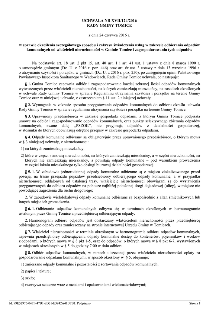 UCHWAŁA NR XVII/124/2016 RADY GMINY TOMICE z dnia 24 czerwca 2016 r. w sprawie określenia szczegółowego sposobu i zakresu świadczenia usług w zakresie odbierania odpadów komunalnych od właścicieli nieruchomości w Gminie Tomice i zagospodarowania tych odpadów Na podstawie art. 18 ust. 2 pkt 15, art. 40 ust. 1 i art. 41 ust. 1 ustawy z dnia 8 marca 1990 r. o samorządzie gminnym (Dz. U. z 2016 r. poz. 446) oraz art. 6r ust. 3 ustawy z dnia 13 września 1996 r. o utrzymaniu czystości i porządku w gminach (Dz. U. z 2016 r. poz. 250), po zasięgnięciu opinii Państwowego Powiatowego Inspektora Sanitarnego w Wadowicach, Rada Gminy Tomice uchwala, co następuje: § 1. Gmina Tomice zapewnia odbiór i zagospodarowanie każdej zebranej ilości odpadów komunalnych wytworzonych przez właścicieli nieruchomości, na których zamieszkują mieszkańcy, na zasadach określonych w uchwale Rady Gminy Tomice w sprawie Regulaminu utrzymania czystości i porządku na terenie Gminy Tomice oraz w niniejszej uchwale, z zastrzeżeniem § 11 ust. 2 niniejszej uchwały. § 2. Wymagania w zakresie sposobu przygotowania odpadów komunalnych do odbioru określa uchwała Rady Gminy Tomice w sprawie regulaminu utrzymania czystości i porządku na terenie Gminy Tomice. § 3. Uprawniony przedsiębiorca w zakresie gospodarki odpadami, z którym Gmina Tomice podpisała umowę na odbiór i zagospodarowanie odpadów komunalnych, oraz punkty selektywnego zbierania odpadów komunalnych, zwane dalej „PSZOK”, nie przyjmują odpadów z działalności gospodarczej, w stosunku do których obowiązują odrębne przepisy w zakresie gospodarki odpadami. § 4. Odpady komunalne odbierane są obligatoryjnie przez uprawnionego przedsiębiorcę, o którym mowa w § 3 niniejszej uchwały, z nieruchomości: 1) na których zamieszkują mieszkańcy; 2) które w części stanowią nieruchomości, na których zamieszkują mieszkańcy, a w części nieruchomości, na których nie zamieszkują mieszkańcy, a powstają odpady komunalne – pod warunkiem prowadzenia w części lokalu mieszkalnego tylko obsługi biurowej działalności gospodarczej. § 5. 1. W zabudowie jednorodzinnej odpady komunalne odbierane są z miejsca zlokalizowanego przed posesją, na trasie przejazdu pojazdów przedsiębiorcy odbierającego odpady komunalne, a w przypadku nieruchomości oddalonych od ustalonej trasy, właściciele nieruchomości obowiązani są do wystawienia przygotowanych do odbioru odpadów na pobocze najbliżej położonej drogi dojazdowej (ulicy), w miejsce nie powodujące zagrożenia dla ruchu drogowego; 2. W zabudowie wielolokalowej odpady komunalne odbierane są bezpośrednio z altan śmietnikowych lub innych miejsc ich gromadzenia. § 6. 1. Odbieranie odpadów komunalnych odbywa się w terminach określonych w harmonogramie ustalonym przez Gminę Tomice z przedsiębiorcą odbierającym odpady. 2. Harmonogram odbioru odpadów jest dostarczany właścicielom nieruchomości przez przedsiębiorcę odbierającego odpady oraz zamieszczany na stronie internetowej Urzędu Gminy w Tomicach. § 7. Właściciel nieruchomości w terminie określonym w harmonogramie odbioru odpadów komunalnych, zapewnia przedsiębiorcy odbierającemu odpady komunalne dostęp do kontenerów, pojemników i worków z odpadami, o których mowa w § 8 pkt 1-5, oraz do odpadów, o których mowa w § 8 pkt 6-7, wystawionych w miejscach określonych w § 5 do godziny 7:00 w dniu odbioru. § 8. Odbiór odpadów komunalnych, w ramach uiszczonej przez właściciela nieruchomości opłaty za gospodarowanie odpadami komunalnymi, w sposób określony w § 5, obejmuje: 1) zmieszane odpady komunalne i pozostałości z sortowania odpadów komunalnych; 2) papier i tekturę; 3) szkło; 4) tworzywa sztuczne wraz z metalami i opakowaniami wielomateriałowymi; Id: 99E52976-04FF-47B1-8D31-E3942A41BFB1. Podpisany Strona 1 5) popiół; 6) zużyty sprzęt elektryczny i elektroniczny; 7) meble i inne odpady wielkogabarytowe. § 9. Przedsiębiorca, o którym mowa w § 3 niniejszej uchwały, jest obowiązany do dostarczenia właścicielom nieruchomości worków do selektywnego zbierania odpadów komunalnych, o których mowa w § 8 pkt 2-5, w liczbie gwarantującej zaspokojenie potrzeb w zakresie selektywnej zbiórki odpadów. § 10. Odbiór odpadów komunalnych, o których mowa w § 8, odbywa się z następującą częstotliwością: 1) zmieszane odpady komunalne i pozostałości z sortowania odpadów komunalnych – nie rzadziej niż raz na miesiąc, z tym że od maja do września nie rzadziej niż dwa razy na miesiąc; 2) selektywnie zebrane odpady komunalne, wymienione w pkt 2-5 – nie rzadziej niż raz na miesiąc; 3) zużyty sprzęt elektryczny i elektroniczny – nie rzadziej niż raz na rok; 4) meble i inne odpady wielkogabarytowe – nie rzadziej niż raz na rok. § 11. 1. W ramach uiszczonej przez właściciela nieruchomości opłaty za gospodarowanie odpadami komunalnymi w PSZOK przyjmowane są w każdej ilości, z zastrzeżeniem limitów określonych w ust. 2, dostarczone we własnym zakresie przez właścicieli nieruchomości, zebrane w sposób selektywny następujące rodzaje odpadów komunalnych: 1) papier i tektura; 2) szkło; 3) tworzywa sztuczne wraz metalami i opakowaniami wielomateriałowymi; 4) przeterminowane leki; 5) chemikalia; 6) zużyte opony; 7) zużyte baterie i akumulatory; 8) zużyty sprzęt elektryczny i elektroniczny; 9) meble i inne odpady wielkogabarytowe. 2. Wprowadza się ograniczenie ilości przyjmowanych przez PSZOK od właścicieli nieruchomości, w zamian za pobraną opłatę za gospodarowanie odpadami komunalnymi: 1) ograniczenie ilości przekazywanych odpadów budowlanych i rozbiórkowych, stanowiących odpady komunalne, do 0,5 Mg na rok z danej nieruchomości; 2) ograniczenie ilości przekazywanych odpadów zielonych do 5 worków o pojemności 120 l miesiąca z danej nieruchomości. w ciągu 3. Przed przekazaniem odpadów do PSZOK właściciele