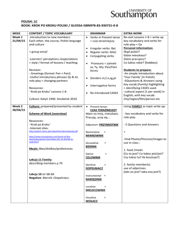 POLISH: 1C BOOK: KROK PO KROKU POLSKI / GLOSSA ISBN978-83-930731-0-8 WEEK Week 1 21/04/15 CONTENT / TOPIC VOCABULARY -Introduction to new members: Each other, the course, Polish language and culture + group email -Learners’ perceptions /expectations + style / format of lessons / teaching. Revision: - Greetings [formal: Pan + Pani] -Useful introductory phrases Qs & As role-play + changing partners Resources: -‘Krok po Kroku’ Lessons 1-8 GRAMMAR Verbs in Present tense = czas teraźniejszy Irregular verbs: Być Regular verbs: Mieć Conjugating verbs Pronouns = zaimek: Ja, Ty, Wy; Pan/Pani forms Genders m,f,n,sg,pl Interrogative forms Re-introduced CASES Culture: Katyń 1940. Smoleńsk 2010 Week 2 28/04/15 EXTRA WORK Re-visit Lessons 1-8 + write up key vocabulary and verbs for role-play + Qs Personal information: Skąd jesteś? Gdzie mieszkasz? Gdzie pracujesz? Co lubisz robić? [hobbies] Students to prepare: -An simple introduction about ‘Your Family’ [in Polish] -5Questions & Answers using key vocab [Family] highlighting + identifying CASES used. -cultural aspect [1 per week] in English, with key vocab: City/region/film/person etc Present tense: CZAS TERAŹNIEJSZY Mam na imię, mieszkam, Pracuję, uczę się... Using FAMILY as topic write up: Resources: -‘Krok po Kroku’ -Internet sites: Adjective= PRZYMIOTNIK - 5 Questions and Answers http://polish.slavic.pitt.edu/other/phrasebook.pdf Nominative Culture: prepared/presented by student Scheme of Work [overview] http://www.transparent.com/word-of-theday/today/polish.html?date=02-10-2015&-toread.html Meals: likes/dislikes/preferences = + = -Find Photos/Pictures/Images to use in class : MIANOWNIK Accusative BIERNIK Dative Lekcja 11 Family: describing members p 70 = CELOWNIK Genitive = DOPEŁNIACZ Lekcja 10 str 68-69 Negative: Biernik >Dopelniacz - key vocabulary and verbs for role-play Instrumental = NARZĘDNIK = MIEJSCOWNIK Locative Vocative WOŁACZ = 1. food /meals [Co to jest? Co lubisz jeść/pić? Czy lubisz to? Ile kosztuje?] 2. family member(s) use of adjectives [Jaki on jest? Jaka ona jest?] Week 3 05/05/15 Culture: prepared/presented by student Noun = RZECZOWNIK Adjective= PRZYMIOTNIK Lekcja 11 Role-play: Model Polskiej Rodziny - Str 72+77 + Role-play: Rano czy wieczorem? Str 74 Kiedy? Str 75 Jak często? Str 76 http://mowicpopolsku.com/polishvocabulary-phrases/important-polish-verbs/ http://www.tastingpoland.com/food/list_of _polish_food.html Week 4 [no lesson on 12th May] Genders: -RODZAJ MĘSKI (M) -RODZAJ ŻEŃSKI (F) -RODZAJ NIJAKI (N) -LICZBA POJEDYNCZA (SG) -LICZBA MNOGA (PL) - key vocabulary and verbs for role-play p 72+77 - 5 Questions and Answers p 74,75,76 -Family Tree p 77 Transfer of tenses English gmr to Polish Overview of time line Present, Future, Past. CZAS TERAŹNIEJSZY, PRZYSZŁY, PRZESZŁY Future tense [dates] Culture: prepared/presented by student Lekcja 12 Using FAMILY as topic write up: Accurate application of CASES 19/05/15 Role-play: Co Robisz? Mam ochotę pójść… O której godzinie? Str 82, 83 Topic related vocabulary [genders] -Role-play: Q+A Extended sentences Using Days of the week and times write up: -key vocabulary and verbs for role-play p79 - 5 Questions and Answers p 80, 81 Key verbs [conjugated] Tenses Week 5 26/05/15 Culture: prepared/presented by student Accurate application of CASES Lesson 13 ‘Krok po Kroku’ Topic related vocabulary [genders] Topics from previous chapters using PAST TENSE Extended sentences -Role-play: Q+A Key verbs [conjugated] PAST Tense Using past topics write up: -rule for past tense p 85, p 86 -key verbs in PAST TENSE [to be, to have, to do, to eat, to drink, to go] - key vocabulary and verbs for role-play p 87 - 5 Questions and Answers p 87 ex 7 -questions using p 87 ex 9 Week 6 [extra lesson Thursday evening as catch-up] 28/05/15 Culture: prepared/presented by student Accurate application of CASES Lesson 13 ‘Krok po Kroku’ Topic related Topics from previous chapters using vocabulary PAST TENSE [genders] Using past topics write up: - 5 Questions and Answers p 87 ex 7 in present future and past tense Extended sentences -Role-play: Q+A using both present + future + past tense -questions using p 87 ex 9 in present, future and past tense Key verbs [conjugated] PRESENT + FUTURE + PAST Tenses Week 7 02/06/15 Culture: prepared/presented by student Individual Support [GMR] Lesson 13 ‘Krok po Kroku’ Complete verbs in tenses using PAST TENSE p 88 - 91 Revision Complete Ppoint [key words only on 2 slides max. + photos slides] presentations on Culture [each ss has a different Topic] in Polish. -Role-play: Q+A using both present + future + past tense Introducing Ch 14: iść+chodzić; jechać+jeździć PRESENT + FUTURE + PAST Tenses http://en.wikibooks.org/wiki/Polish/Verbs Week 8 Cultural Topic [no lesson on 9th June] Ppoint prepared by students in POLISH Perfective / Imperfective verbs ss Ppoint Update lists of vocab Update lists of verbs Update ex CASES 16/06/15 Hand book: Krok po Kroku –Glossa Polish Language School + CD Student’s exercise book: Zeszyt Ćwiczeń Krok po Kroku –Glossa Polish Language School + CD Internet sites: http://polish.slavic.pitt.edu/other/phrasebook.pdf http://www.transparent.com/word-of-the-day/today/polish.html?date=02-10-2015&-to-read.html http://mowicpopolsku.com/polish-vocabulary-phrases/important-polish-verbs/ http://www.tastingpoland.com/food/list_of_polish_food.html http://en.wikibooks.org/wiki/Polish/Verbs Barbara Frankowska 21.04.2015