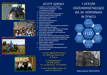 ATUTY SZKOŁY OBSERWATORIUM WIGILIA SZKOLNA OBÓZ NAUKOWY ZAPRASZAMY DO I LO współpraca z Uniwersytetem Śląskim i Uniwersytetem Jagiellońskim – zajęcia z pracownikami naukowymi zdawalność matury: 100% matematyczno-językowe obozy naukowe międzynarodowe wymiany młodzieży udział szkoły w programach UE koła zainteresowań obserwatorium astronomiczne pracownie przedmiotowe tablice interaktywne udział w projekcie edukacji medialnej „KinoSzkoła” porady psychologa i pedagoga nauka języków obcych: angielskiego, francuskiego, hiszpańskiego, niemieckiego, rosyjskiego lekcje języka angielskiego z native speakerem dziennik elektroniczny Dzień Liczby π, Dzień Francuski, Dzień Chemii, Dzień Sportu, Dzień Ziemi, Szkolny Klub Europejski, Święto Muzyki, Święto Poezji Europejskiej, Szkolny Klub Szachowy, Klub Tenisa Stołowego gazetka szkolna „GłosKa” udział młodzieży w akcjach charytatywnych i wolontariat licealistów Stowarzyszenie Przyjaciół i Absolwentów Liceum Ogólnokształcącego I LICEUM OGÓLNOKSZTAŁCĄCE IM. M. KOPERNIKA W ŻYWCU sięgasz wyżej rozwijasz skrzydła odkrywasz siebie I LO realizujesz swoje pomysły planujesz swoją przyszłość uczysz się w nowoczesny sposób I Li c e u m O gó l n o k s z t a ł c ą c e i m . Mi ko ł a j a K o p e r n i ka w Ż y wc u u l . S ł o wa c ki e go 2 3 4- 3 00 Ż y wi e c t e l . 33 86 1 21 13 , 3 3 47 5 46 4 4 e - m a i l : b i u r o @ l o - z ywi e c .p l w ww .l o - z y wi e c .p l Rekrutacja 2014/2015 Klasa A – humanistyczna Oferta edukacyjna Klasa Przedmioty rozszerzone Przedmioty uzupełniające Przedmioty punktowane A humanistyczna j. polski, historia, j. angielski przyroda, edukacja filmowa j. polski, historia, WOS, j. obcy PRZEDMIOTY ROZSZERZONE: język polski (kl. I – 5 godz., kl. II – 9 godz., kl. III – 8 godz.) historia (kl. I – 2 godz., kl. II –5 godz., kl. III – 4 godz.) język angielski (kl. I – 3 godz., kl. II – 6 godz., kl. III – 6 godz.) PRZEDMIOT UZUPEŁNIAJĄCY: edukacja filmowa ATUTY KLASY: objęta patronatem naukowym Instytutu Filologii Polskiej Uniwersytetu Jagiellońskiego, zajęcia edukacyjne z pracownikami naukowymi, systematyczne uczestnictwo w różnego rodzaju wydarzeniach kulturalnych PRZYGOTOWUJE do studiów filologicznych, na kierunki: historia, kulturoznawstwo, politologia, pedagogika, na inne kierunki humanistyczne. Klasa B – uniwersytecka matematyczna B uniwersytecka matematyczna matematyka, j. angielski, (wybór: fizyka/geografia) historia i społeczeństwo j. polski, matematyka, fizyka, j. obcy C biologicznochemiczna biologia, chemia historia i społeczeństwo, j. angielski w medycynie j. polski, biologia, chemia, j. obcy D matematycznoprzyrodnicza matematyka, biologia, chemia historia i społeczeństwo j. polski, matematyka, biologia, chemia E językowa j. angielski, geografia (wybór: j. niemiecki/ j. hiszpański) historia i społeczeństwo, kultura języka j. polski, matematyka, geografia, j. obcy F prawna WOS, j. angielski, (wybór: j. polski, historia) przyroda, edukacja prawna j. polski, historia, WOS, j. obcy G matematycznogeograficzna matematyka, geografia, j. angielski historia i społeczeństwo, ekonomia w praktyce j. polski, matematyka, geografia, j. obcy H dziennikarskomedialna j. polski, j. angielski, (wybór: geografia/WOS) historia i społeczeństwo/ przyroda, warsztaty dziennikarskie j. polski, geografia, WOS, j. obcy J matematycznoinformatyczna matematyka, informatyka, j. angielski, geografia historia i społeczeństwo j. polski, matematyka, geografia, j. obcy PRZEDMIOTY ROZSZERZONE: matematyka (kl. I – 4 godz., kl. II – 9 godz., kl. III – 9 godz.) język angielski (kl. I – 3 godz., kl. II – 6 godz., kl. III – 6 godz.) do wyboru: fizyka lub geografia (kl. I – 1 godz., kl. II – 4 godz., kl. III – 4 godz.) ATUTY KLASY: objęta patronatem naukowym Instytutu Matematyki Uniwersytetu Śląskiego, dodatkowy przedmiot w klasie: Seminarium z rozwiązywania zadań matematycznych - zajęcia edukacyjne z matematyki z regularnym udziałem pracowników naukowych UŚ, w programie cyklu kształcenia ciekawa forma uczenia się i nauczania: kilkudniowy sponsorowany naukowy obóz matematyczno–językowy PRZYGOTOWUJE do studiów na uniwersyteckich kierunkach matematycznych, politechnicznych, ekonomicznych i innych. Klasa C – biologiczno-chemiczna PRZEDMIOTY ROZSZERZONE: biologia (kl. I – 1 godz., kl. II – 7 godz., kl. III – 6 godz.) chemia (kl. I – 1 godz., kl. II – 6 godz., kl. III – 6 godz.) PRZEDMIOT UZUPEŁNIAJĄCY: język angielski w medycynie ATUTY KLASY: zajęcia laboratoryjne z chemii w Pałacu Młodzieży w Katowicach oraz na Wydziale Chemii Uniwersytetu Jagiellońskiego w Krakowie, lekcje chemii i biologii prowadzone z częstym wykorzystaniem tablic interaktywnych i metod doświadczalnych, możliwość konfrontacji planów dalszego kształcenia uczniów i wyboru kierunków studiów z rzeczywistymi predyspozycjami zawodowymi licealistów – uczestnictwo młodzieży w specjalistycznych wykładach dotyczących problemów medycznych PRZYGOTOWUJE do studiów na kierunkach: biologia, chemia, medycyna, stomatologia, farmacja, weterynaria, ochrona środowiska, rehabilitacja, biotechnologia, kosmetologia, fizjoterapia, ratownictwo medyczne oraz innych medycznych, farmaceutycznych i przyrodniczych. Klasa D – matematyczno-przyrodnicza PRZEDMIOTY ROZSZERZONE: matematyka (kl. I – 4 godz., kl. II – 6 godz., kl. III – 6 godz.) biologia (kl. I – 1 godz., kl. II – 5 godz., kl. III – 5 godz.) chemia (kl. I – 1 godz., kl. II .– 5 godz., kl. III – 5 godz.) ATUTY KLASY: zajęcia laboratoryjne z chemii w Pałacu Młodzieży w Katowicach oraz na Wydziale Chemii Uniwersytetu Jagiellońskiego, lekcje chemii i biologii prowadzone z częstym wykorzystaniem tablic interaktywnych i metod doświadczalnych PRZYGOTOWUJE do studiów na kierunkach: matematyka, biologia, chemia, medycyna, stomatologia, farmacja, wete