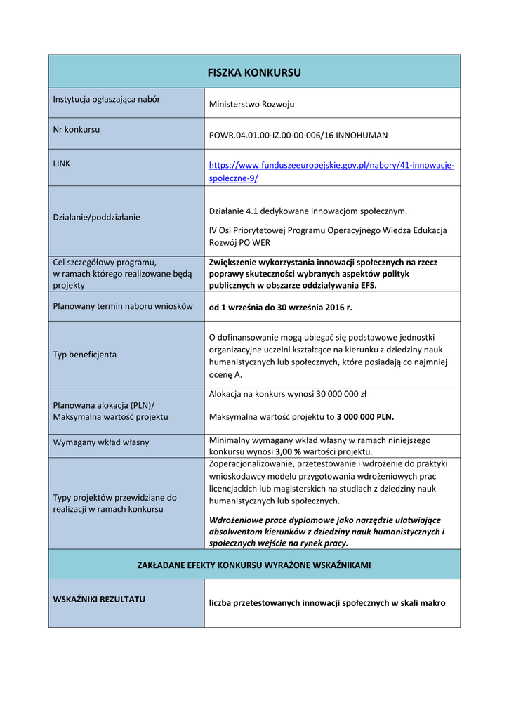 FISZKA KONKURSU Instytucja ogłaszająca nabór Nr konkursu Ministerstwo Rozwoju POWR.04.01.00-IZ.00-00-006/16 INNOHUMAN LINK https://www.funduszeeuropejskie.gov.pl/nabory/41-innowacjespoleczne-9/ Działanie/poddziałanie Działanie 4.1 dedykowane innowacjom społecznym. IV Osi Priorytetowej Programu Operacyjnego Wiedza Edukacja Rozwój PO WER Cel szczegółowy programu, w ramach którego realizowane będą projekty Zwiększenie wykorzystania innowacji społecznych na rzecz poprawy skuteczności wybranych aspektów polityk publicznych w obszarze oddziaływania EFS. Planowany termin naboru wniosków od 1 września do 30 września 2016 r. Typ beneficjenta O dofinansowanie mogą ubiegać się podstawowe jednostki organizacyjne uczelni kształcące na kierunku z dziedziny nauk humanistycznych lub społecznych, które posiadają co najmniej ocenę A. Alokacja na konkurs wynosi 30 000 000 zł Planowana alokacja (PLN)/ Maksymalna wartość projektu Wymagany wkład własny Typy projektów przewidziane do realizacji w ramach konkursu Maksymalna wartość projektu to 3 000 000 PLN. Minimalny wymagany wkład własny w ramach niniejszego konkursu wynosi 3,00 % wartości projektu. Zoperacjonalizowanie, przetestowanie i wdrożenie do praktyki wnioskodawcy modelu przygotowania wdrożeniowych prac licencjackich lub magisterskich na studiach z dziedziny nauk humanistycznych lub społecznych. Wdrożeniowe prace dyplomowe jako narzędzie ułatwiające absolwentom kierunków z dziedziny nauk humanistycznych i społecznych wejście na rynek pracy. ZAKŁADANE EFEKTY KONKURSU WYRAŻONE WSKAŹNIKAMI WSKAŹNIKI REZULTATU liczba przetestowanych innowacji społecznych w skali makro WSKAŹNIKI PRODUKTU liczba innowacji przyjętych do dofinansowania w skali makro SZCZEGÓŁOWE KRYTERIA WYBORU PROJEKTÓW Projekt dotyczy modelu przygotowania wdrożeniowych prac licencjackich lub magisterskich na studiach z dziedziny nauk humanistycznych lub społecznych - jego zoperacjonalizowania, przetestowania i włączenia do praktyki wnioskodawcy. Wnioskodawca lub partner mogą złożyć nie więcej niż 1 wniosek o dofinansowanie projektu, tj. można wystąpić jako lider lub partner projektu tylko w 1 wniosku zgłoszonym do konkursu. Okres realizacji projektu wynosi maksymalnie 30 miesięcy, przy czym pierwszy i trzeci etap nie może przekraczać 2 miesięcy każdy. KRYTERIA DOSTĘPU KRYTERIA HORYZONTALNE Grupą docelową odbiorców w projekcie są studenci i studentki kierunków z dziedziny nauk humanistycznych lub społecznych, którzy są zainteresowani napisaniem wdrożeniowej pracy licencjackiej lub magisterskiej. Wnioskodawca musi przewidzieć udział minimum 30 osób na etapie testowania. Wdrożeniowe prace dyplomowe studentów i studentek kierunków z dziedziny nauk humanistycznych lub społecznych są przygotowywane we współpracy z pracodawcą/pracodawcami lub podstawowymi jednostkami organizacyjnymi uczelni kształcącymi w obszarze nauk ścisłych, technicznych lub przyrodniczych. Wnioskodawca określa odsetek studentów i studentek, którzy po obronie pracy licencjackiej lub magisterskiej zostaną zatrudnieni w wyniku napisania wdrożeniowej pracy licencjackiej lub magisterskiej, w tym u pracodawcy, we współpracy z którym przygotowywana była praca. W projekcie przewidziane są 3 zasadnicze etapy jego realizacji: etap 1: operacjonalizacja modelu przygotowania wdrożeniowych prac licencjackich lub magisterskich zgodnie z założeniami wskazanymi we wniosku o dofinansowanie, etap 2: przetestowanie modelu, w tym wybór studentów zainteresowanych przygotowaniem dyplomowych prac wdrożeniowych oraz ich wsparcie w tym procesie, etap 3: włączenie do praktyki wnioskodawcy przetestowanego modelu. Czy projekt jest zgodny z prawodawstwem krajowym w zakresie odnoszącym się do sposobu realizacji i zakresu projektu? Czy projekt jest zgodny z zasadą równości szans kobiet i mężczyzn (na podstawie standardu minimum)? Czy projekt jest zgodny z pozostałymi właściwymi zasadami unijnymi (w tym zasadą równości szans i niedyskryminacji, w tym dostępności dla osób z niepełnosprawnościami i zasadą zrównoważonego rozwoju) oraz z prawodawstwem unijnym?