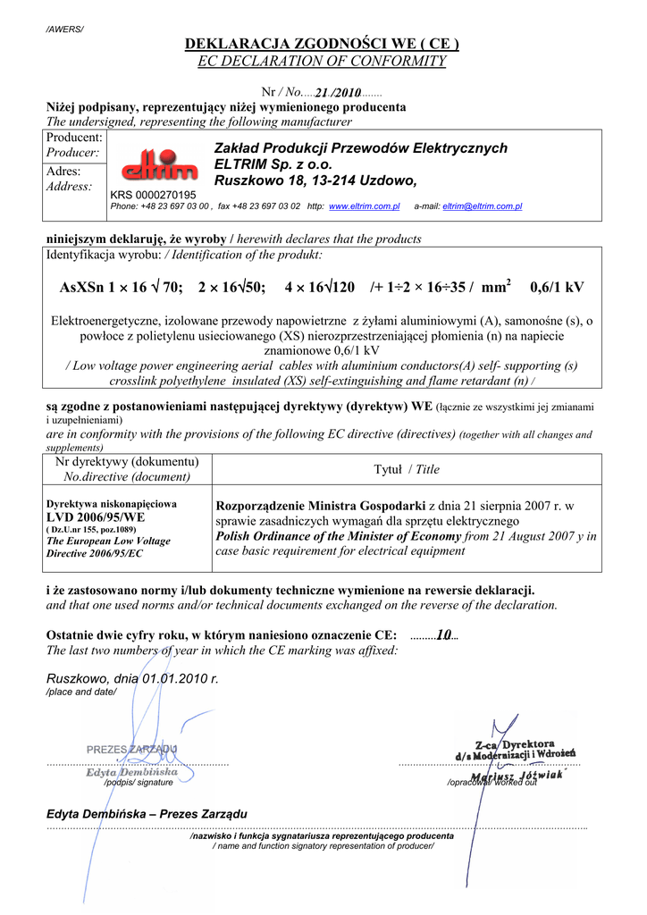 /AWERS/ DEKLARACJA ZGODNOŚCI WE ( CE ) EC DECLARATION OF CONFORMITY Nr / No.……………………… 21 /2010 Niżej podpisany, reprezentujący niżej wymienionego producenta The undersigned, representing the following manufacturer Producent: Zakład Produkcji Przewodów Elektrycznych Producer: ELTRIM Sp. z o.o. Adres: Ruszkowo 18, 13-214 Uzdowo, Address: KRS 0000270195 Phone: +48 23 697 03 00 , fax +48 23 697 03 02 http: www.eltrim.com.pl a-mail: [email protected] niniejszym deklaruję, że wyroby / herewith declares that the products Identyfikacja wyrobu: / Identification of the produkt: AsXSn 1 × 16 ÷ 70; 2 × 16÷ ÷50; 4 × 16÷ ÷120 /+ 1÷2 × 16÷35 / mm2 0,6/1 kV Elektroenergetyczne, izolowane przewody napowietrzne z żyłami aluminiowymi (A), samonośne (s), o powłoce z polietylenu usieciowanego (XS) nierozprzestrzeniającej płomienia (n) na napiecie znamionowe 0,6/1 kV / Low voltage power engineering aerial cables with aluminium conductors(A) self- supporting (s) crosslink polyethylene insulated (XS) self-extinguishing and flame retardant (n) / są zgodne z postanowieniami następującej dyrektywy (dyrektyw) WE (łącznie ze wszystkimi jej zmianami i uzupełnieniami) are in conformity with the provisions of the following EC directive (directives) (together with all changes and supplements) Nr dyrektywy (dokumentu) No.directive (document) Dyrektywa niskonapięciowa LVD 2006/95/WE ( Dz.U.nr 155, poz.1089) The European Low Voltage Directive 2006/95/EC Tytuł / Title Rozporządzenie Ministra Gospodarki z dnia 21 sierpnia 2007 r. w sprawie zasadniczych wymagań dla sprzętu elektrycznego Polish Ordinance of the Minister of Economy from 21 August 2007 y in case basic requirement for electrical equipment i że zastosowano normy i/lub dokumenty techniczne wymienione na rewersie deklaracji. and that one used norms and/or technical documents exchanged on the reverse of the declaration. Ostatnie dwie cyfry roku, w którym naniesiono oznaczenie CE: The last two numbers of year in which the CE marking was affixed: 10 …………….. Ruszkowo, dnia 01.01.2010 r. /place and date/ ……………………………………………………… /podpis/ signature ……………………………………………………… /opracował/ worked out Edyta Dembińska – Prezes Zarządu ……………………………………………………………………………………………………………………………………………………………………. /nazwisko i funkcja sygnatariusza reprezentującego producenta / name and function signatory representation of producer/ /REWERS/ DEKLARACJA ZGODNOŚCI WE EC DECLARATION OF CONFORMITY Nr ……………………… 21/2010 Normy i/lub dokumentacje techniczne, lub ich części, zastosowane do wyrobu, którego dotyczy niniejsza deklaracja zgodności: Standards and/or technical documentation, or their parts, used to product whose refers the present declaration of conformity: - normy zharmonizowane: / Harmonized standards: / Numer Wydanie Tytuł / Title / / Number / / Edition / PN-HD 626 S1:2002 / HD 626 S1:1996 [IDT], HD 626 S1:1996/A1:1997 [IDT] / Część /Unit/ Energetyczne kable napowietrzne na napięcie znamionowe Uo/U(Um): 0, 6/1 (1, 2) kV / Overhead distribution cables of rated voltage Uo/U(Um): 0,6/1 ((1,2) kV / - inne normy i/lub dokumentacje techniczne: / other standards and/or technical documentation: / Numer Wydanie Część Tytuł / Title / / Number / / Edition / /Unit/ PN-EN ISO 9001 / EN ISO 9001:2008/ 2009 ZN-3-2008 PN-EN 60228 2007 / IEC 60228:2004/ PN-EN 60332-1-2 Systemy zarządzania jakością / Quality management systems – Requirements/ 2005 Elektroenergetyczne, izolowane przewody napowietrzne na napięcie znamionowe 0,6/1 kV – norma zakładowa / Low voltage power engineering aerial insulated cables of rated voltage 0,6/1 kV – internal standard / Żyły przewodów i kabli /Conductors of insulated cables/ Badania palności kabli i przewodów elektrycznych oraz światłowodowych Część 1-2: Sprawdzanie odporności pojedynczego izolowanego przewodu lub kabla na pionowe rozprzestrzenianie się płomienia - Metoda badania palnikiem z płomieniem mieszankowym 1 kW / EN 60332-1-2:2004 Tests on electric and optical fibre cables under fire conditions -Part 1-2: Test for vertical flame propagation for a single insulated wire or cable - Procedure for 1 kW pre-mixed flame / - inne rozwiązania techniczne, szczegóły, które zostały włączone do dokumentacji technicznej - other technical solutions, details, which get included to technical documentation Inne dokumenty lub informacje wymagane przez dyrektywę(-y) WE: Other documents or informations demand by EC directives: - Certyfikat Systemu Zarządzania Jakością wg PN-EN ISO 9001:2009, nr certyfikatu 325/5/2009, wydany przez Polskie Centrum Badań i Certyfikacji S.A. - PCBC / the certificate Quality Management Systems according to EN ISO 9001:2008, No. of certificate325/5/2009 signum by Polish Center of Research and Certification – PCBC/